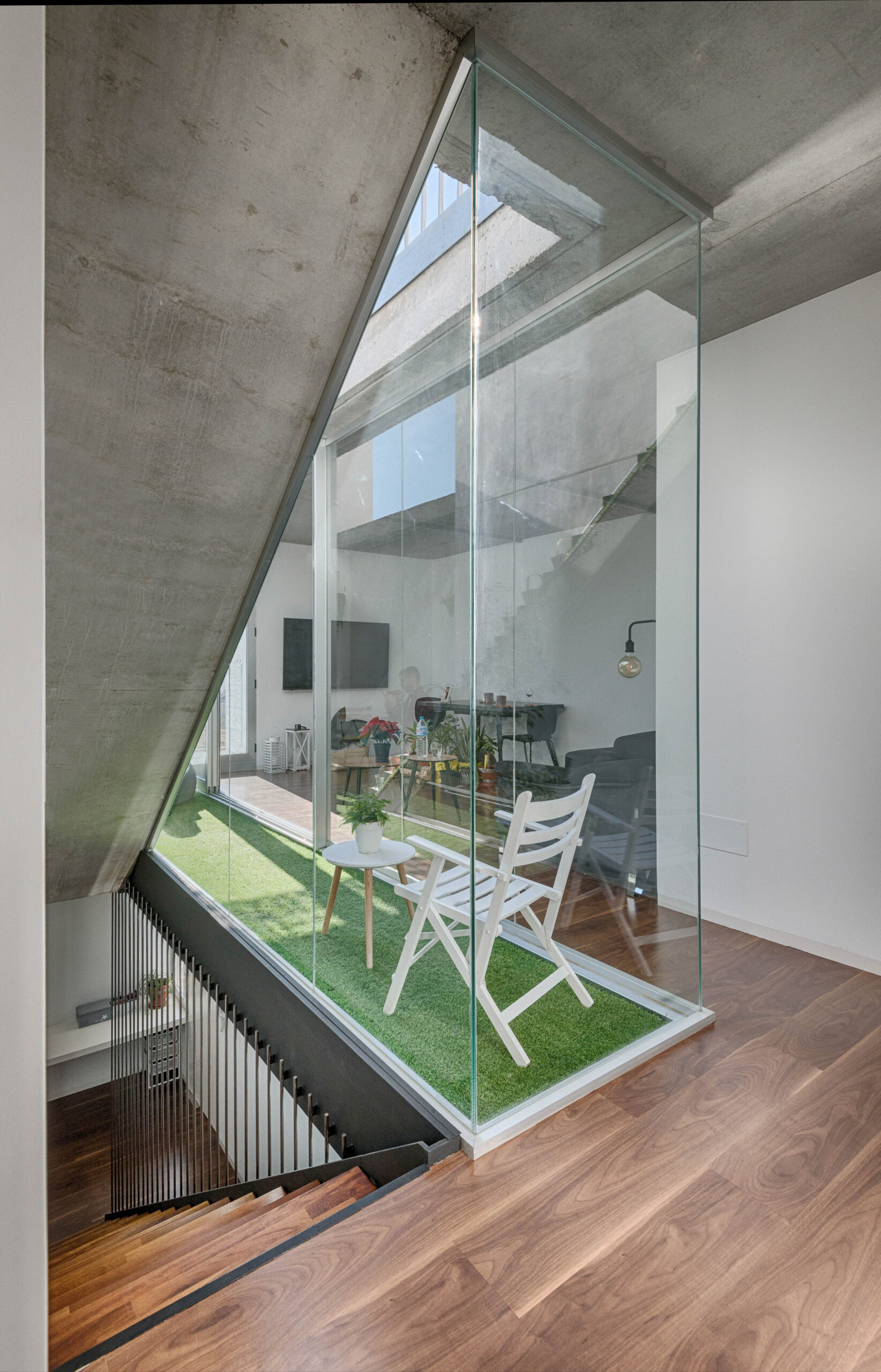La vivienda invierte la distribución convencional para maximizar la luminosidad. La planta superior alberga la zona de día en 32 m² optimizados, abriéndose a una terraza soleada y un pequeño jardín. La arquitectura capta la luz natural por el este y el sur, generando espacios diáfanos que fomentan una relación confortable y fluida con el exterior.