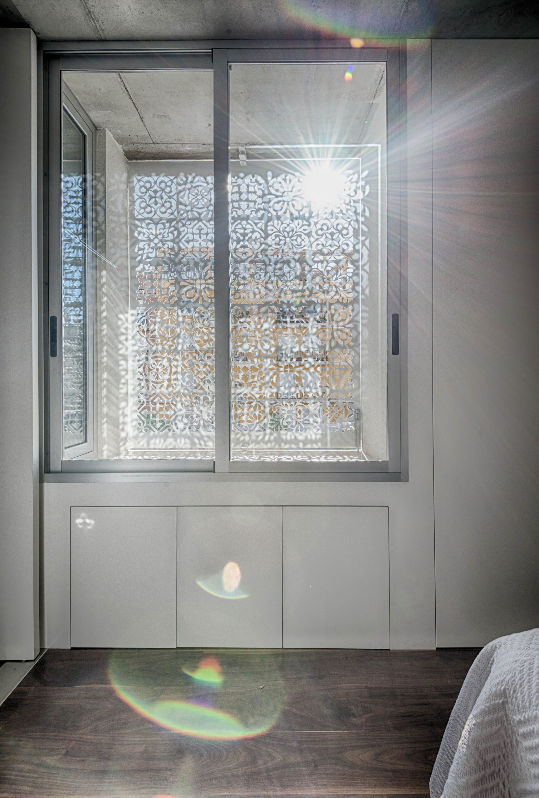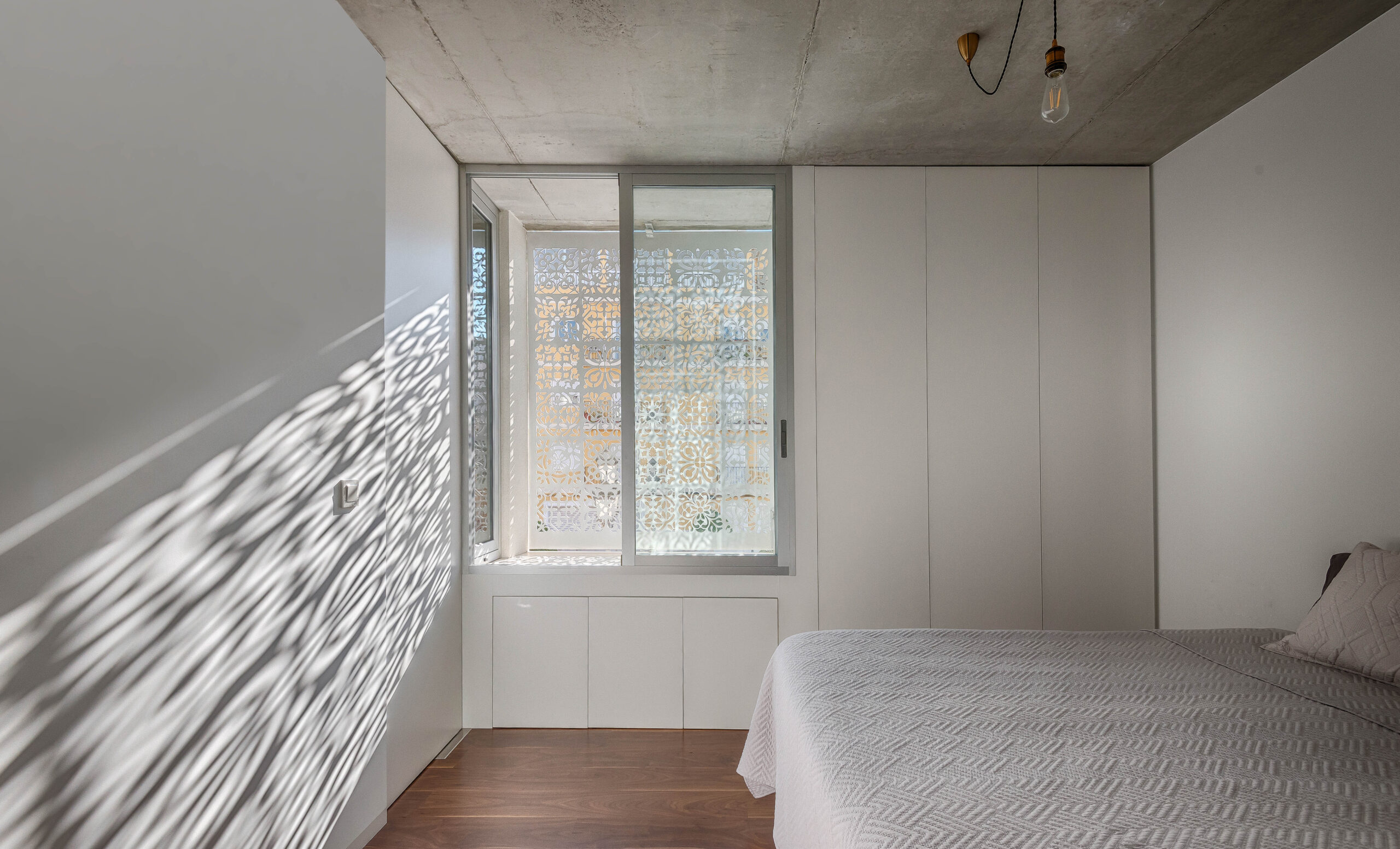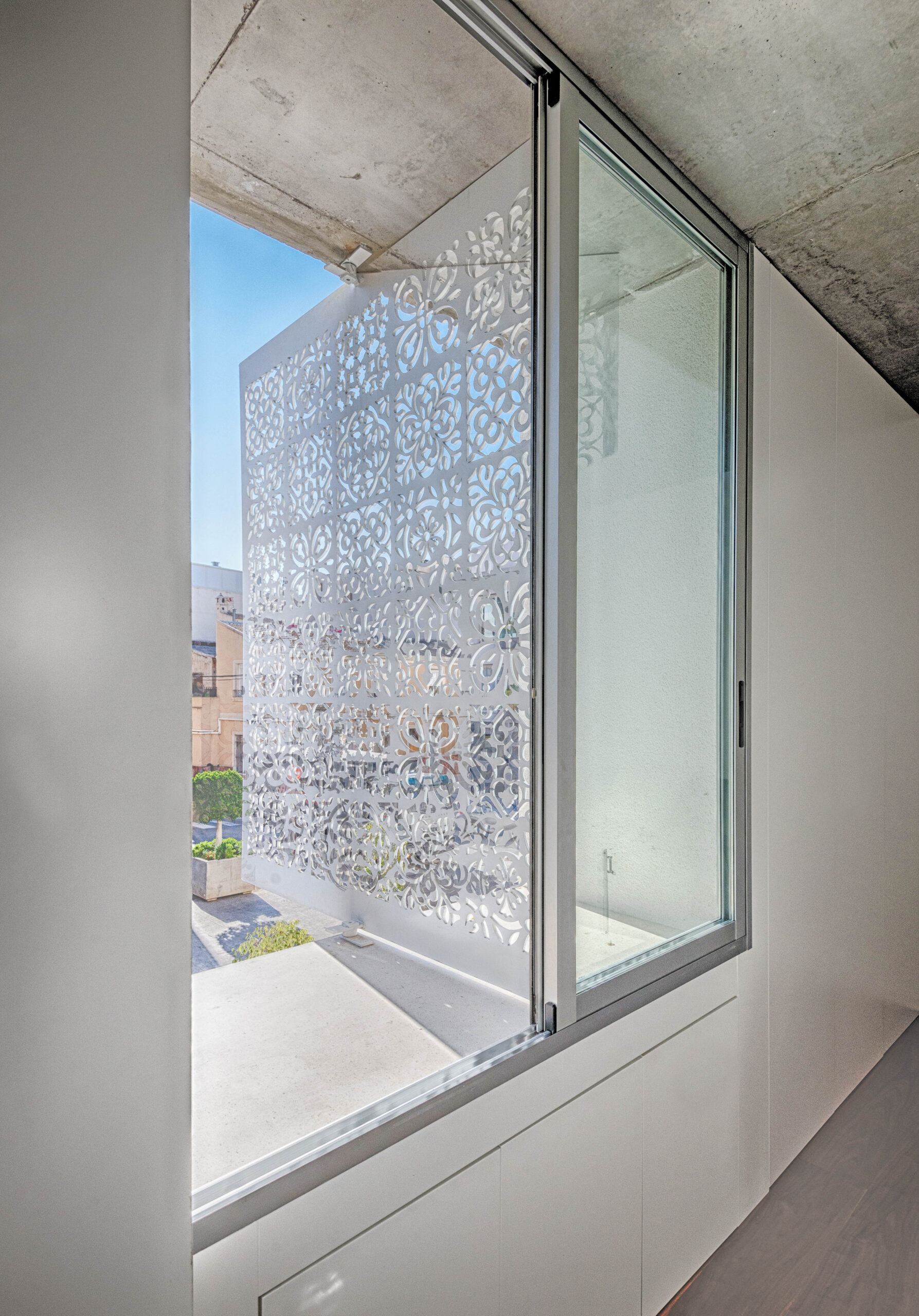 La fachada actúa como un mashrabiya moderno: un chapón de acero de 1 cm, cortado por control numérico con motivos ornamentales tradicionales. Esta piel metálica filtra la luz solar y permite la ventilación natural en los dormitorios de la planta intermedia. El sistema garantiza una intimidad controlada, tamizando la radiación y proyectando texturas lumínicas en el interior.