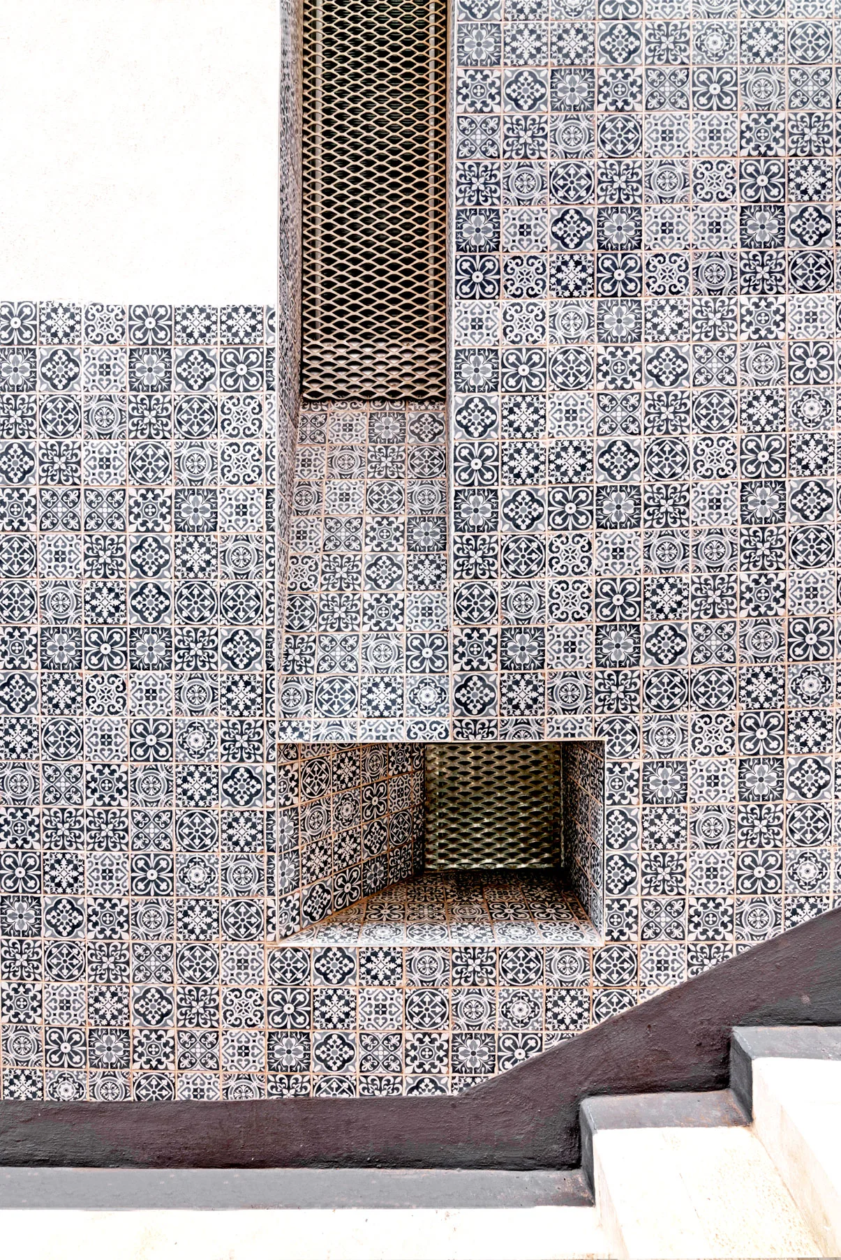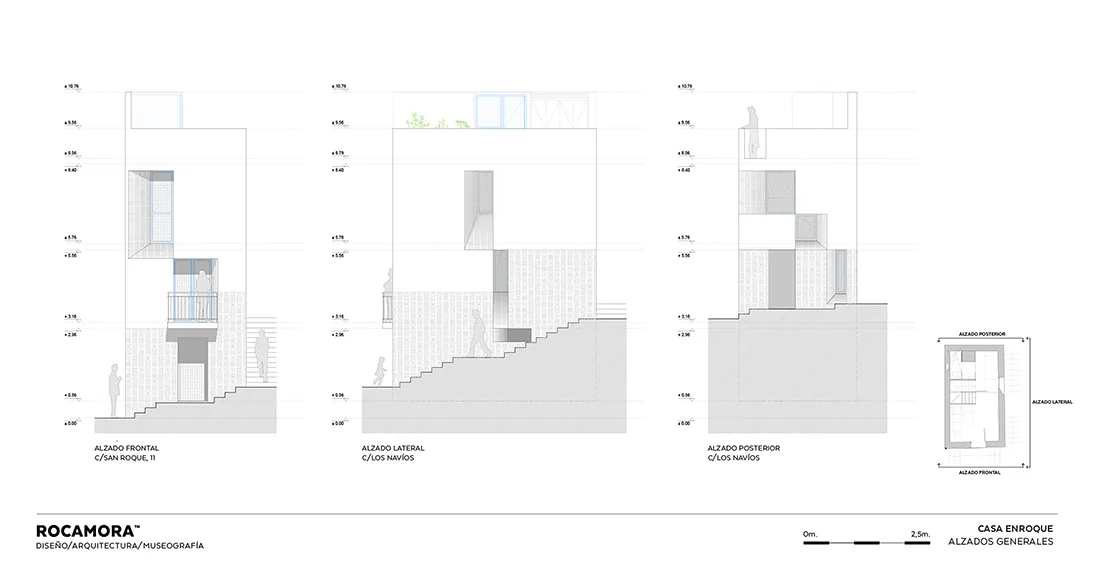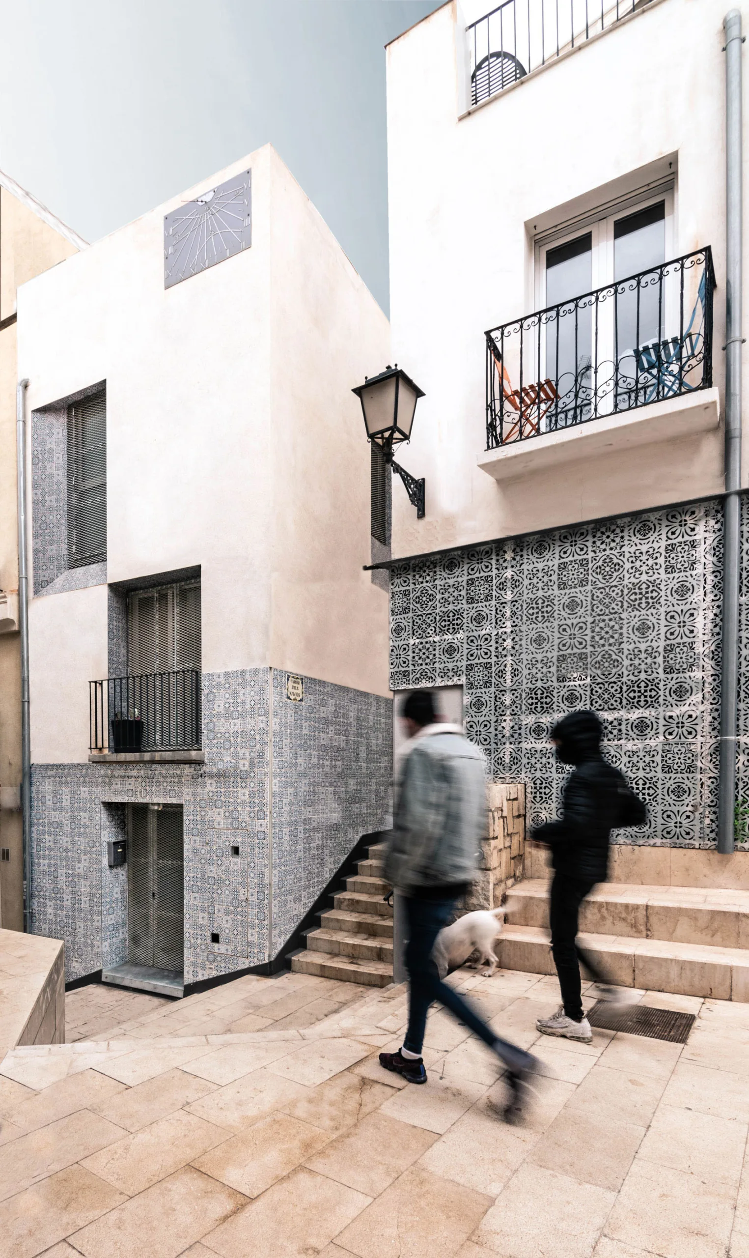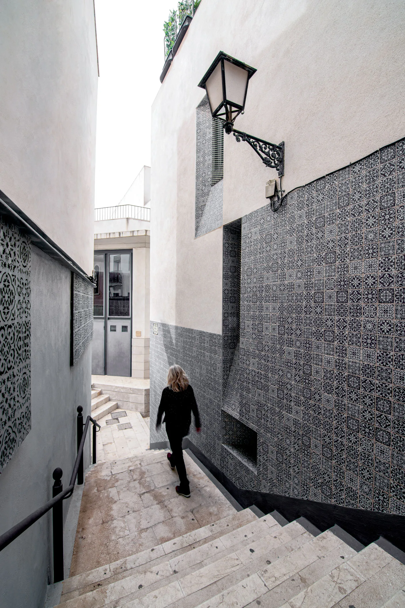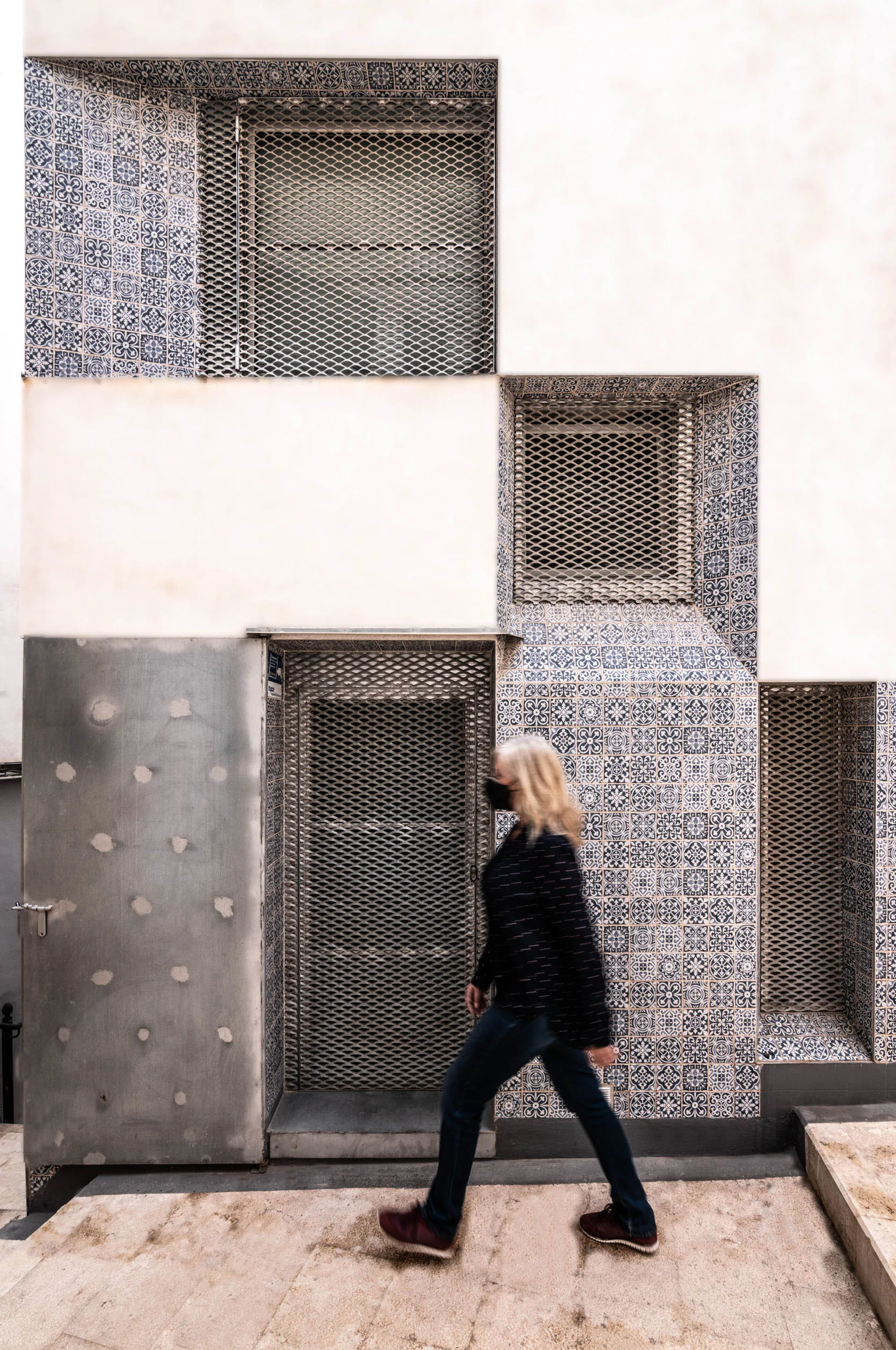 Por último, y principal, esta fachada, y sus huecos, en su contacto con el espacio público se protege mediante un chapado de azulejo estampado, que nos acompaña y escalona según subimos las escaleras de la calle San Roque, fachada lateral y por ultimo Calle Navíos.