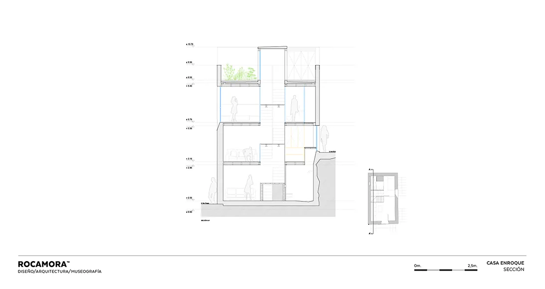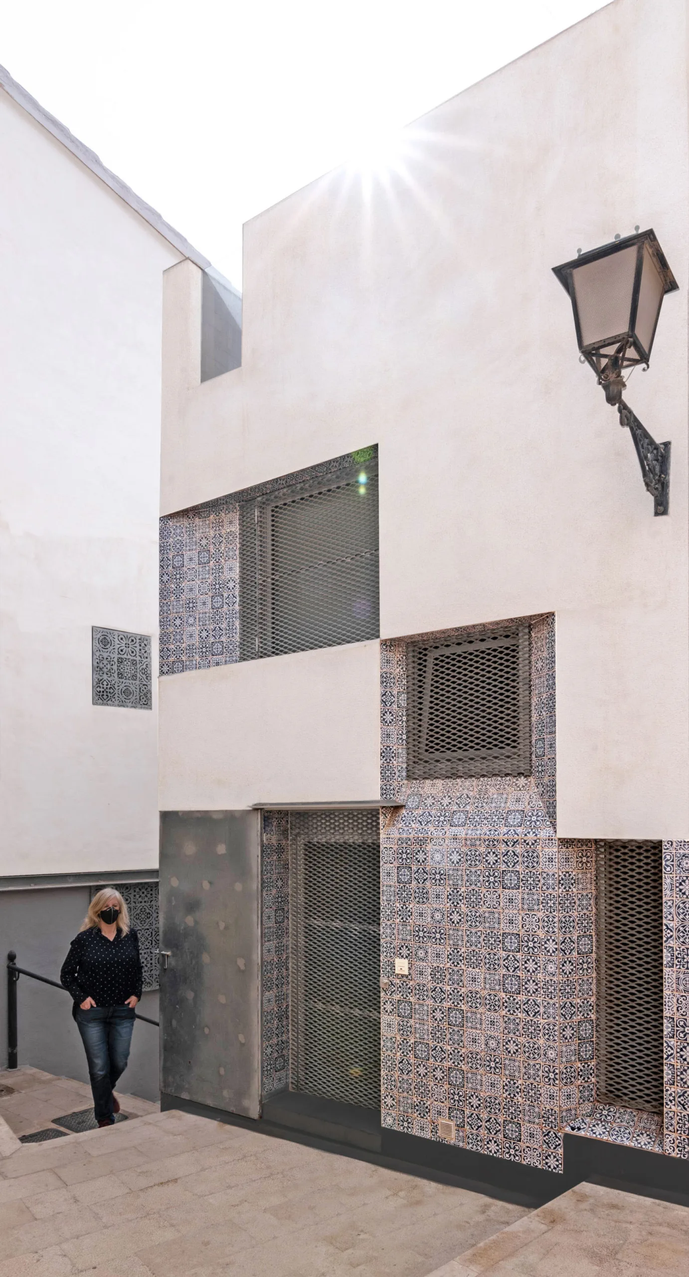 Este zócalo azulejado y la imagen formal del continuo de huecos horadados en el macizo de fachada, protegidos con enrejados de chapa metálica estirada, permeable, le confiere una imagen mediadora entre la tradición del lugar y la vocación decididamente contemporánea de la casa El Enroque y de su dueña, Inmaculada.