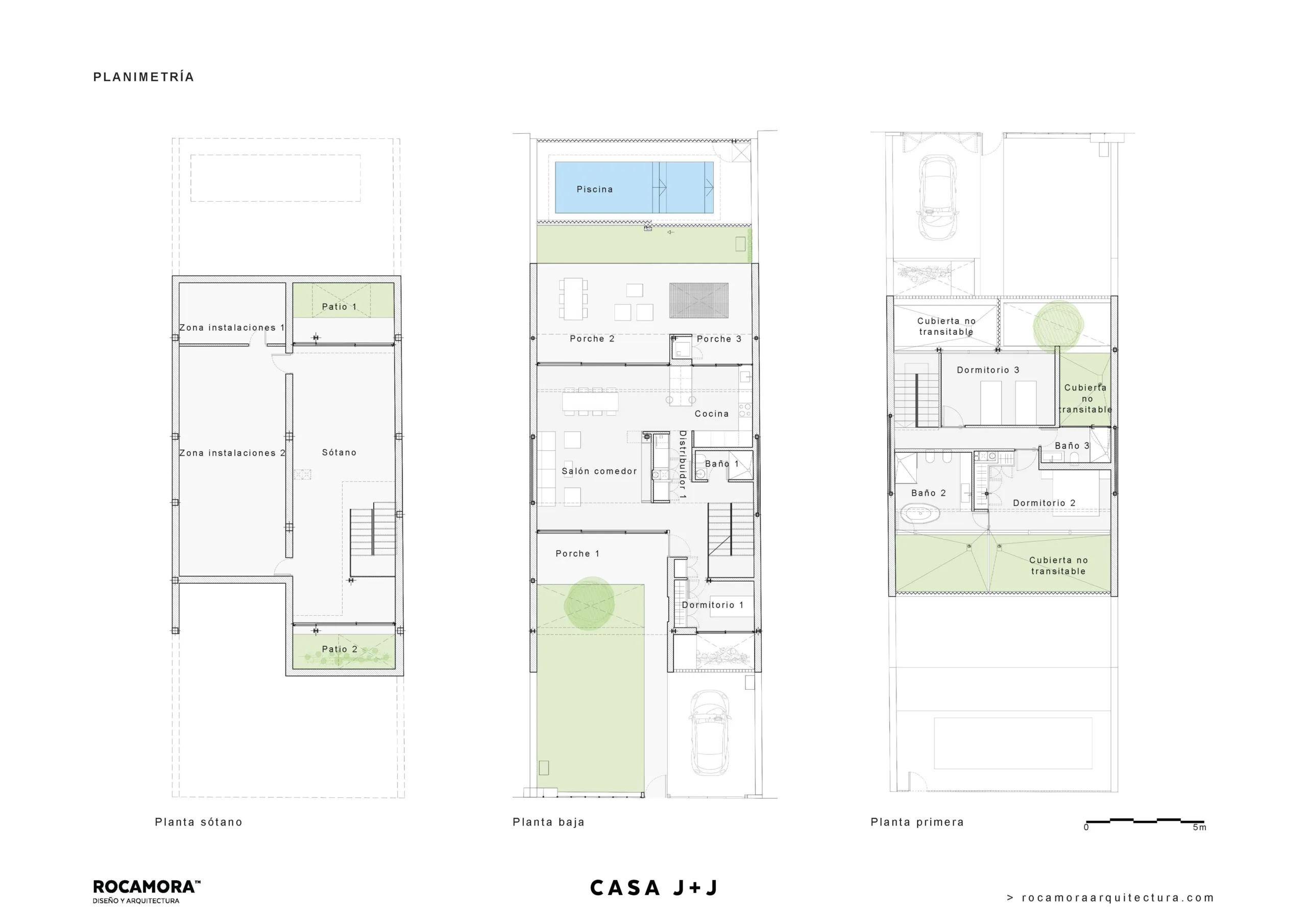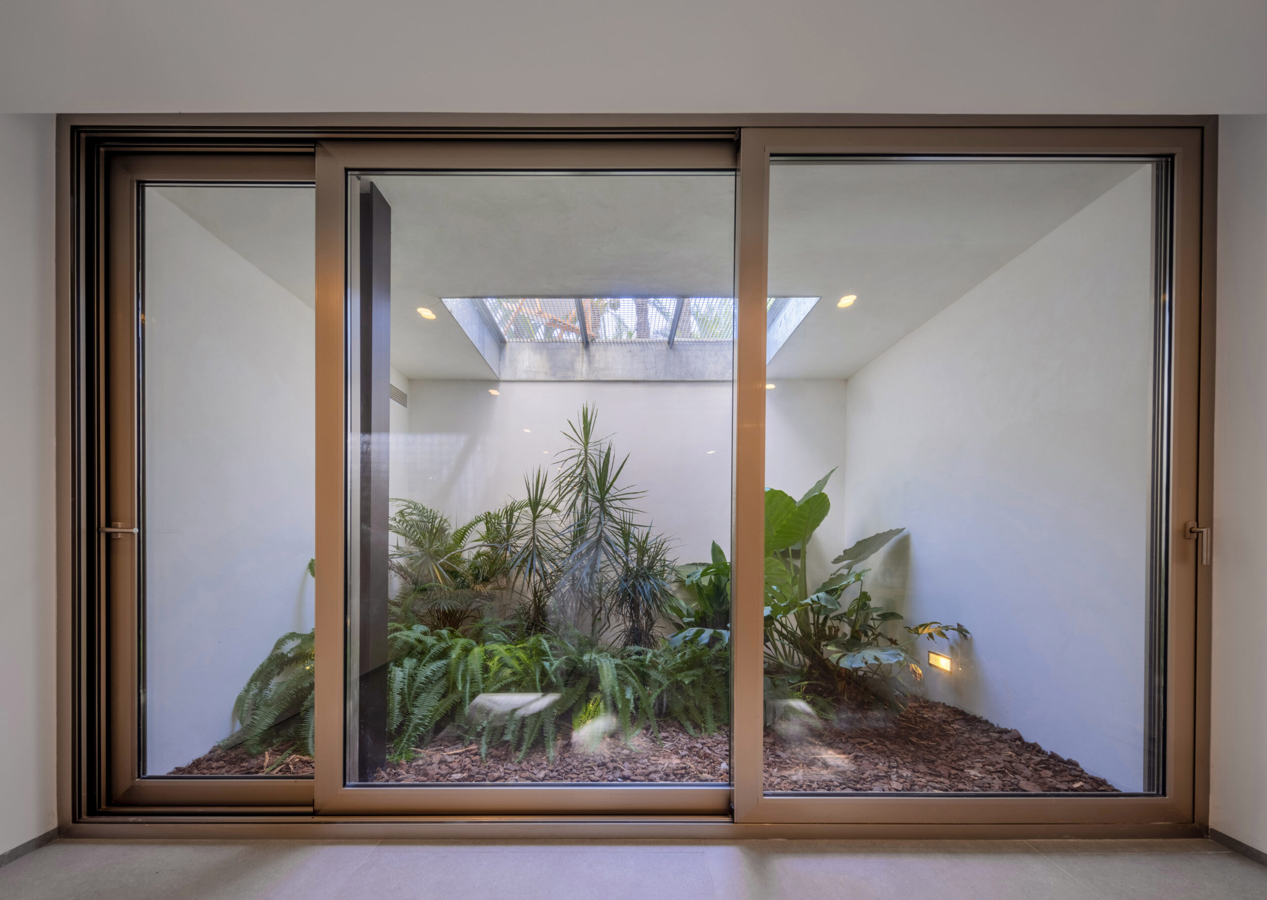La habitabilidad se extiende verticalmente. El sótano incorpora luz natural y ventilación mediante dos patios excavados que oxigenan la planta. La vegetación no es solo ornamental, sino un elemento constructivo vivo: coloniza progresivamente los espacios desde el subsuelo hasta la cubierta, arropando la arquitectura y evolucionando con el paso del tiempo.