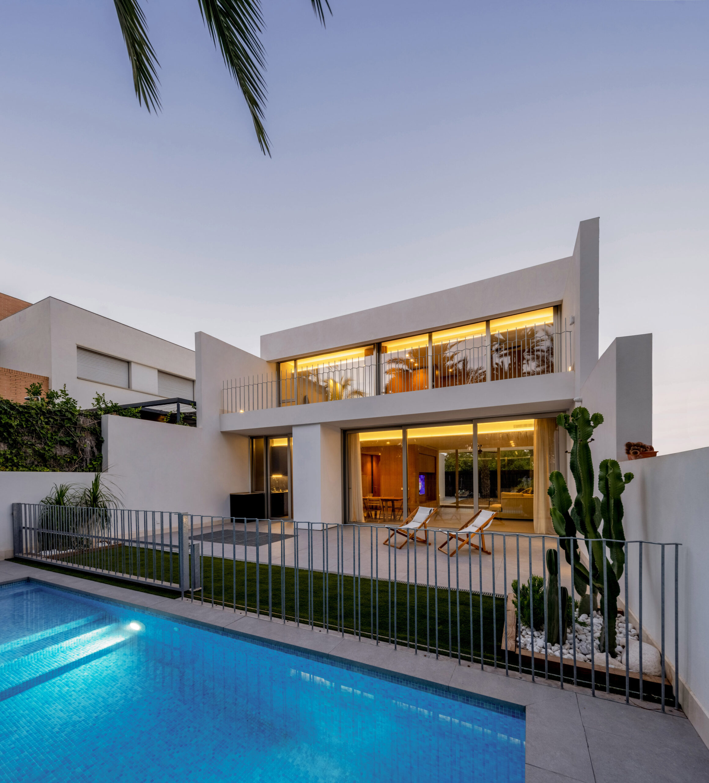 Situada en un entorno residencial vinculado a la memoria familiar, Casa J+J establece un diálogo estratégico con su entorno. El proyecto resuelve la dualidad de la parcela: una fachada este de carácter urbano y vecinal, frente a una orientación oeste abierta a un exuberante huerto de palmeras, herencia del paisaje islámico que actúa como telón de fondo de la vivienda.