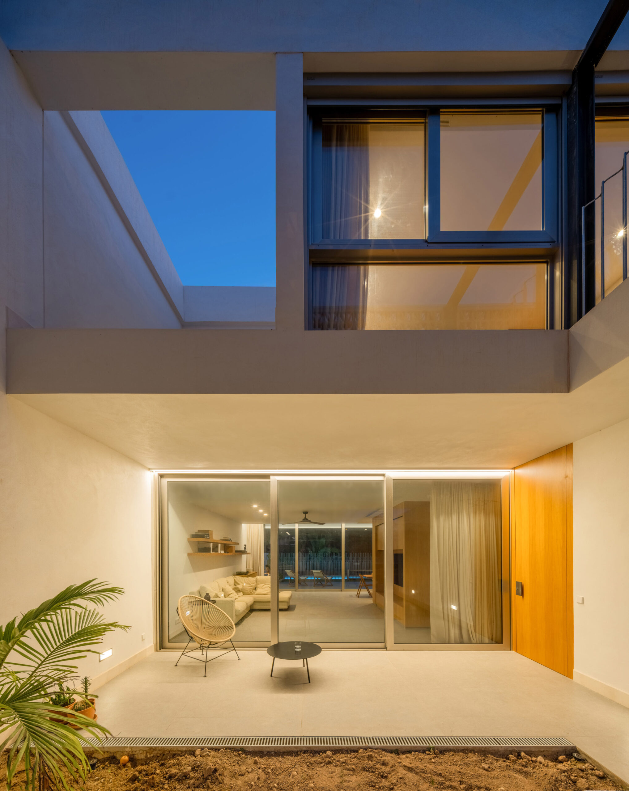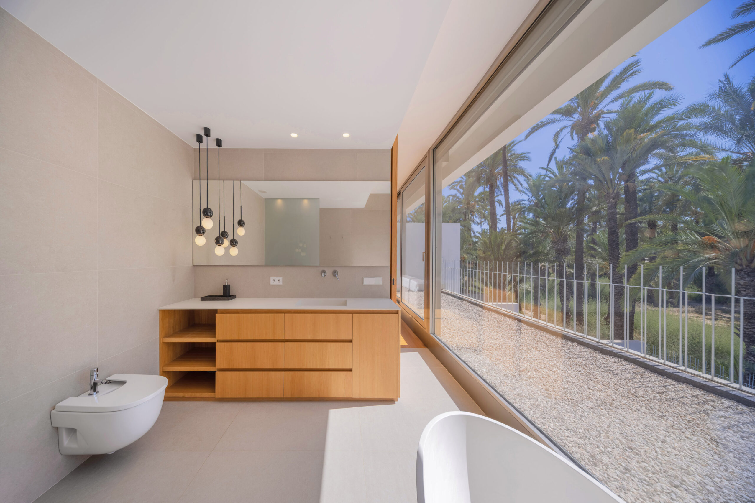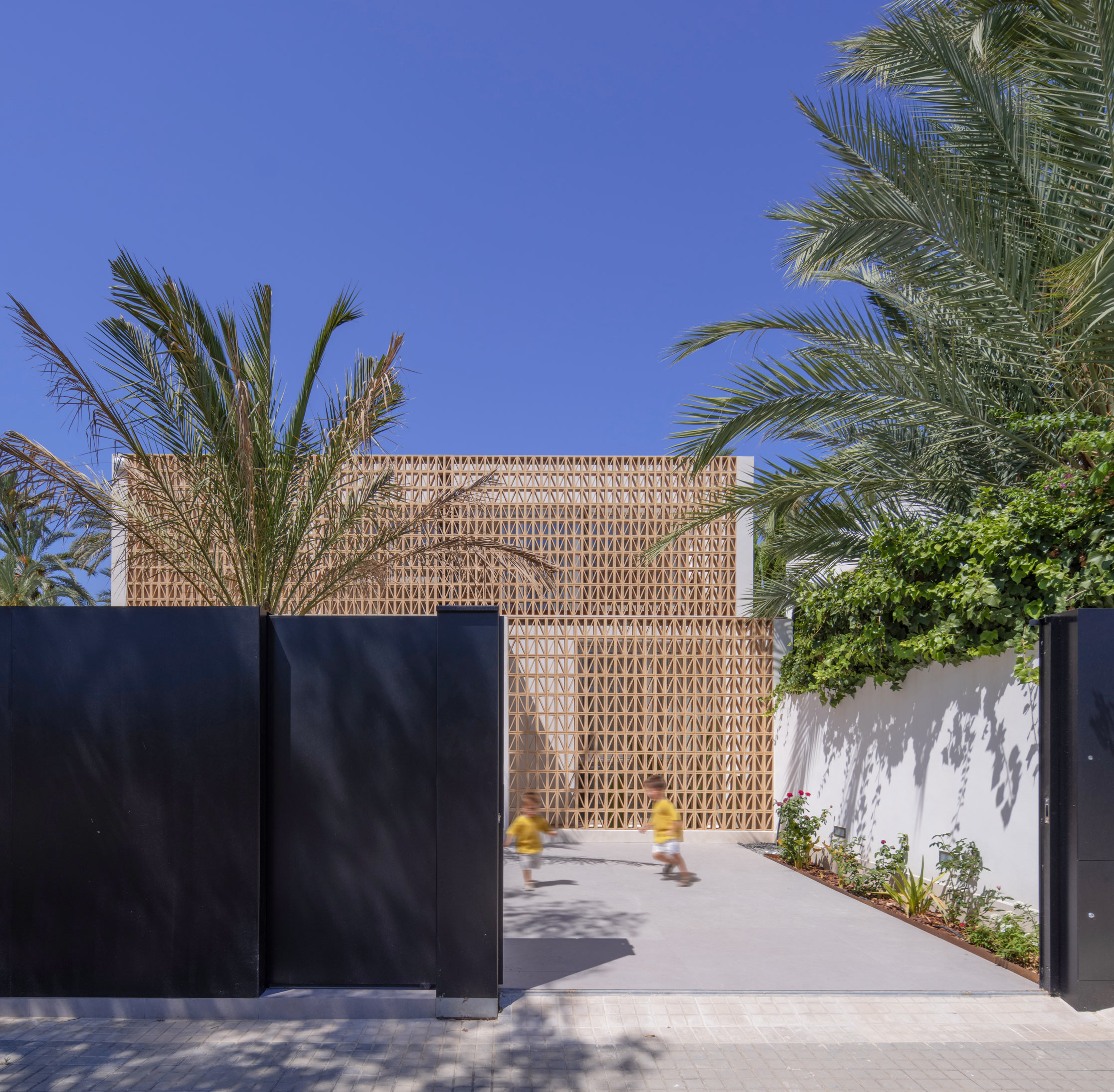 En planta primera, la arquitectura reinterpreta soluciones vernáculas. A naciente, una celosía cerámica —inspirada en las cambras tradicionales— tamiza la luz y garantiza la privacidad de los dormitorios. A poniente, el volumen se proyecta en voladizo para proteger el dormitorio principal de la radiación solar, enmarcando las vistas privilegiadas hacia el palmeral.