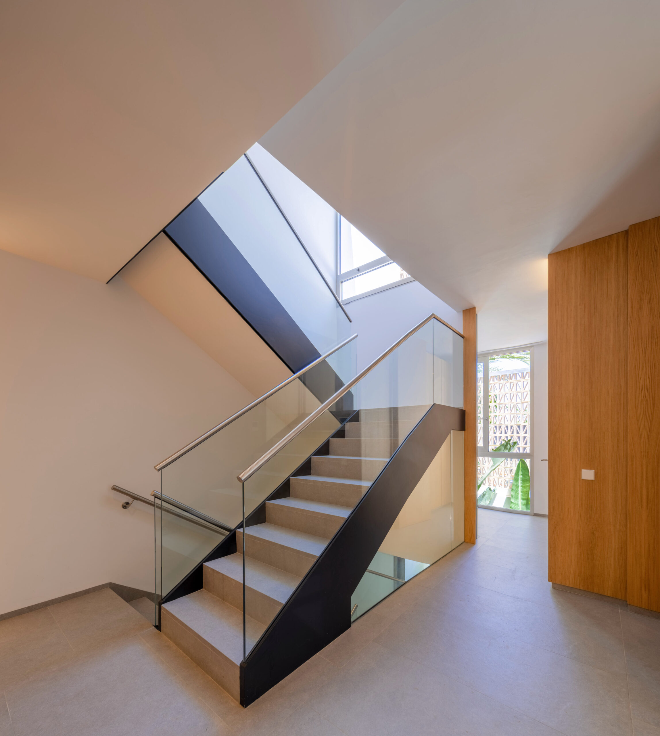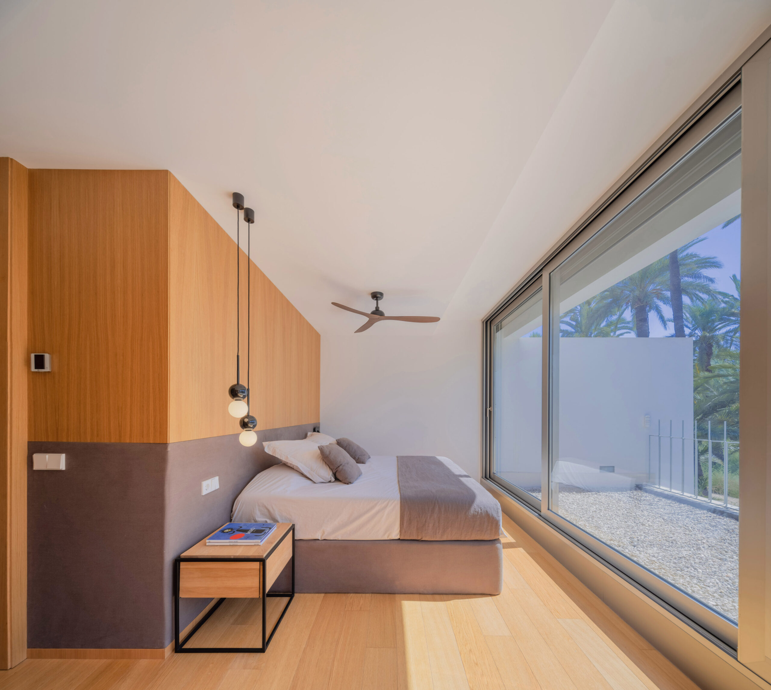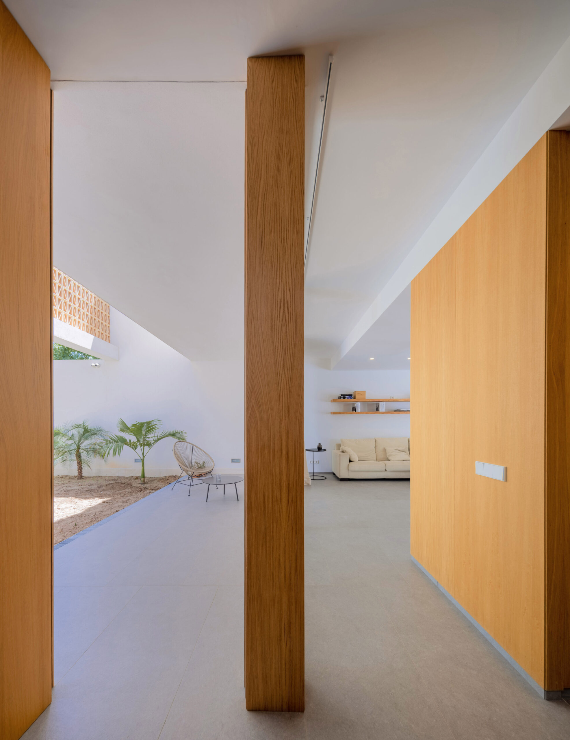 En planta primera, la arquitectura reinterpreta soluciones vernáculas. A naciente, una celosía cerámica —inspirada en las cambras tradicionales— tamiza la luz y garantiza la privacidad de los dormitorios. A poniente, el volumen se proyecta en voladizo para proteger el dormitorio principal de la radiación solar, enmarcando las vistas privilegiadas hacia el palmeral.