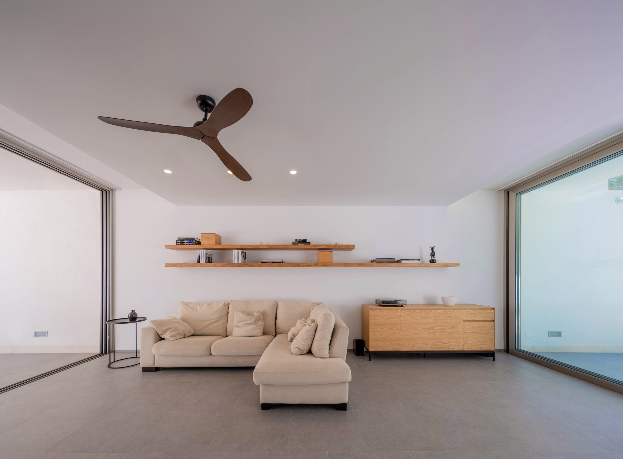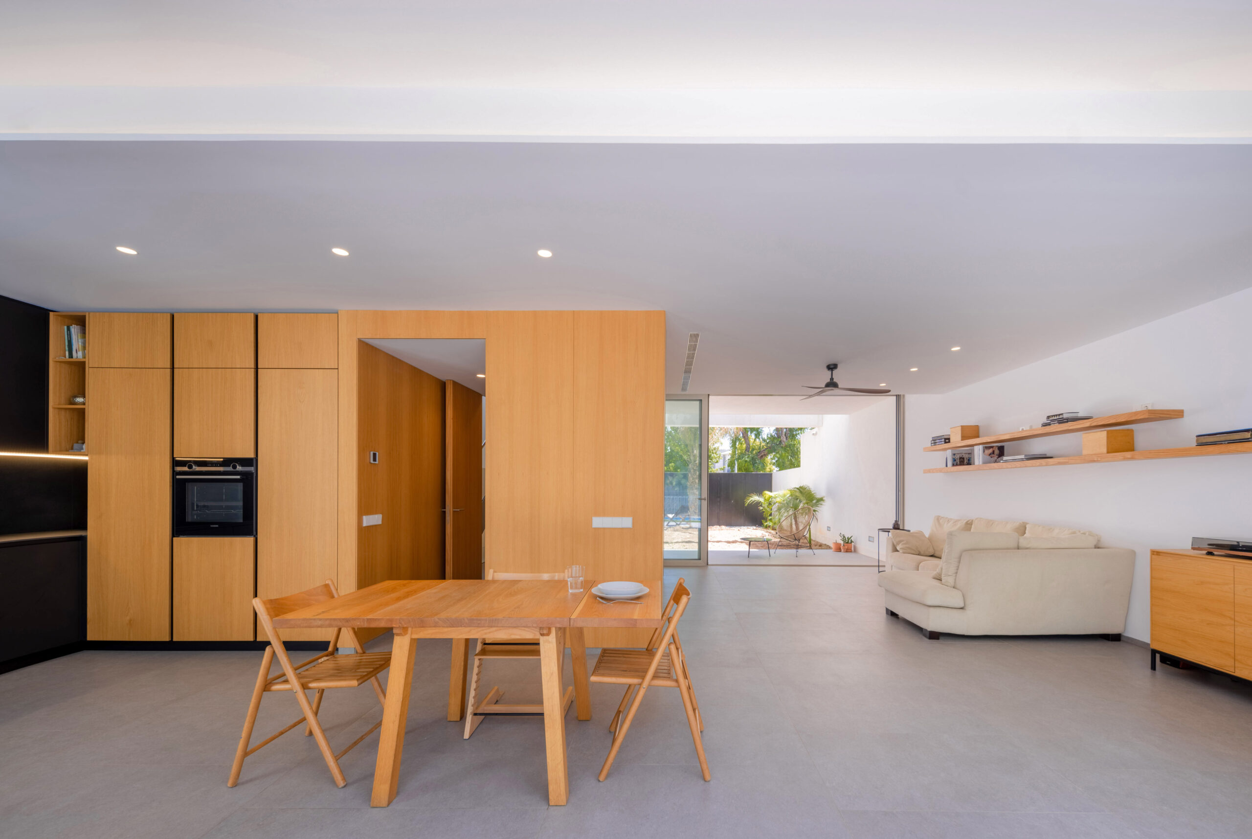 La planta baja se concibe como un espacio pasante que diluye los límites del recinto. Definida por grandes paños acristalados en sus extremos, su apertura total transforma la vivienda en un jardín continuo que atraviesa la parcela. El salón pierde su hermetismo para convertirse en un umbral de sombra, plenamente integrado en la vegetación exterior.