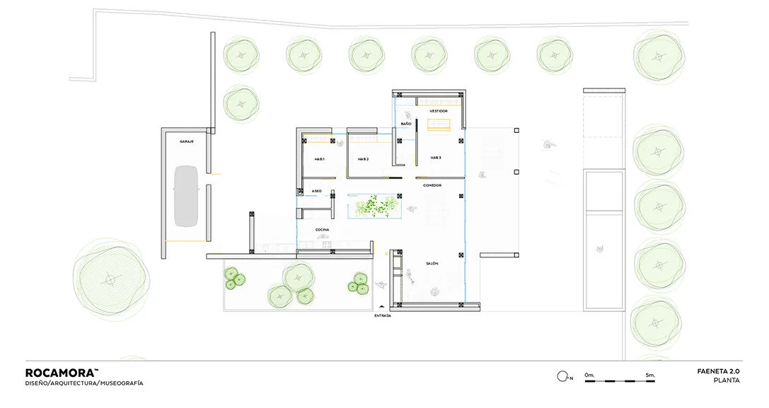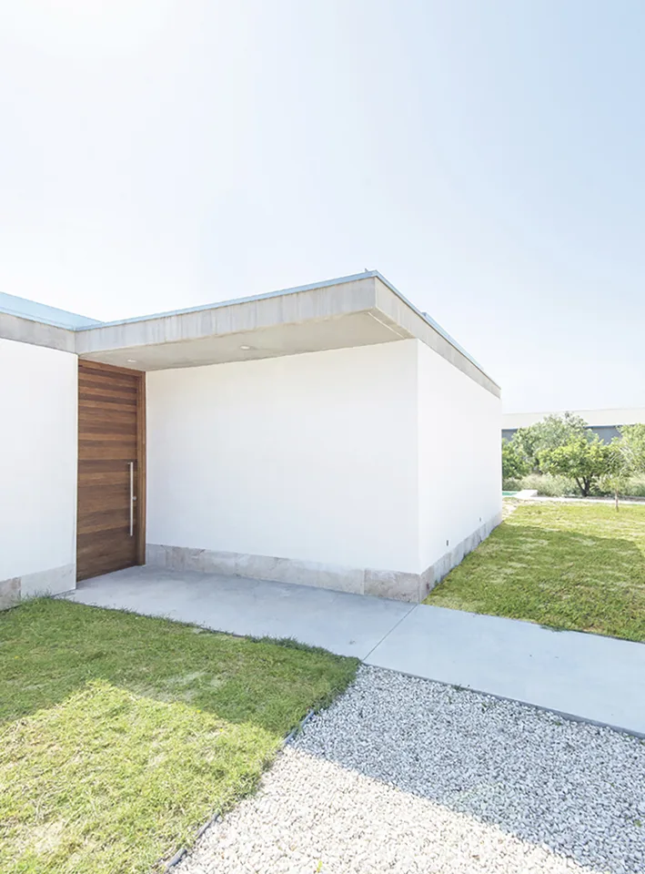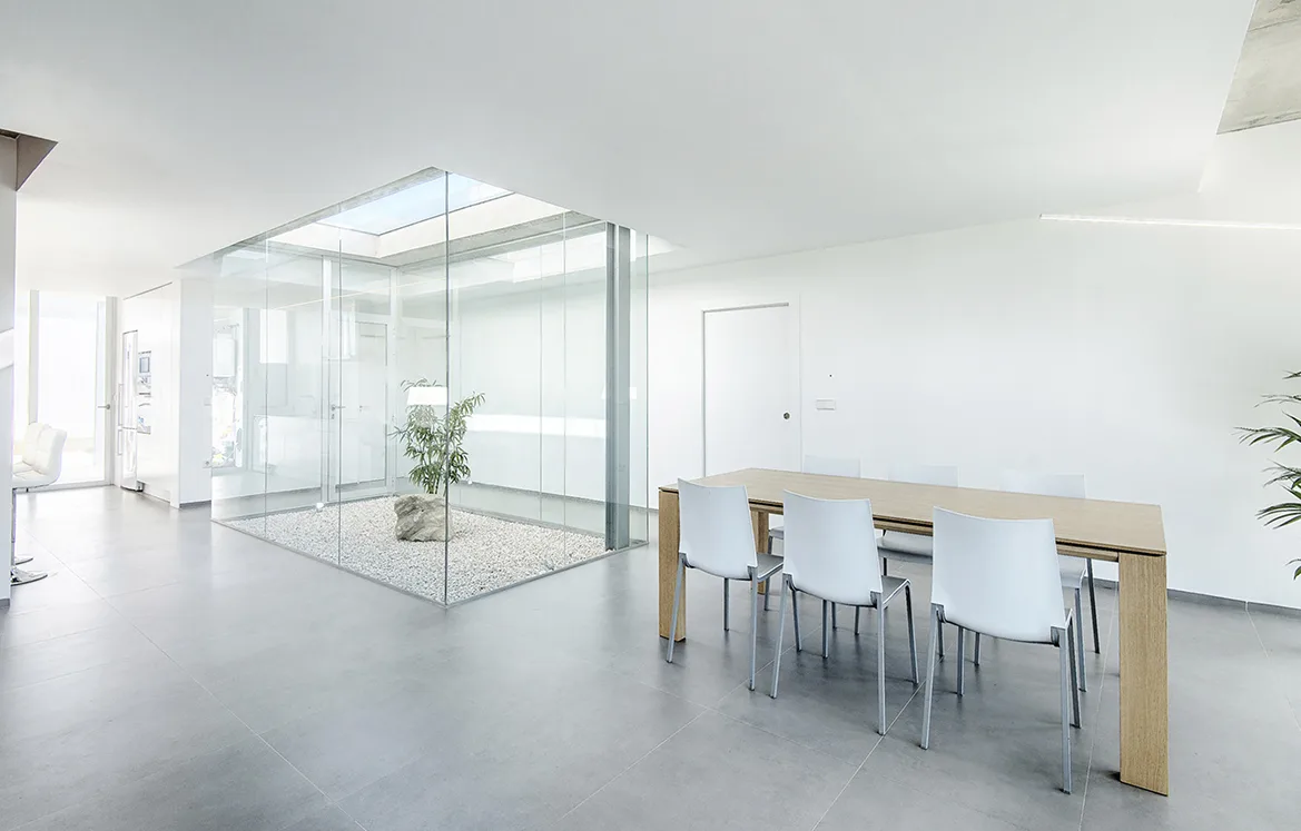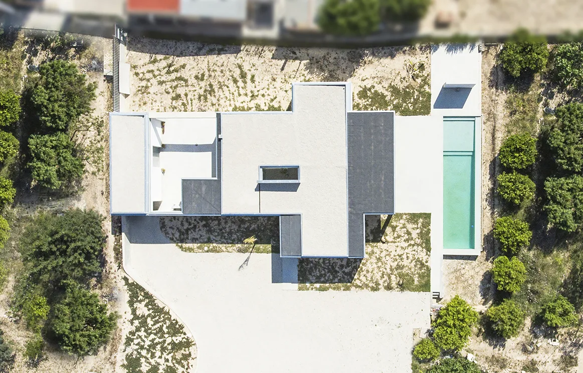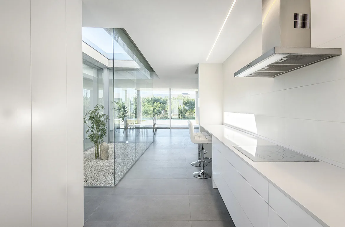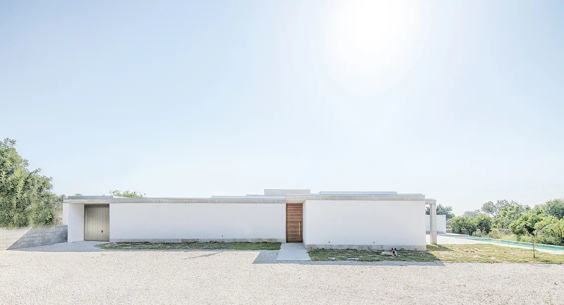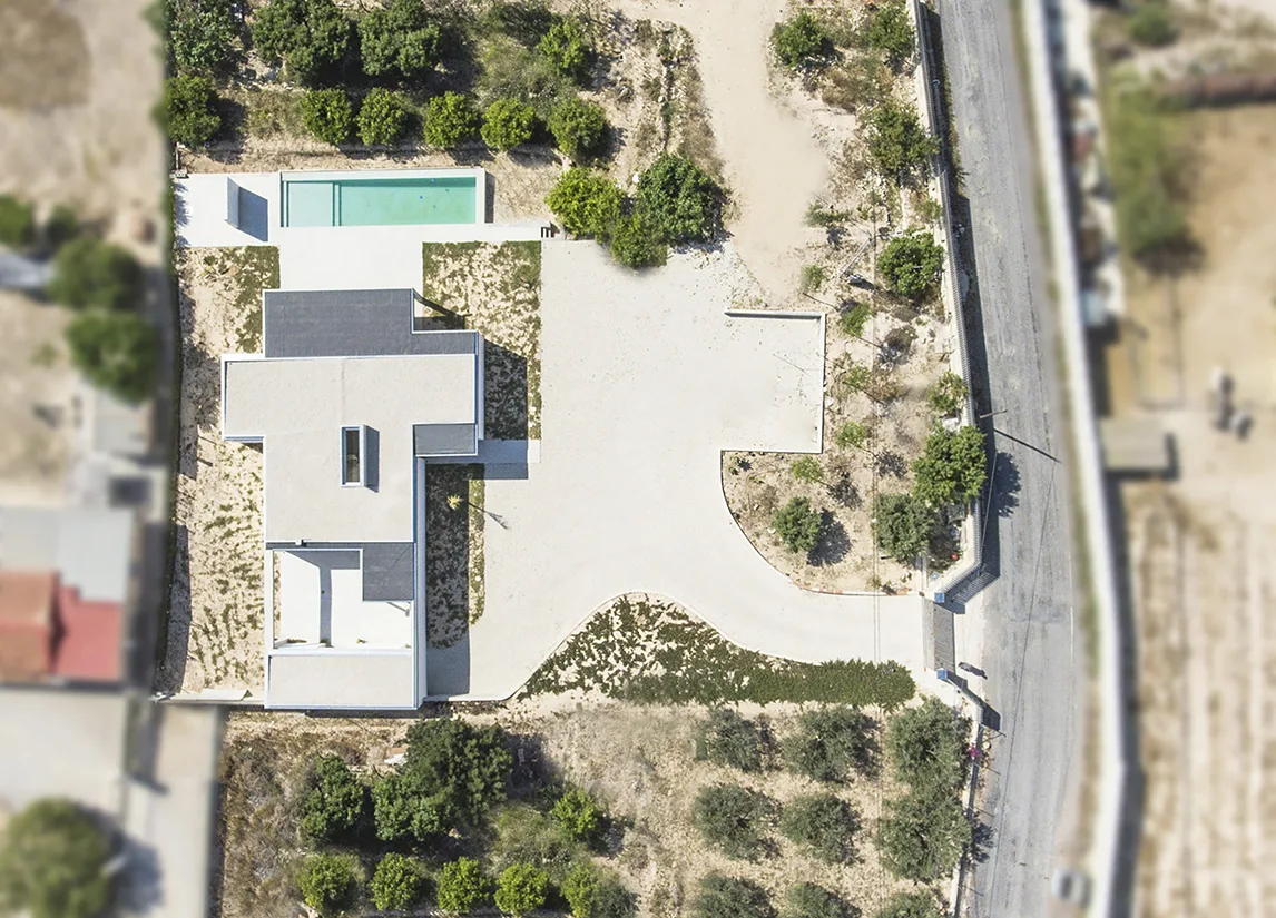 Los muros encalados, la cubierta plana, los grandes huecos hacia el norte, la fluidez del espacio de los usos de día con el espacio interior hacen que la solución de continuidad entre lo construido y los aledaños con la parcela tengan una continuidad vital, un disfrute de la parcela característico del siglo XXI.