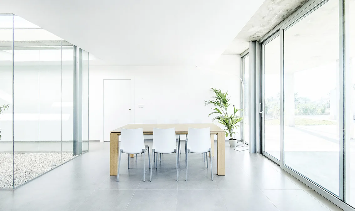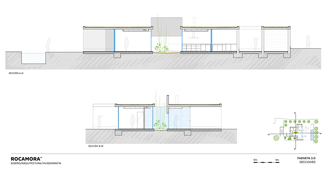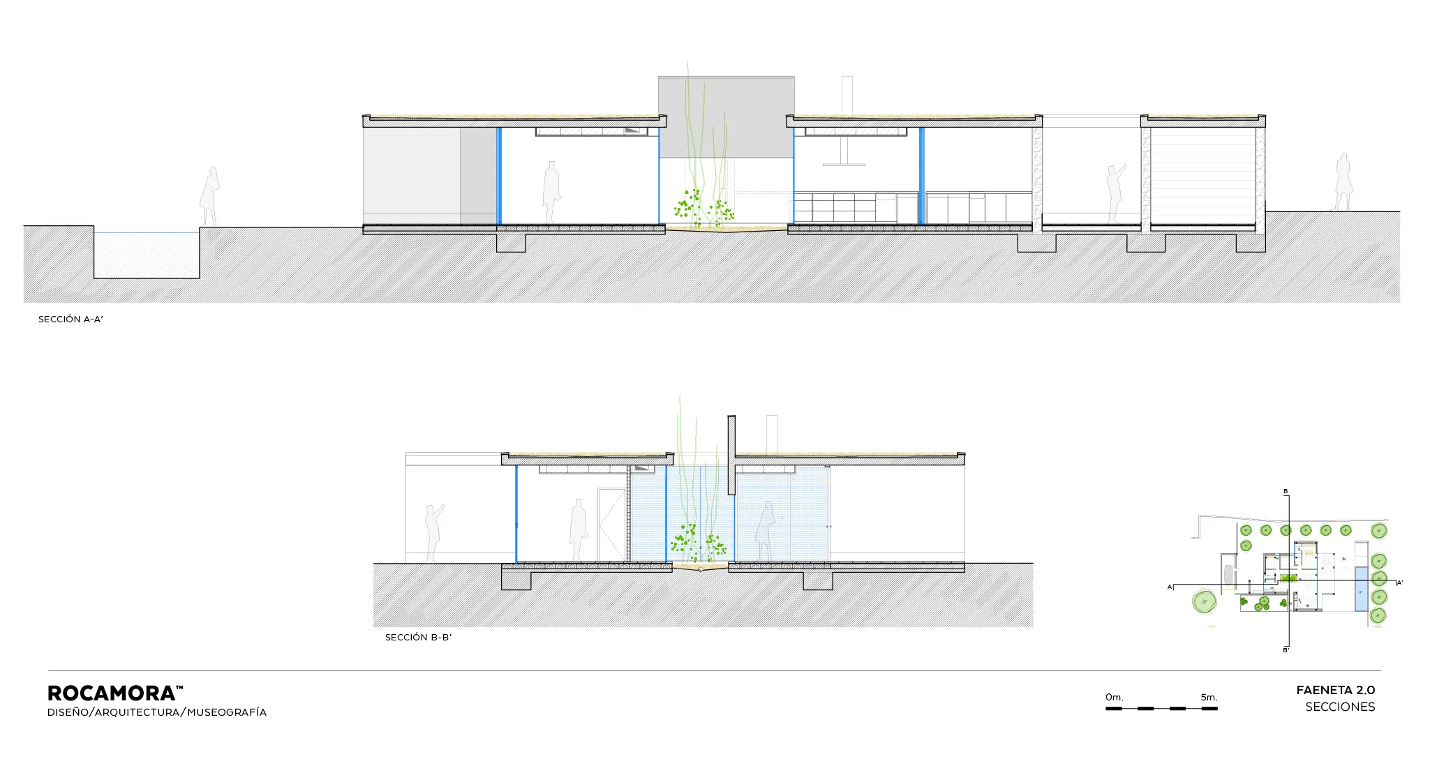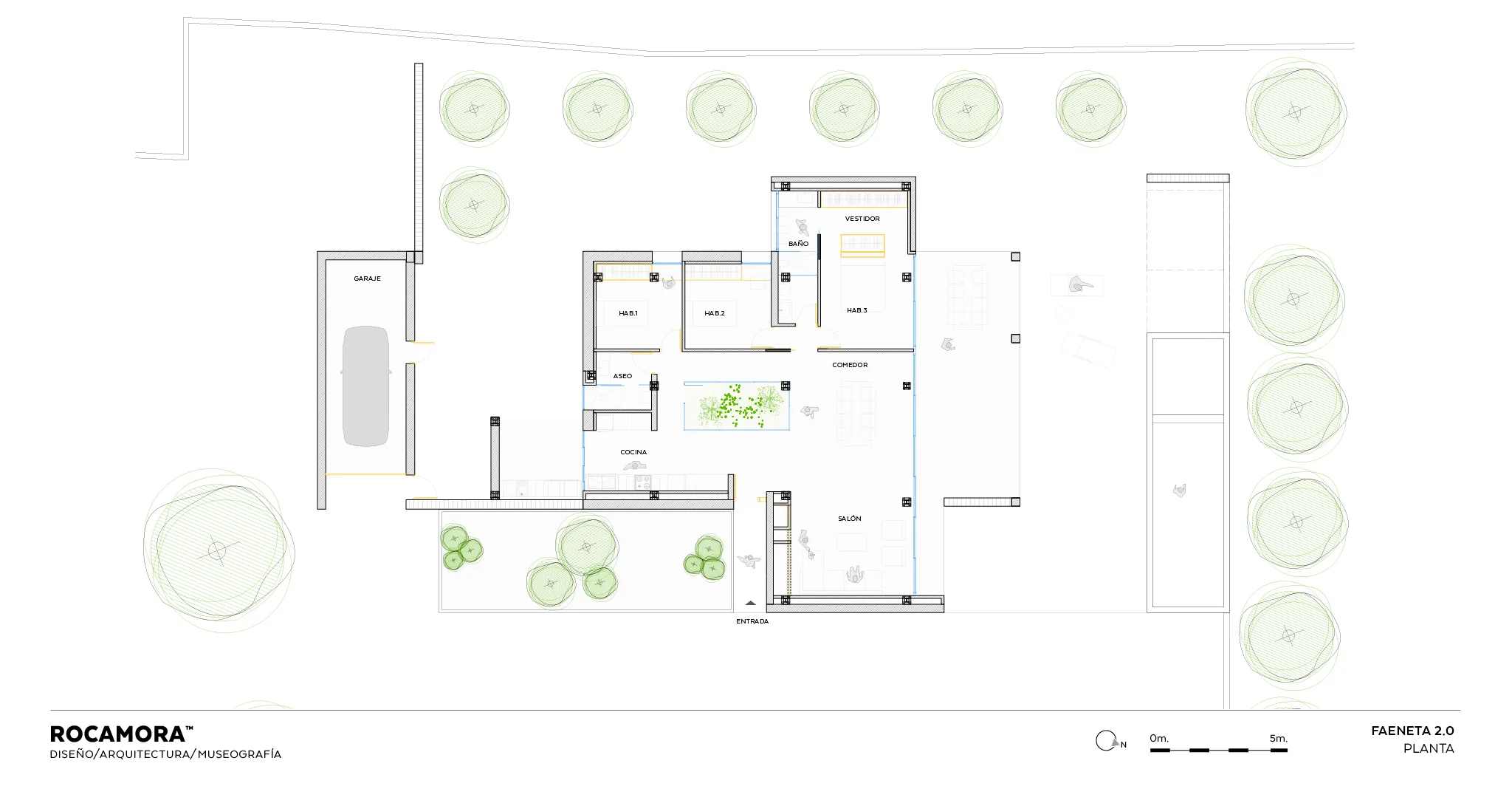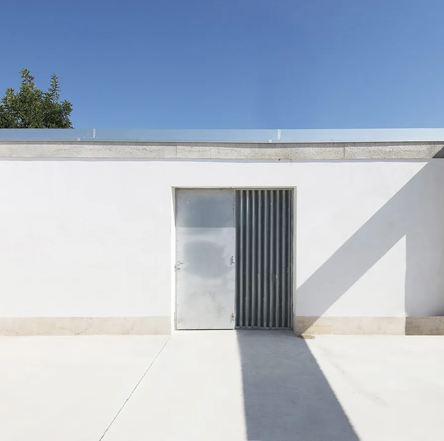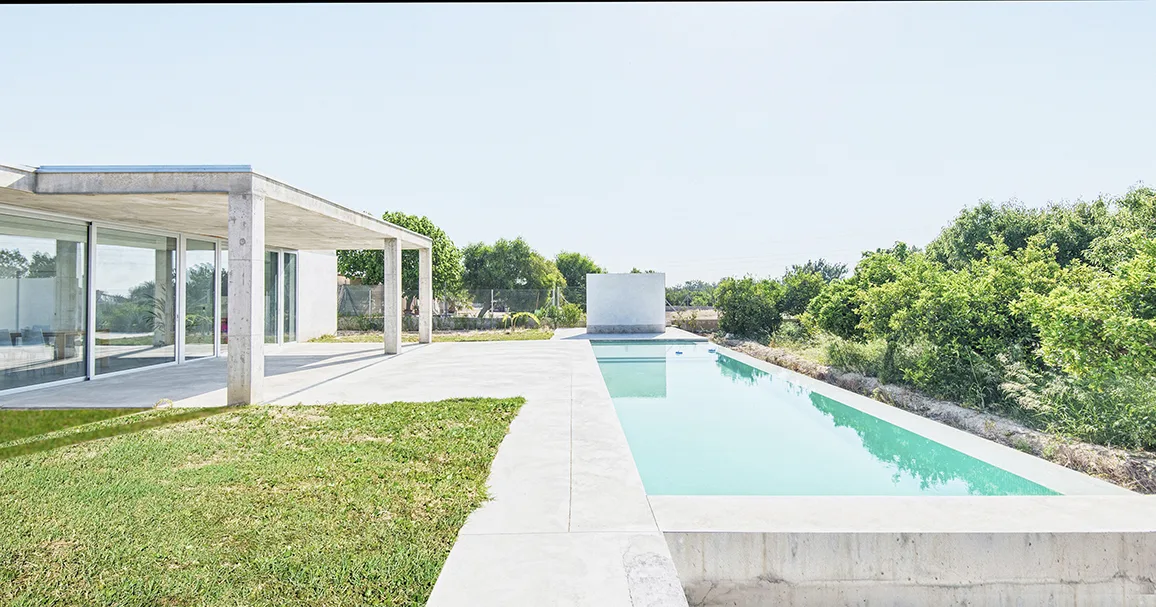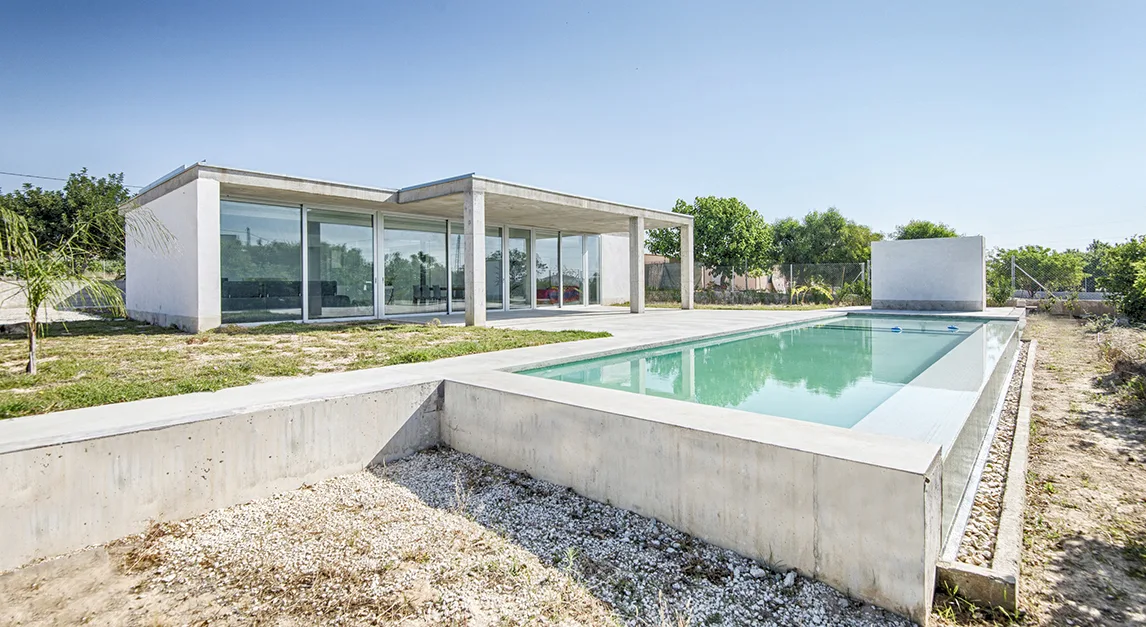 Ahora la vivienda se desarrolla en la parcela y se inserta en ella con todas estas herramientas de la experiencia heredada, pero apropiándose de los huertos y la nueva piscina como paisaje anexo, como línea de horizonte próxima. Con la finalidad de garantizar la continuidad visual entre el interior y el exterior de la casa se utiliza vidrio y carpintería de aluminio para convertir el porche en una gran cristalera que permita el paso de la luz y deje a la vista la piscina desbordante exterior que, a su vez, sirve para marcar el escalón en el que termina la zona habitable y empiezan los campos de naranjos.