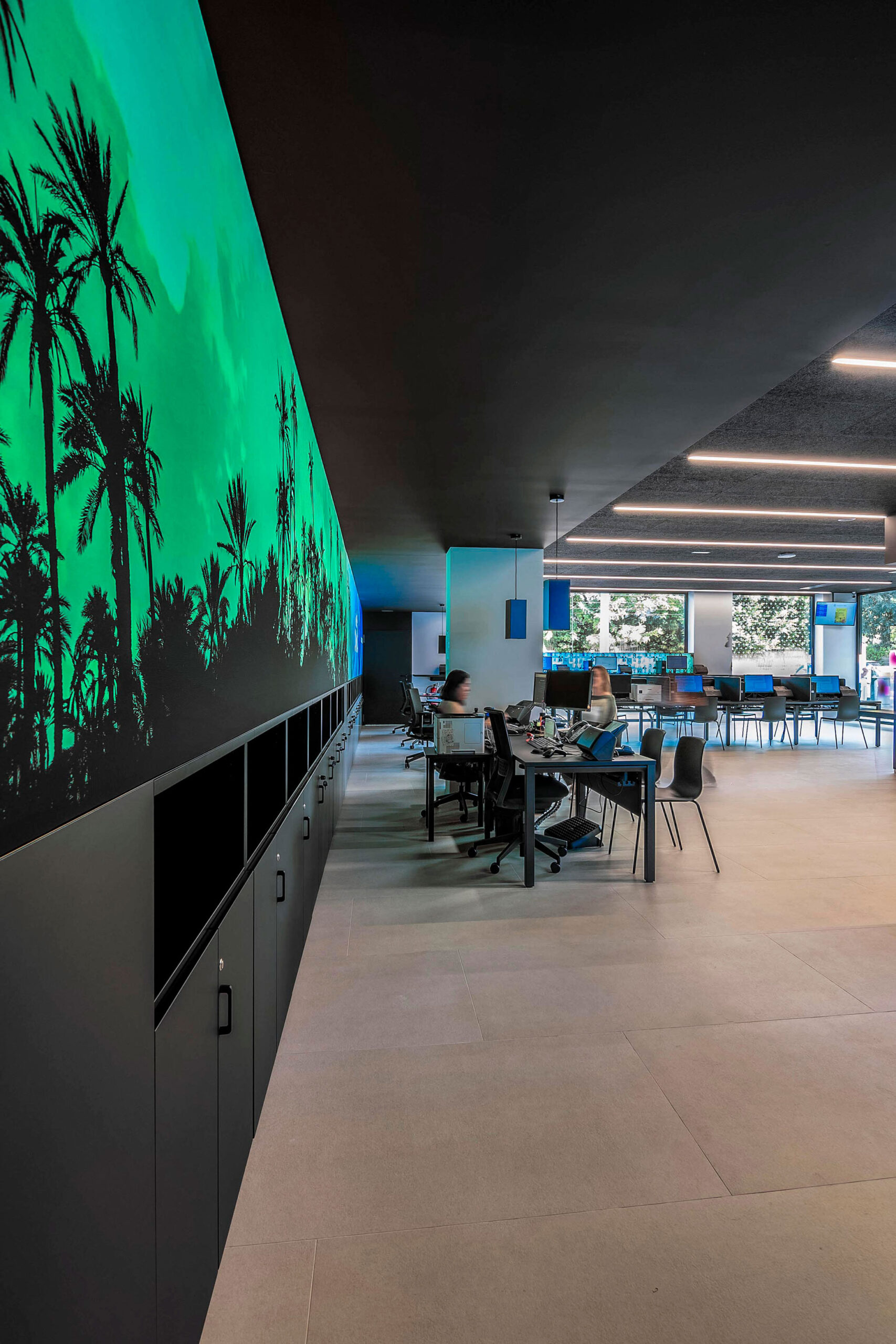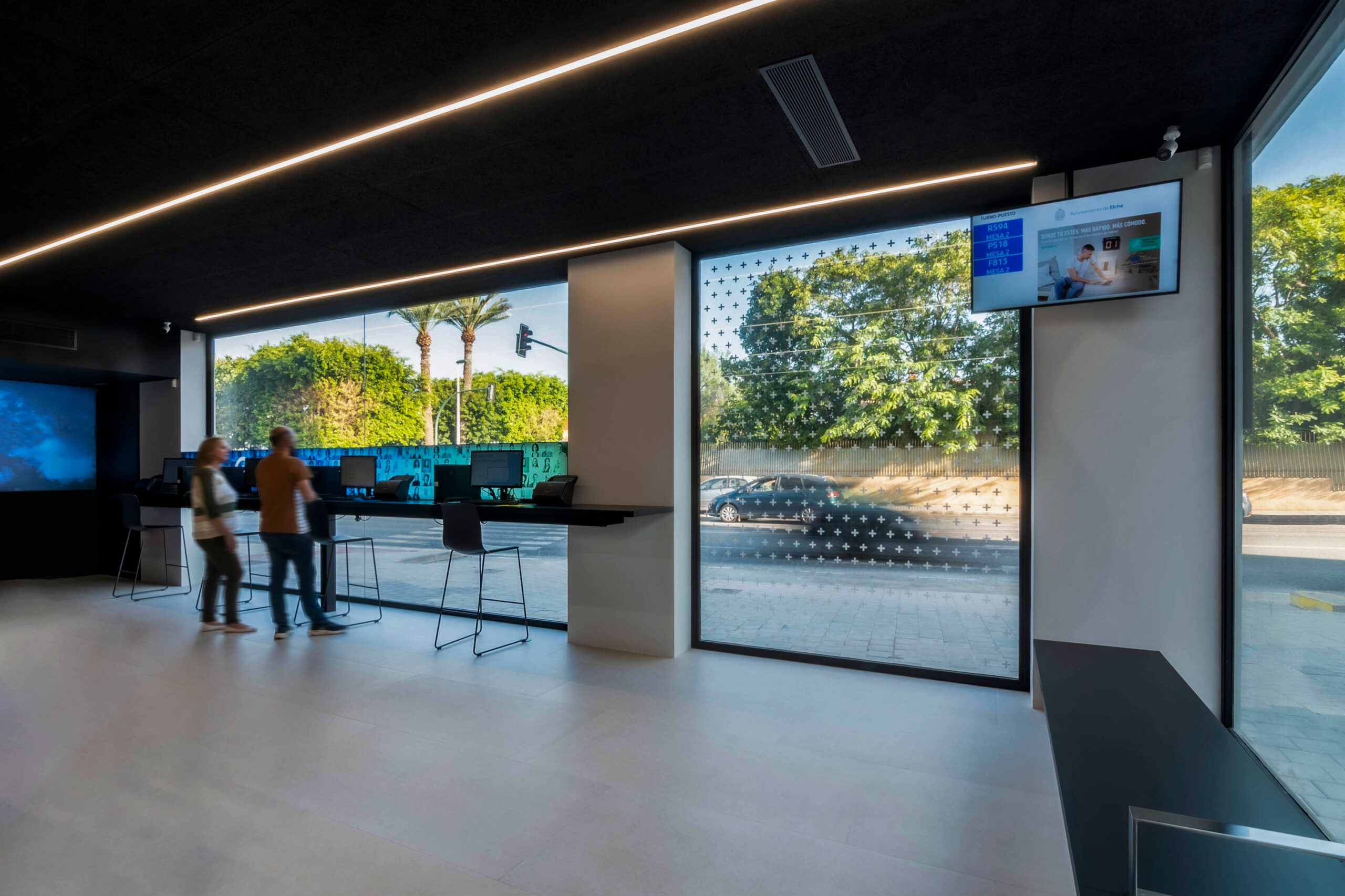 El interior se configura como una sala diáfana que alberga 16 puestos de atención y autogestión. La materialidad ordena la jerarquía espacial: un sistema de panelados de madera y cajas de luz integra los usos técnicos y privados (almacén, office, aseos) en un segundo plano, liberando el área principal para garantizar una circulación fluida y eficiente.