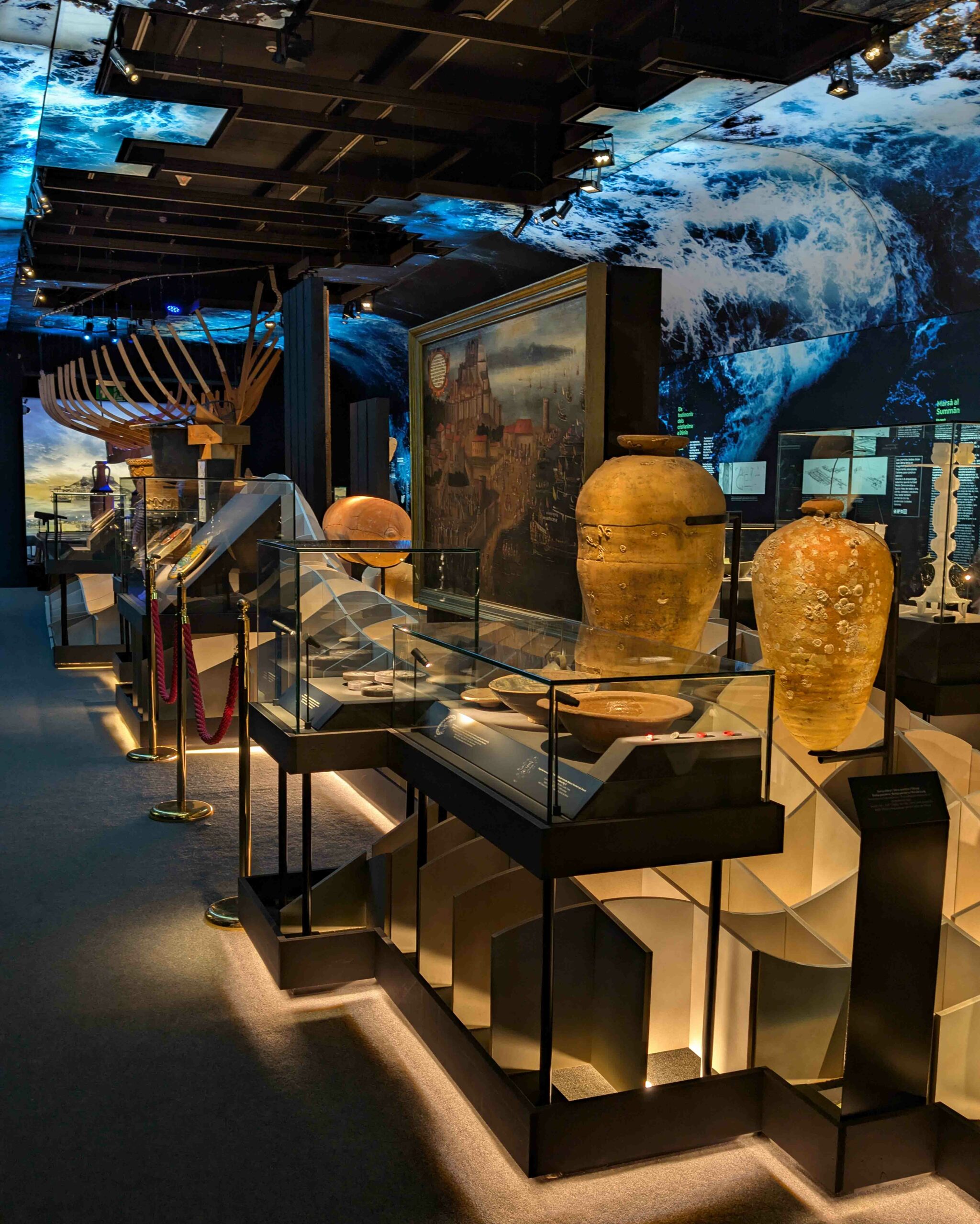La primera sala se centra en el mar. En su espacio central flota una segunda estructura de barco, alrededor de la cual una base de madera que evoca la superficie del agua y el movimiento de las olas sostiene vitrinas y piezas arqueológicas. El techo se transforma en una recreación del mar y la costa de Dénia, envolviendo la sala en una atmósfera azulada que convierte la arqueología en paisaje. Al fondo, un audiovisual dedicado a la arqueología subacuática culmina el ámbito marítimo y abre paso al territorio interior.