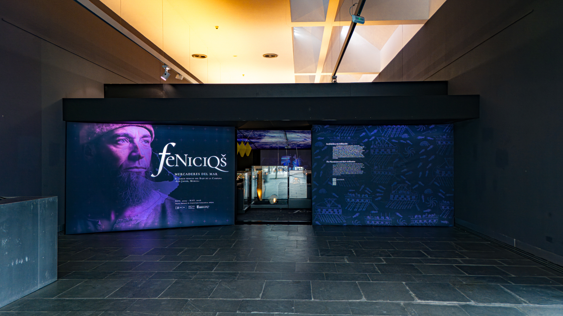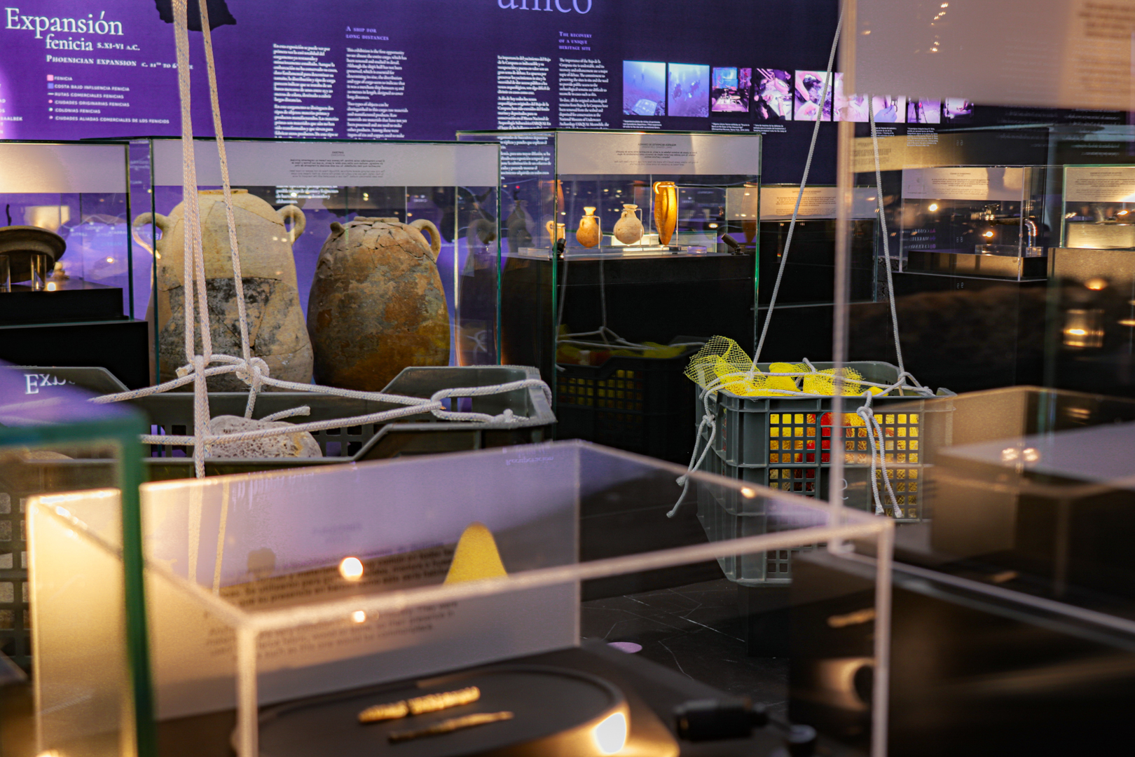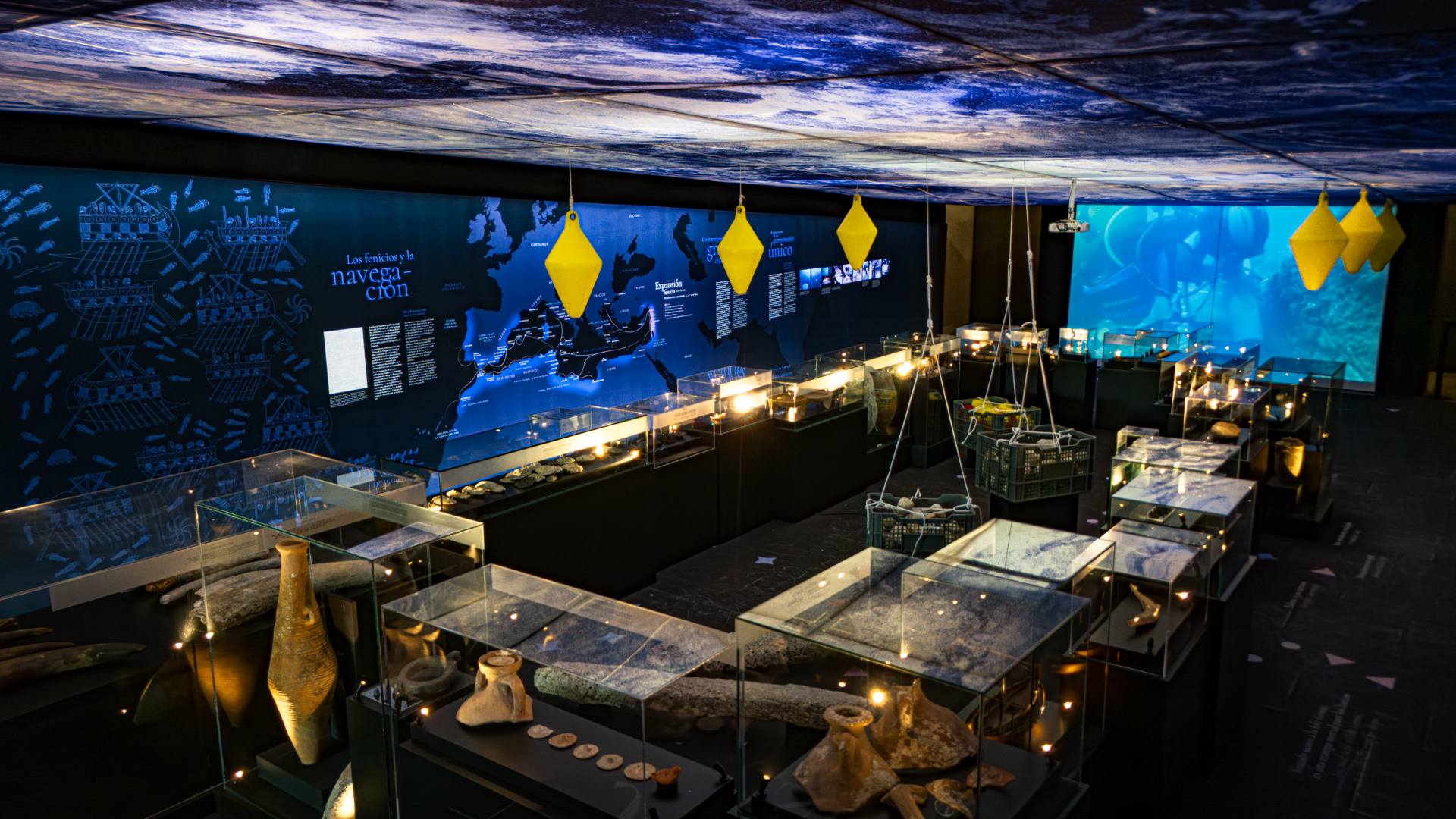 La exposición Fenicios. Mercaderes del mar sumerge al visitante en el universo de la arqueología subacuática a partir del pecio fenicio del Bajo de la Campana. El recorrido sensorial y espacial recrea el entorno marino donde los restos permanecieron sumergidos, combinando historia, ciencia y experiencia para acercar al público al mundo fenicio y al contexto de los hallazgos arqueológicos.