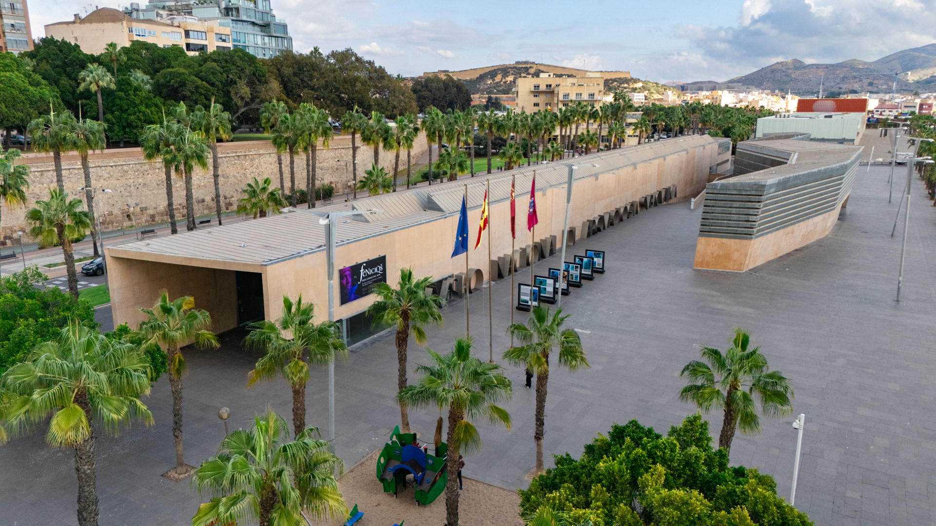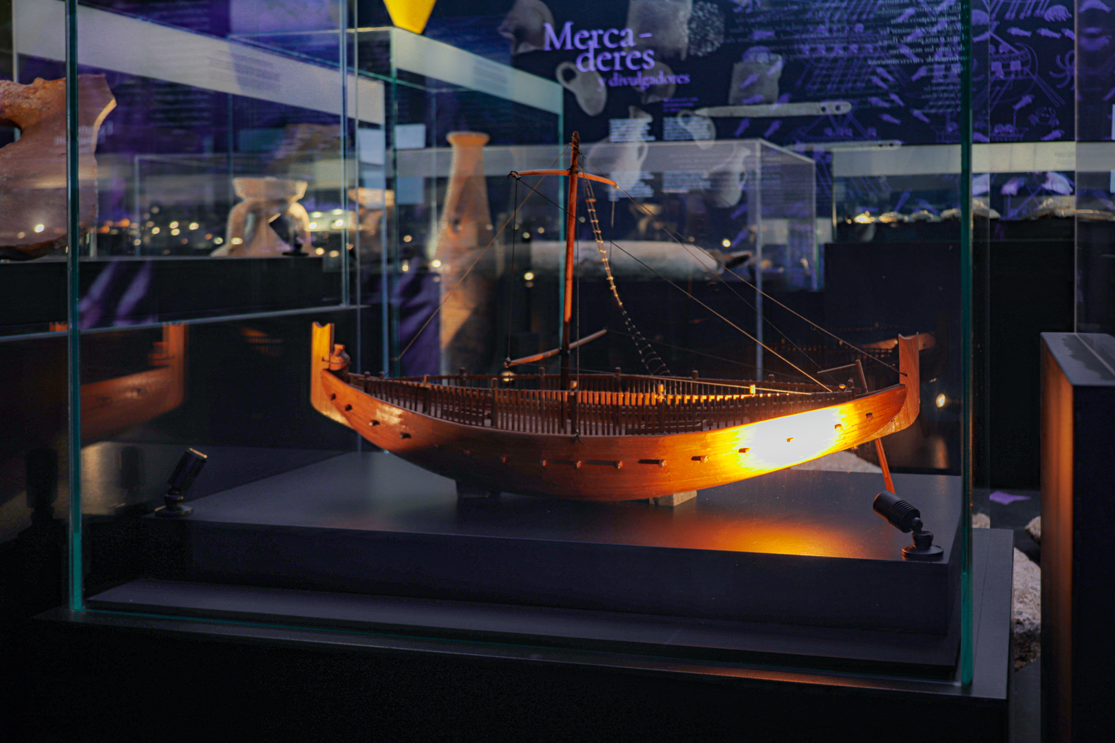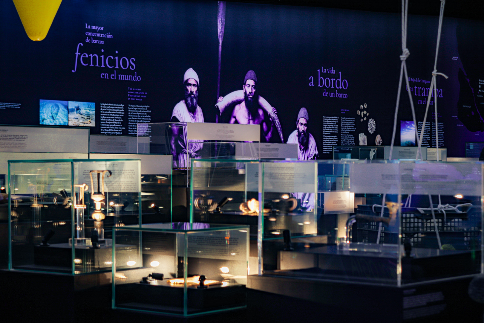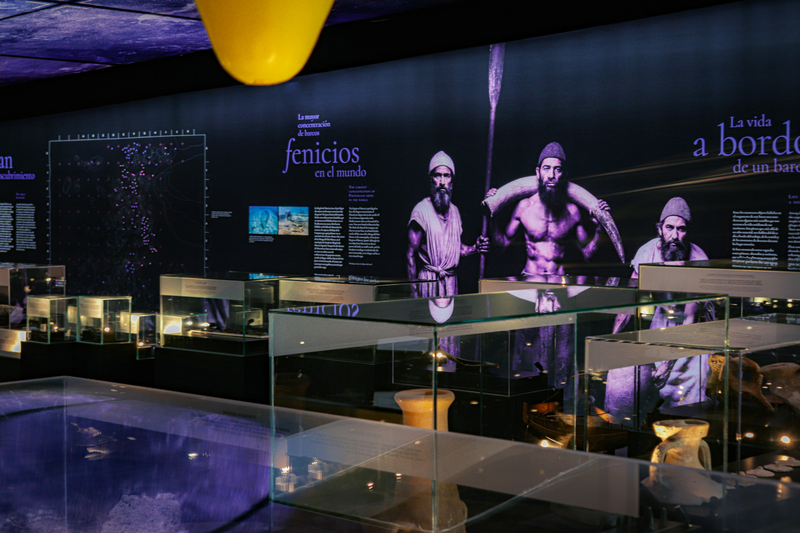 La exposición Fenicios. Mercaderes del mar sumerge al visitante en el universo de la arqueología subacuática a partir del pecio fenicio del Bajo de la Campana. El recorrido sensorial y espacial recrea el entorno marino donde los restos permanecieron sumergidos, combinando historia, ciencia y experiencia para acercar al público al mundo fenicio y al contexto de los hallazgos arqueológicos.