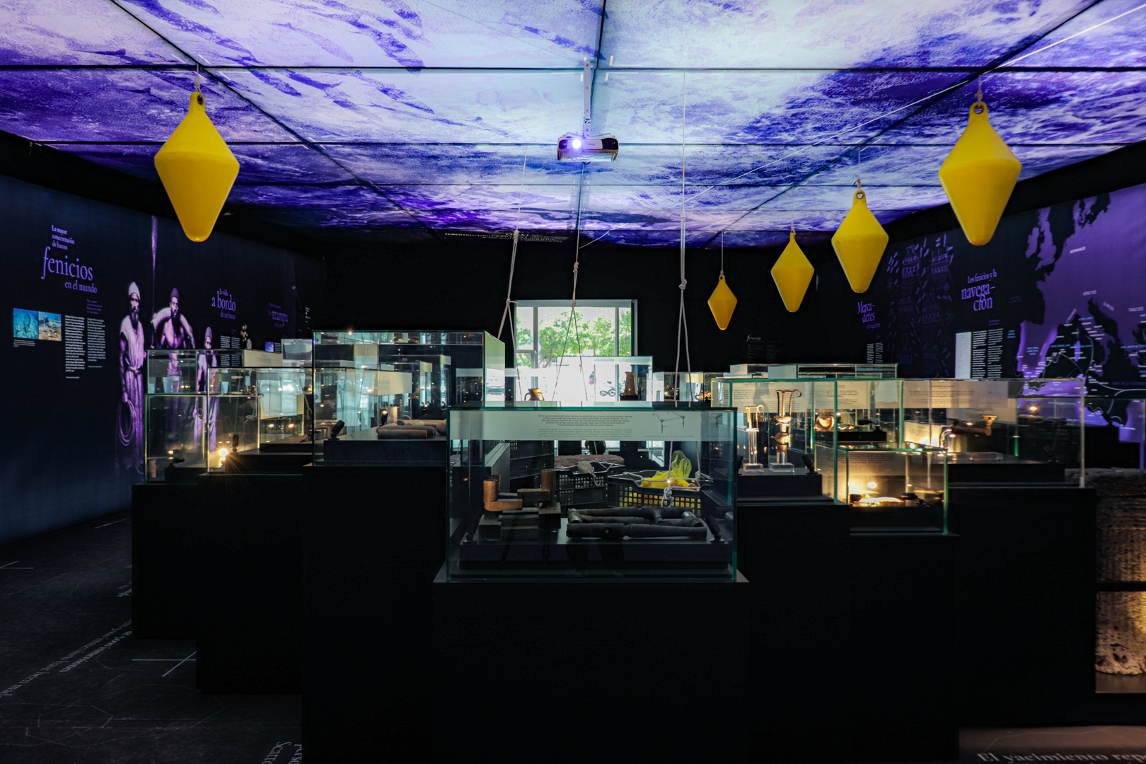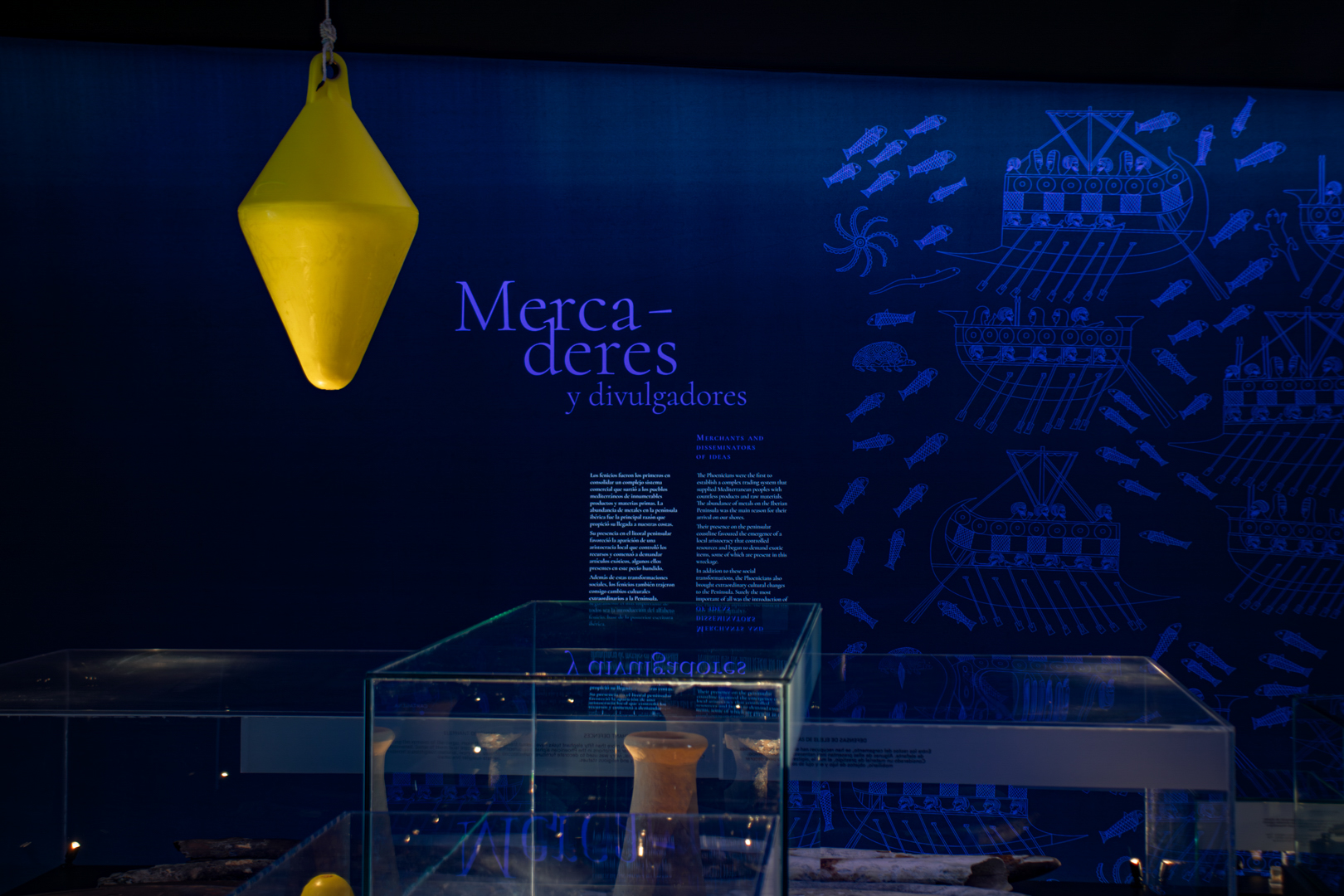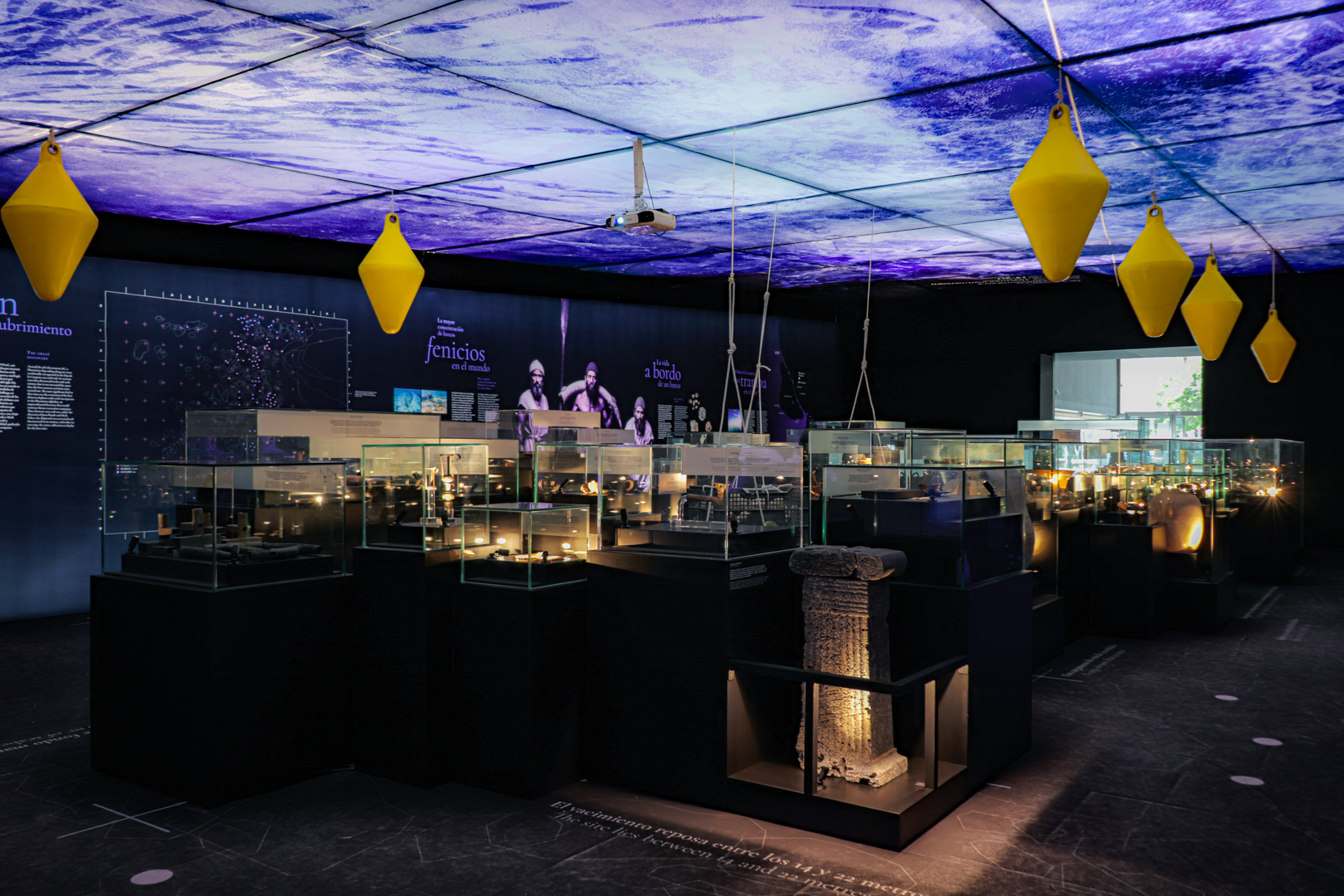 El espacio simula una excavación subacuática, con el lecho marino impreso bajo los pies y una cuadrícula arqueológica que sitúa los objetos en su posición original. Elementos como boyas y estructuras de techo evocan el agua, generando una experiencia inmersiva que permite al visitante comprender el cargamento expuesto en vitrinas, los métodos arqueológicos empleados y el comercio fenicio desde el lugar mismo del hallazgo, envuelto perimetralmente en una estructura de gráfica retroiluminada que ofrece la información interpretativa e histórica de la muestra.