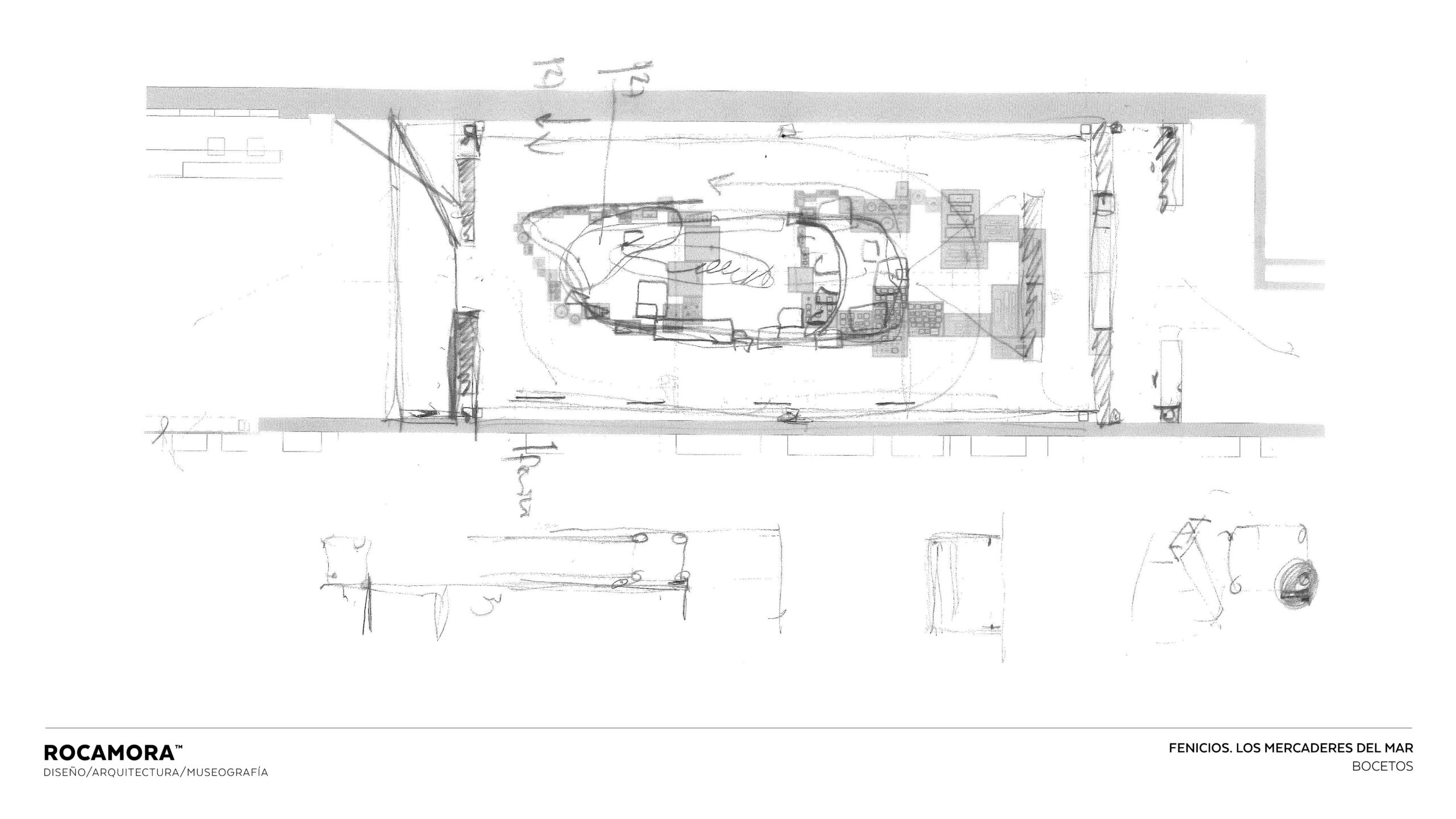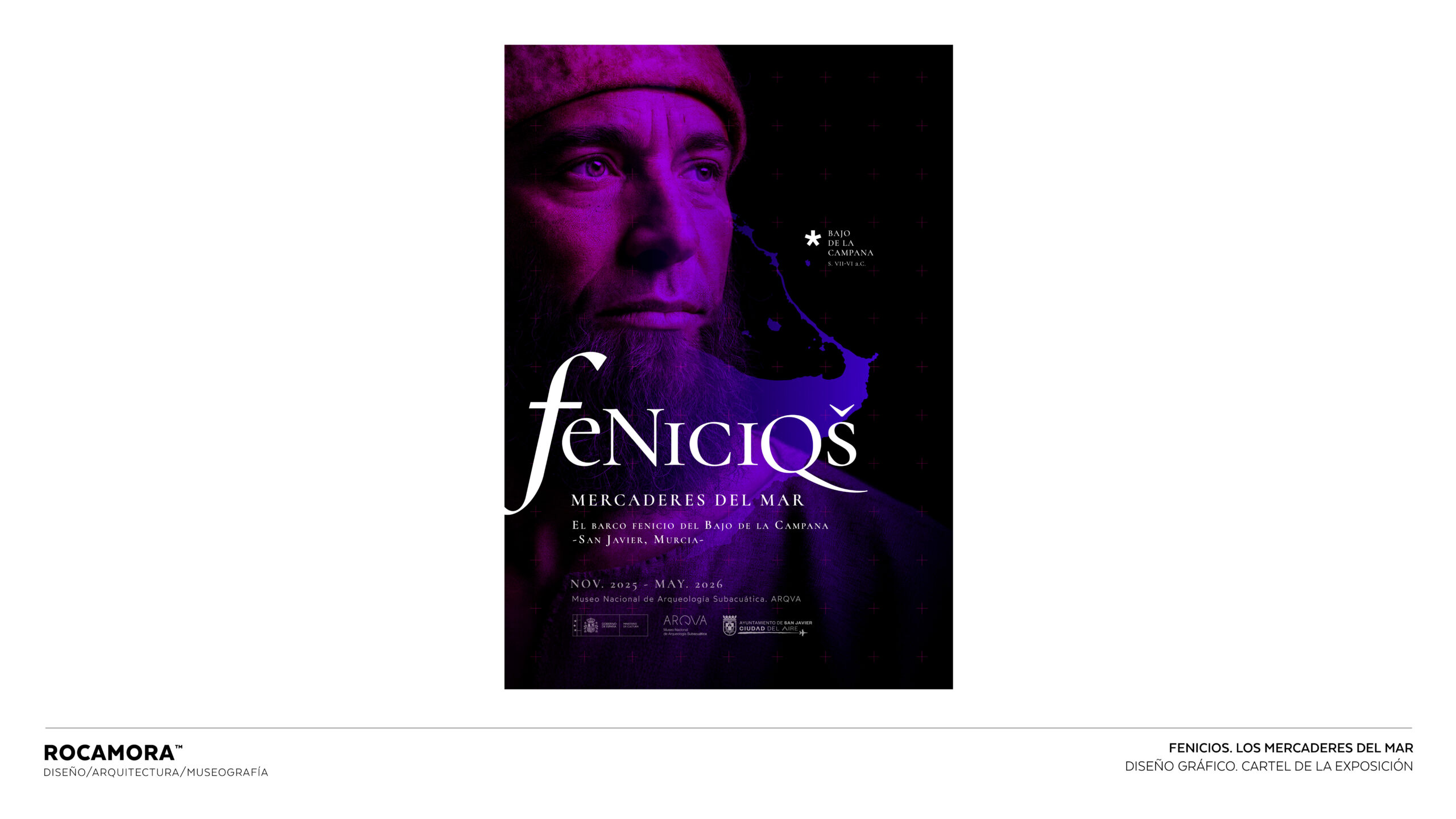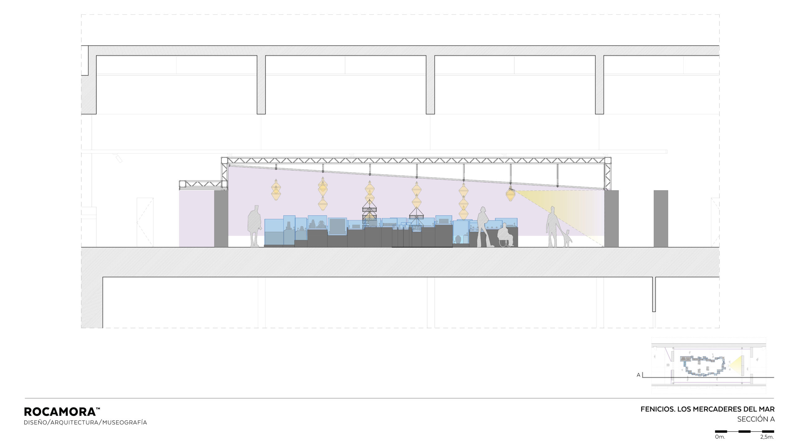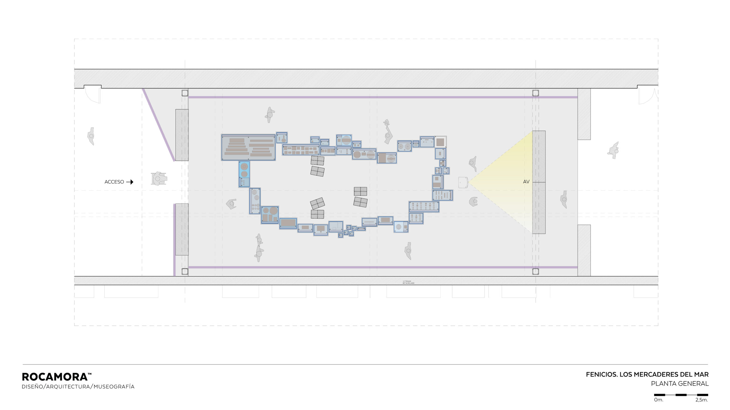 El espacio simula una excavación subacuática, con el lecho marino impreso bajo los pies y una cuadrícula arqueológica que sitúa los objetos en su posición original. Elementos como boyas y estructuras de techo evocan el agua, generando una experiencia inmersiva que permite al visitante comprender el cargamento expuesto en vitrinas, los métodos arqueológicos empleados y el comercio fenicio desde el lugar mismo del hallazgo, envuelto perimetralmente en una estructura de gráfica retroiluminada que ofrece la información interpretativa e histórica de la muestra.