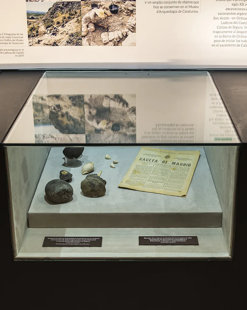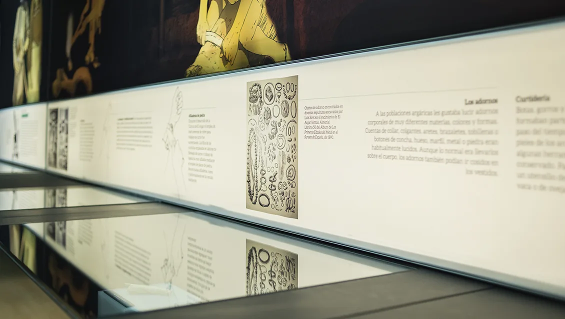 La disposición de la muestra combina modernidad y tradición, con vitrinas iluminadas estratégicamente que destacan los objetos más significativos, mientras que láminas originales del arqueólogo Luis Siret y otras explicaciones gráficas proporcionan un contexto histórico detallado. El espacio, diseñado para facilitar la comprensión del visitante, incluye paneles interpretativos y carteles identificativos que guían a través de los distintos periodos históricos representados.