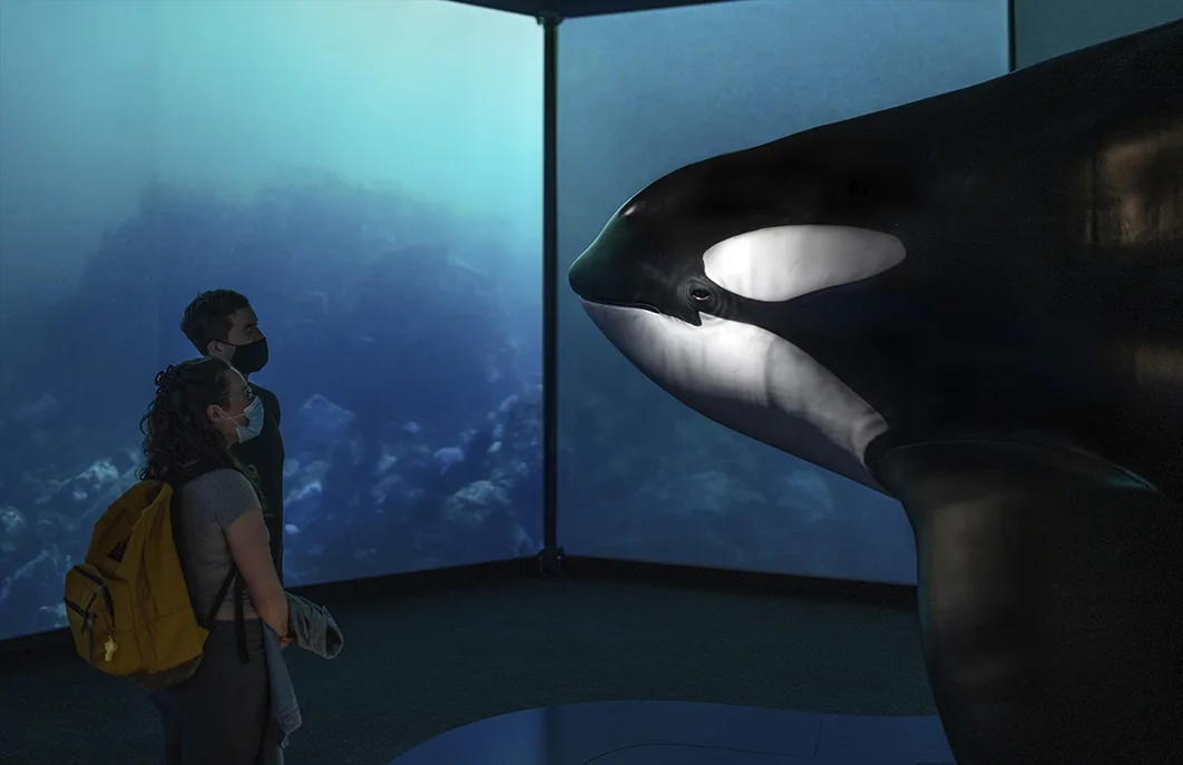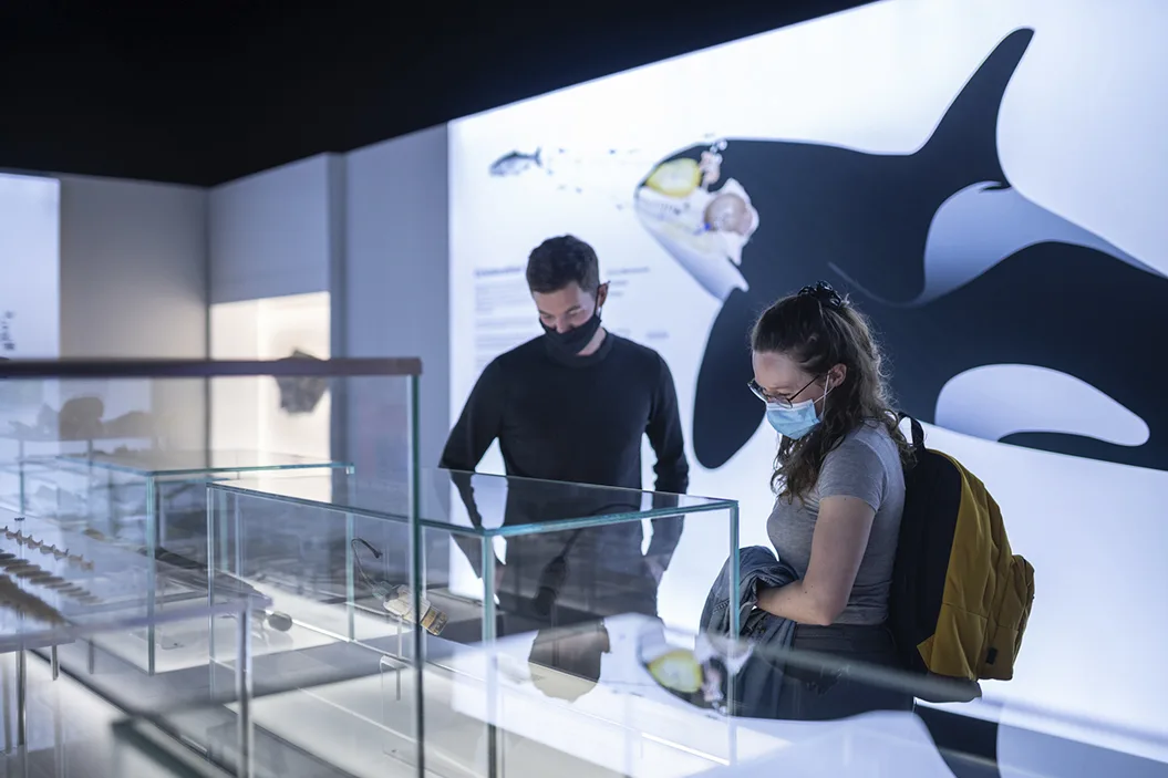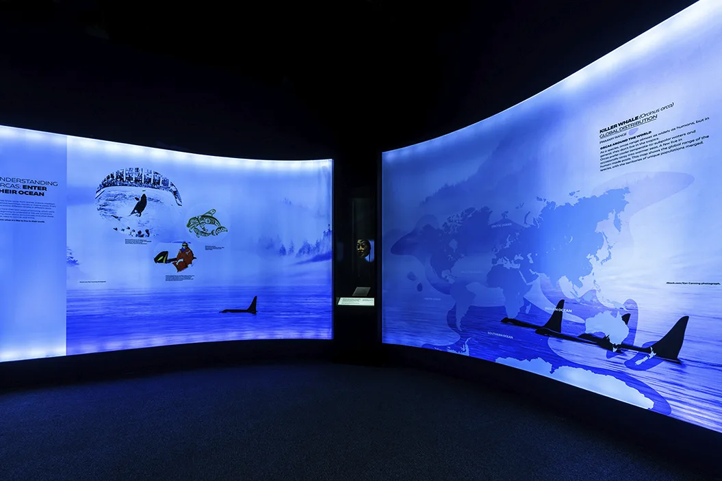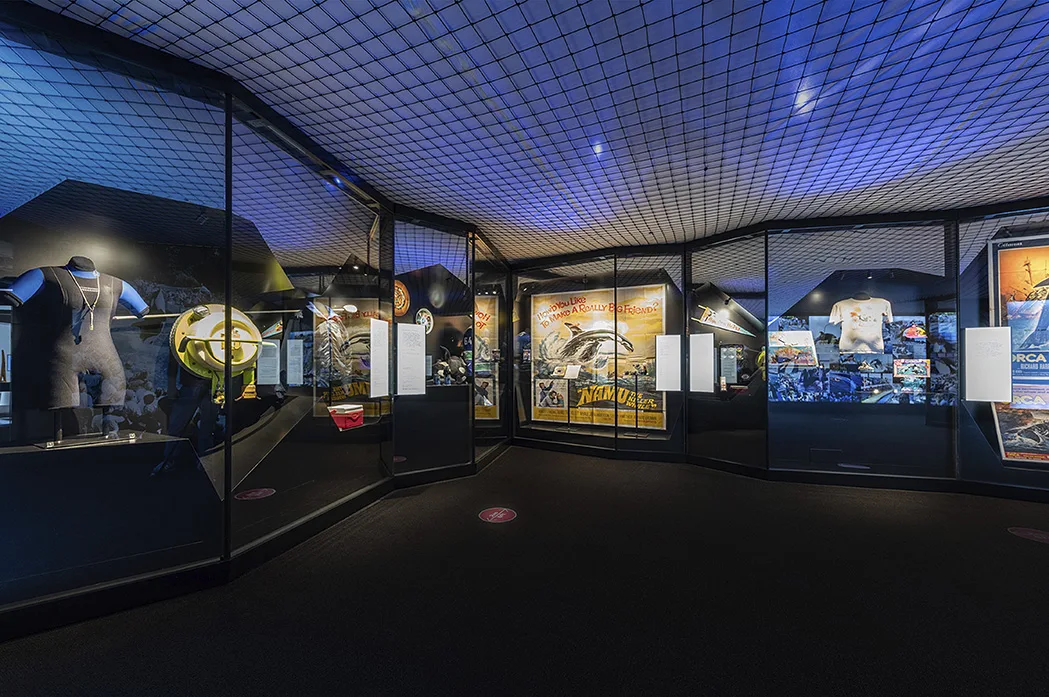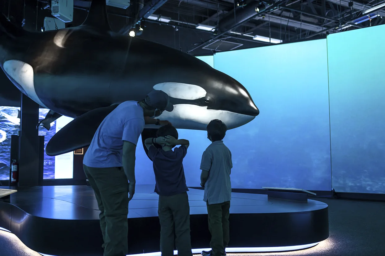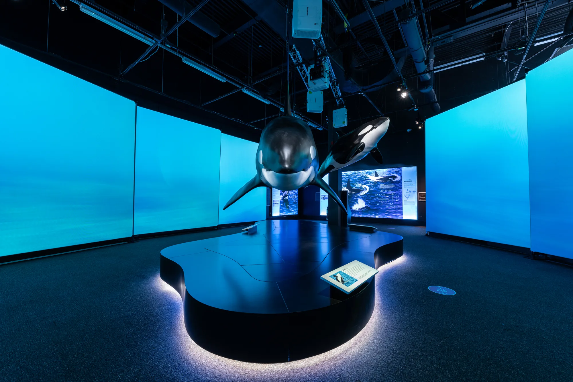 En la exposición, los visitantes exploran el mundo de las orcas desde varias perspectivas. La primera sección profundiza en su biología y zoología, revelando detalles sobre su anatomía, comportamiento, inteligencia y estructura social compleja. A través de esta visión, los asistentes pueden apreciar la extraordinaria biología de estas majestuosas criaturas.