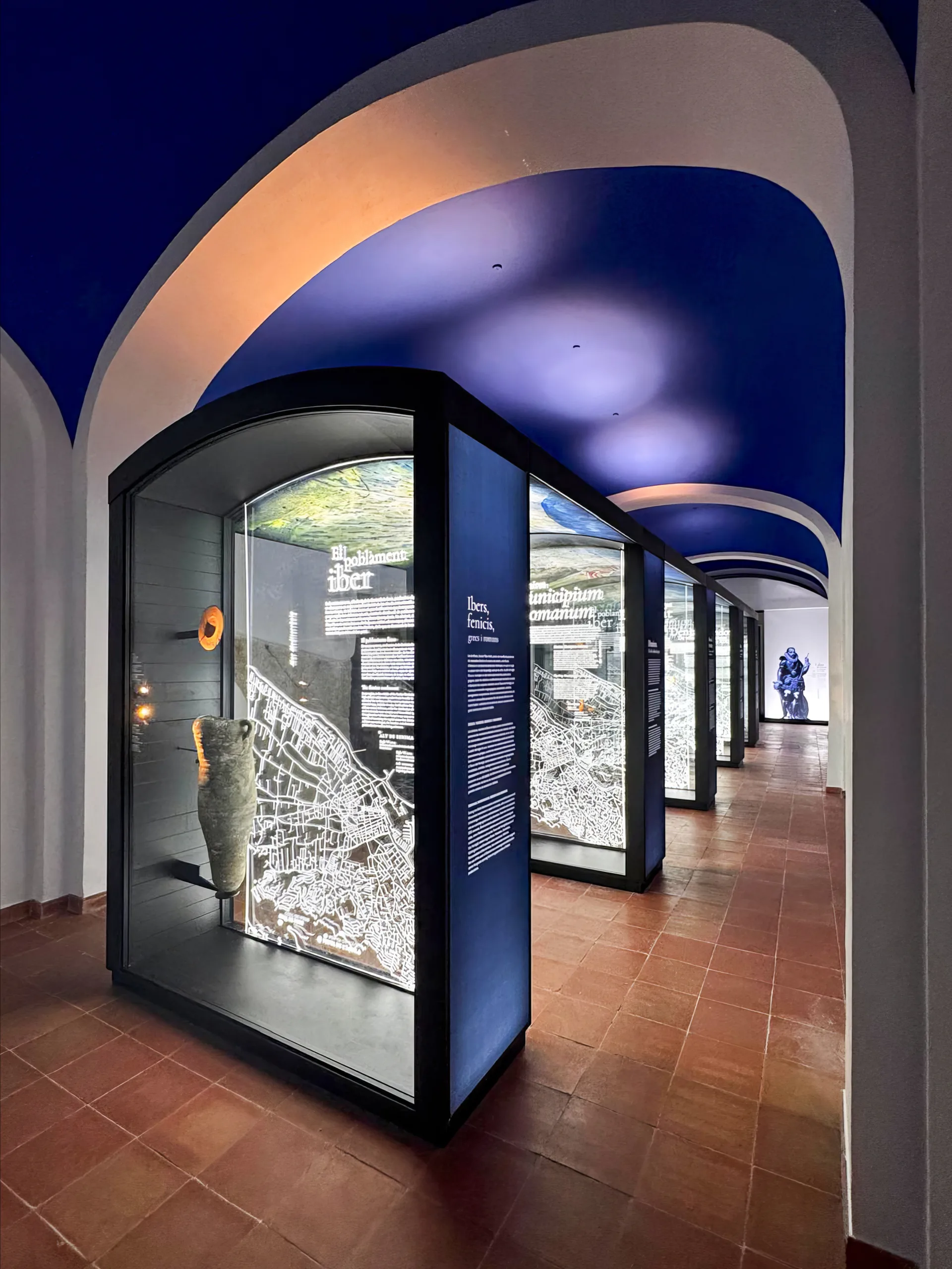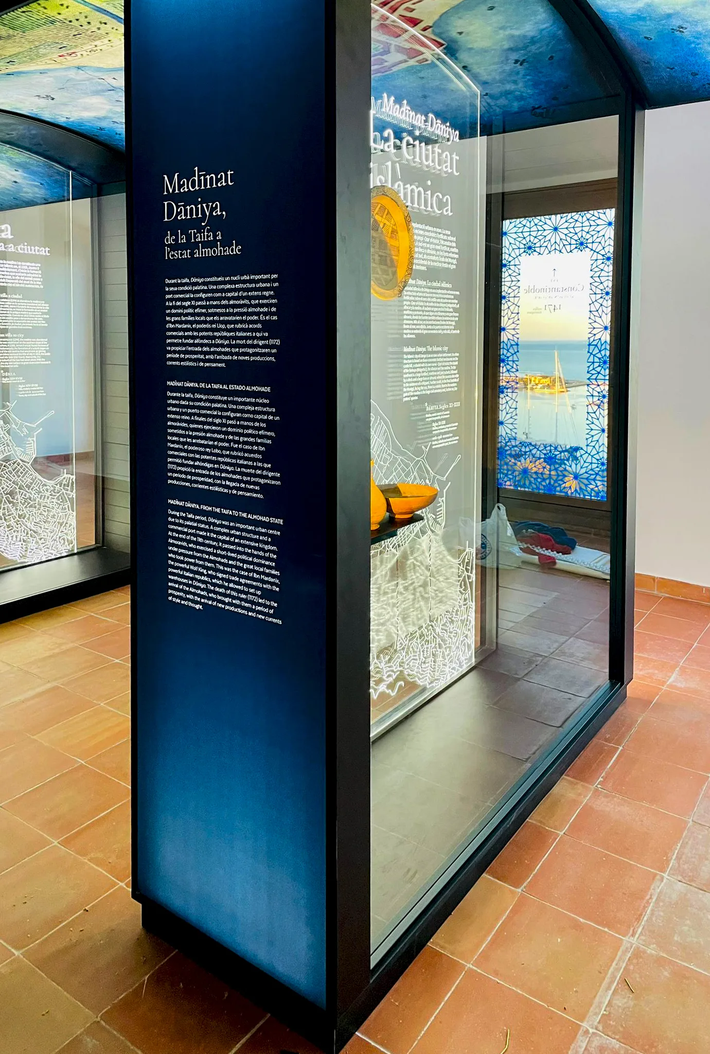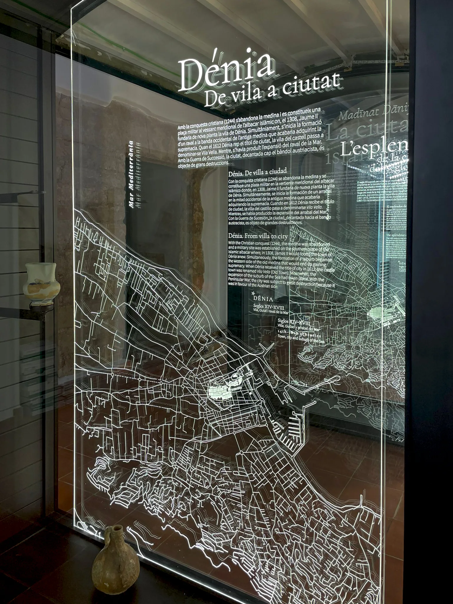 Cada arco incorpora vitrinas con piezas arqueológicas, que cuentan la historia de Denia desde dos perspectivas: