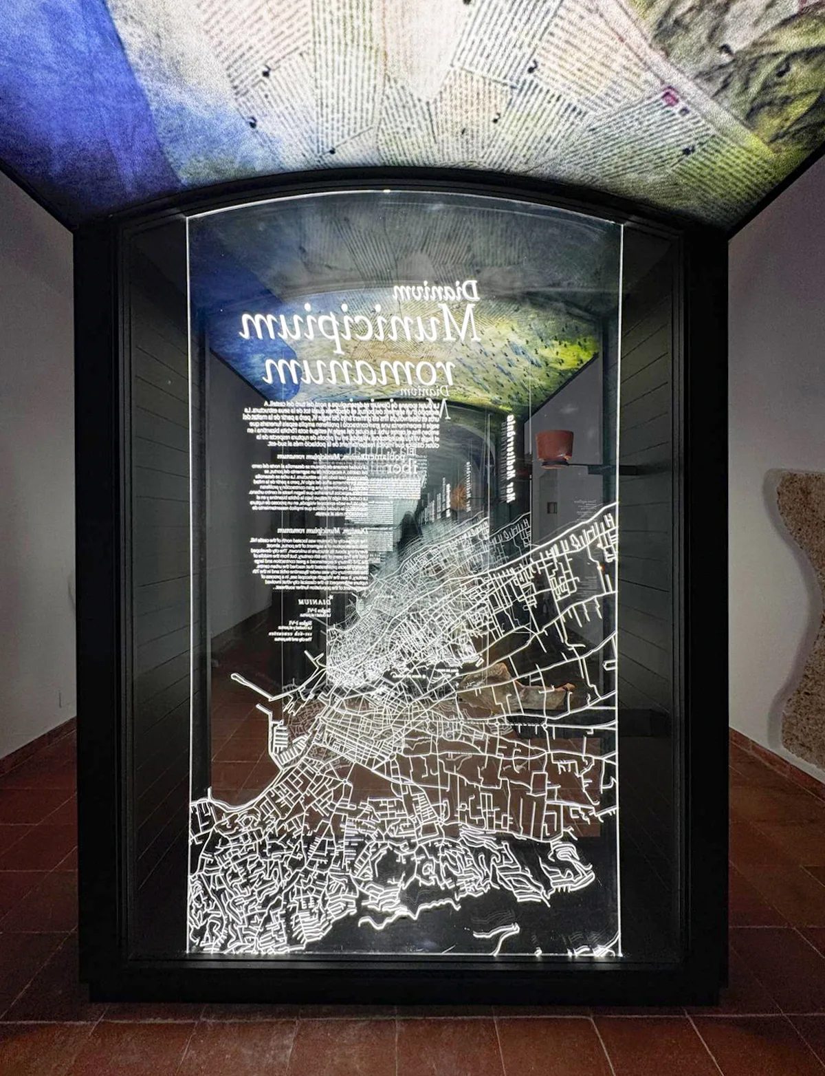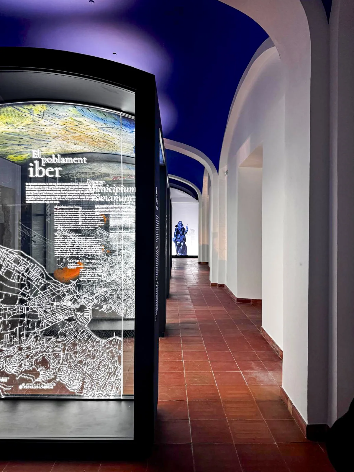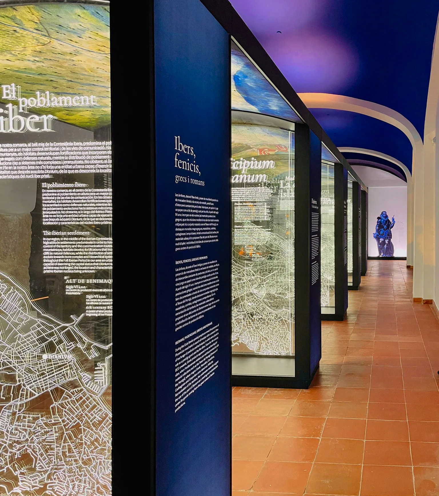 El recorrido comienza con una gran superficie textil retroiluminada, que presenta de forma sintética las etapas históricas que vertebran la exposición. Este recurso permite situar al visitante en la línea del tiempo de la ciudad antes de adentrarse en la exhibición principal.