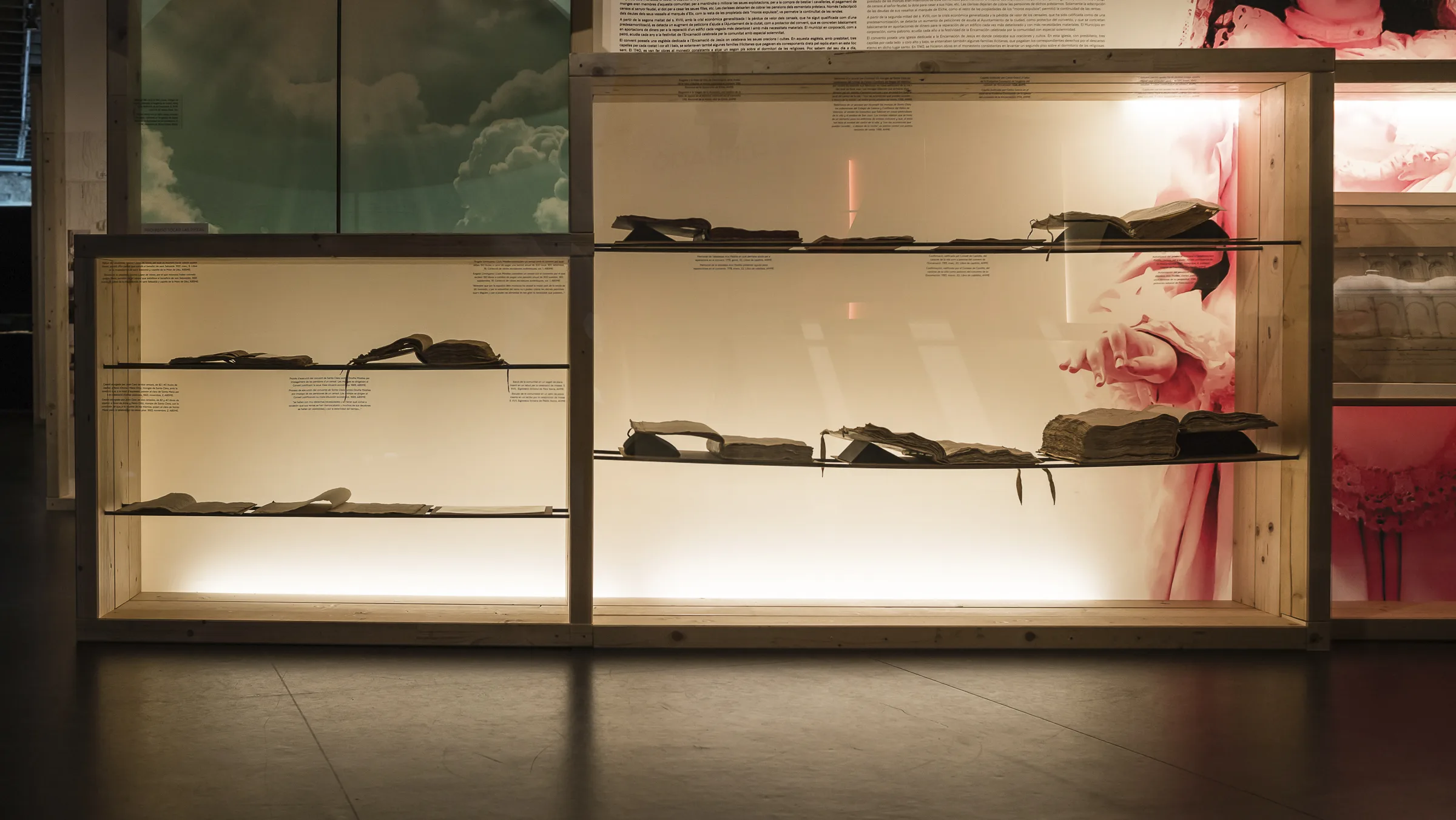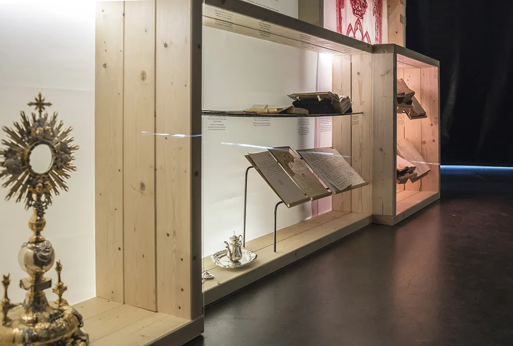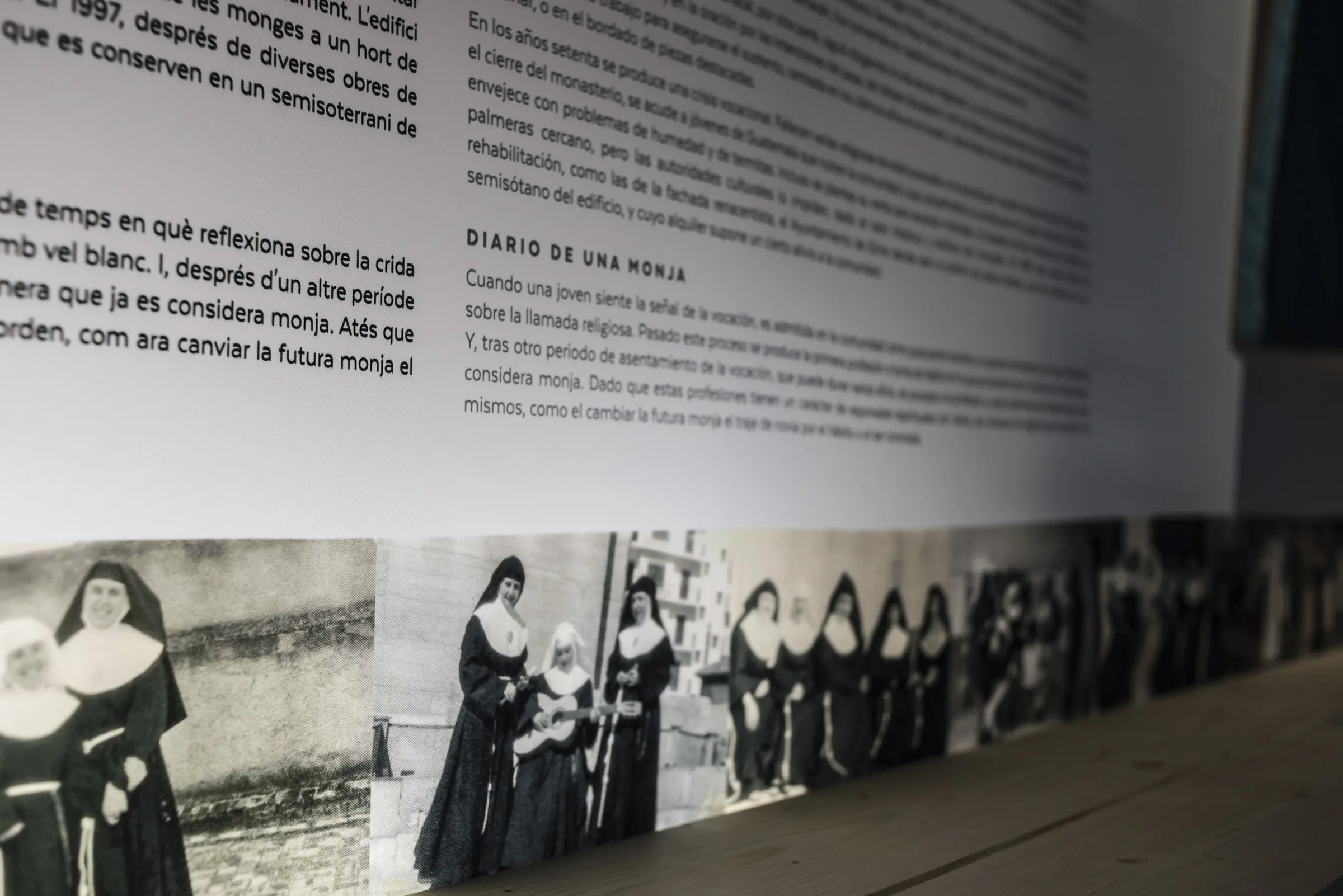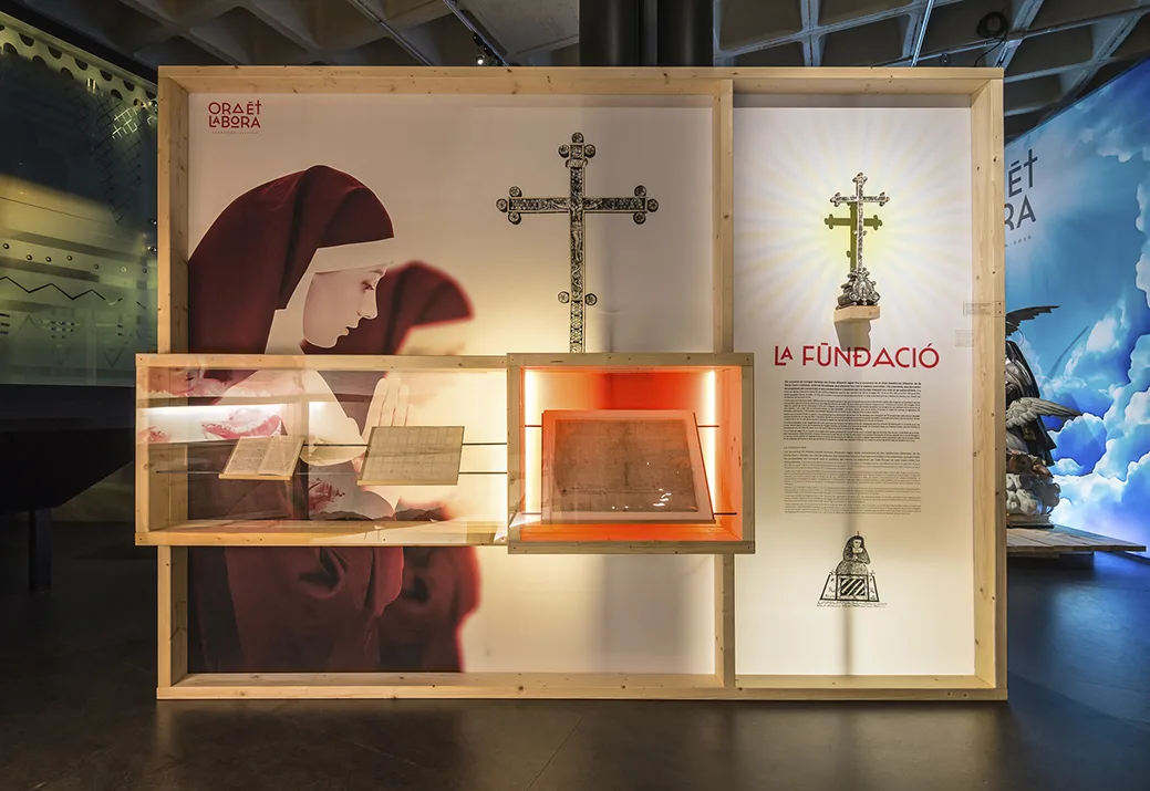 El diseño museográfico de la muestra se centró en proporcionar una narrativa visual y contextual rica, utilizando elementos históricos y testimonios para crear una experiencia inmersiva. La exposición incluyó piezas destacadas como el pergamino original de la fundación del primer convento, dos imágenes veneradas por las monjas, un dibujo de 1865 que documenta el antiguo convento y un libro de actas original preservado en el archivo de la orden. Estos objetos se presentaron en vitrinas cuidadosamente diseñadas para resaltar su relevancia y facilitar la apreciación detallada por parte del visitante.