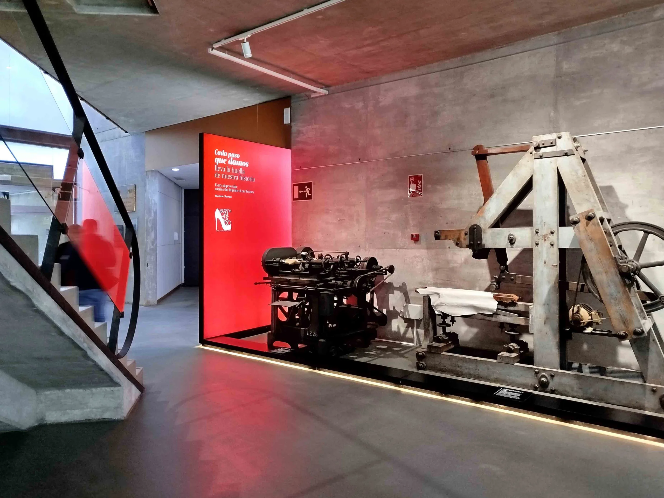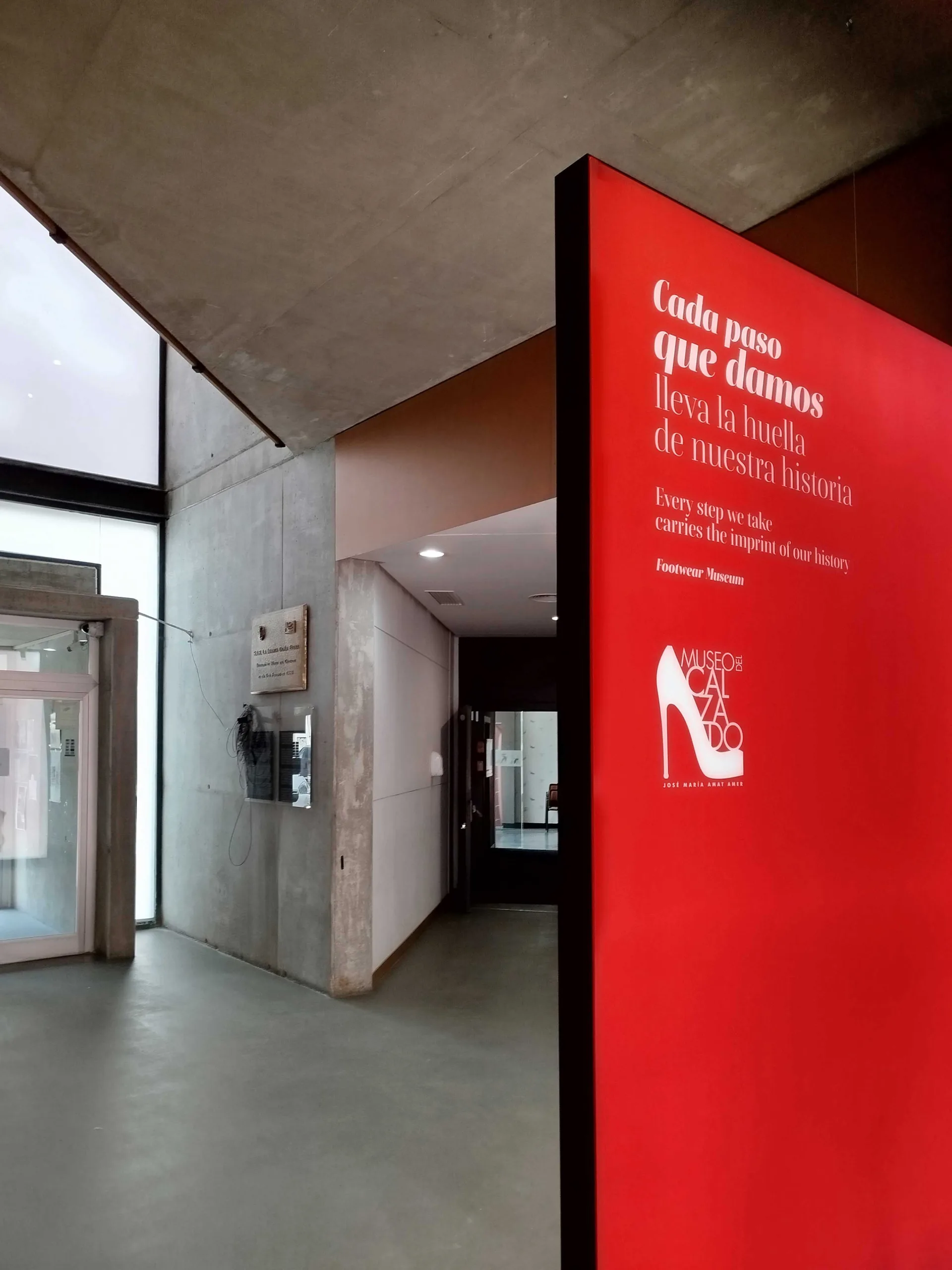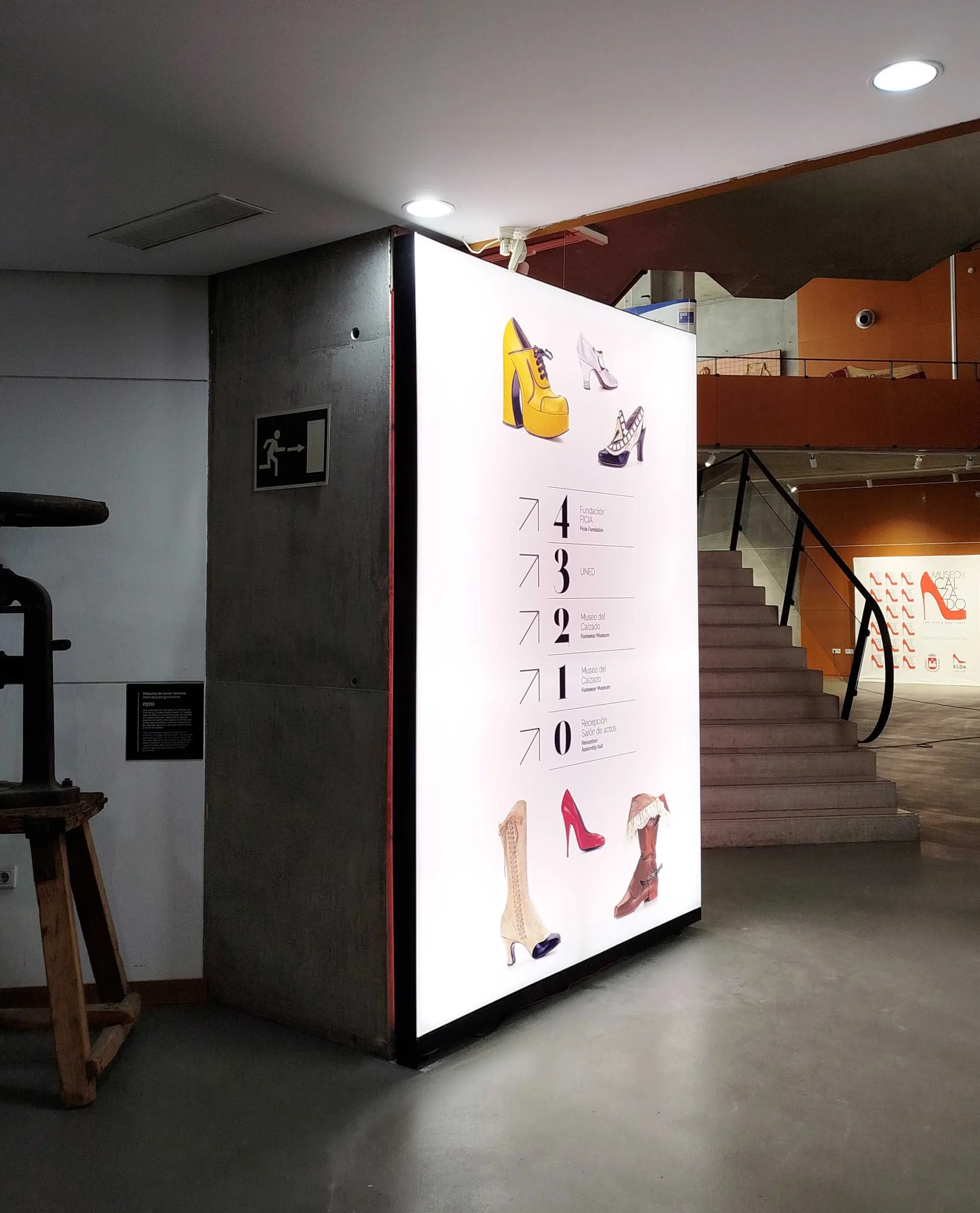 Desde la entrada del museo, se ha implementado un textil impreso de gran formato, retroiluminado por ambas caras. Este elemento funciona como directorio informativo del museo en su frontal, mientras que en la parte trasera introduce al visitante en el patrimonio industrial del calzado. Se ha dispuesto una zona expositiva con maquinaria histórica que narra la industrialización del calzado. Para organizar el espacio, se ha instalado una catenaria en el pavimento que cumple una doble función: soporte para cartelas informativas y separación entre la zona de circulación y el área expositiva.