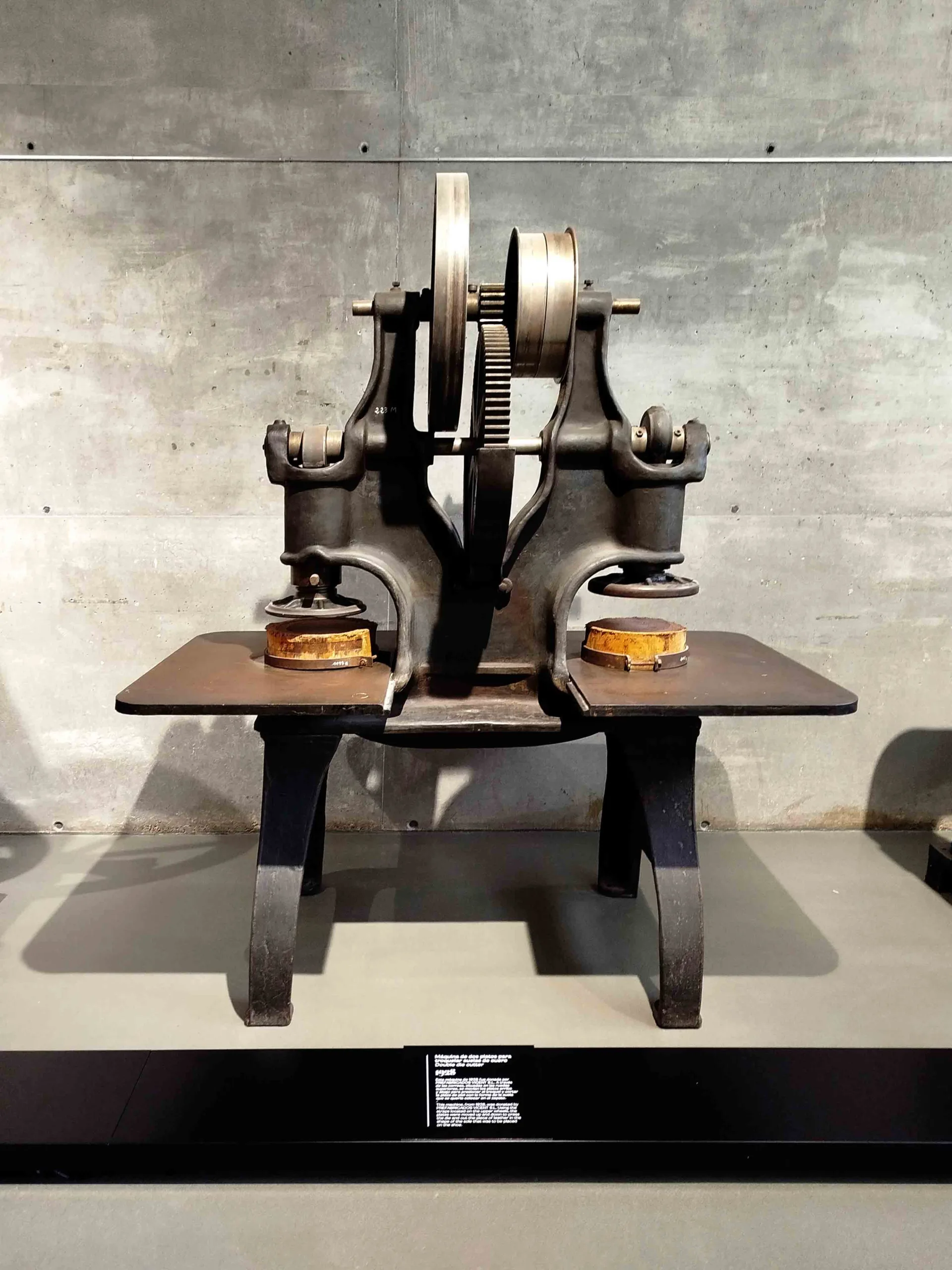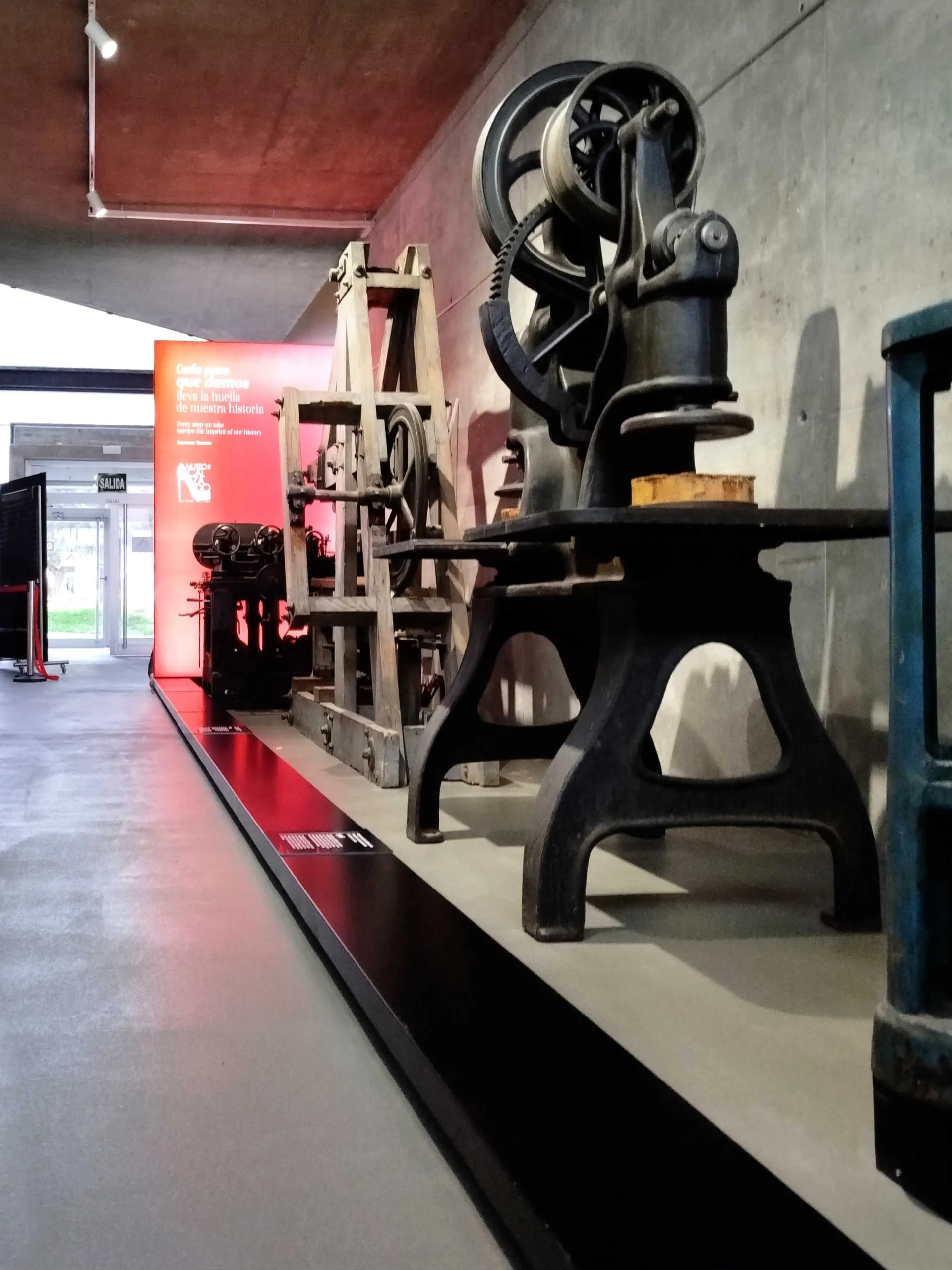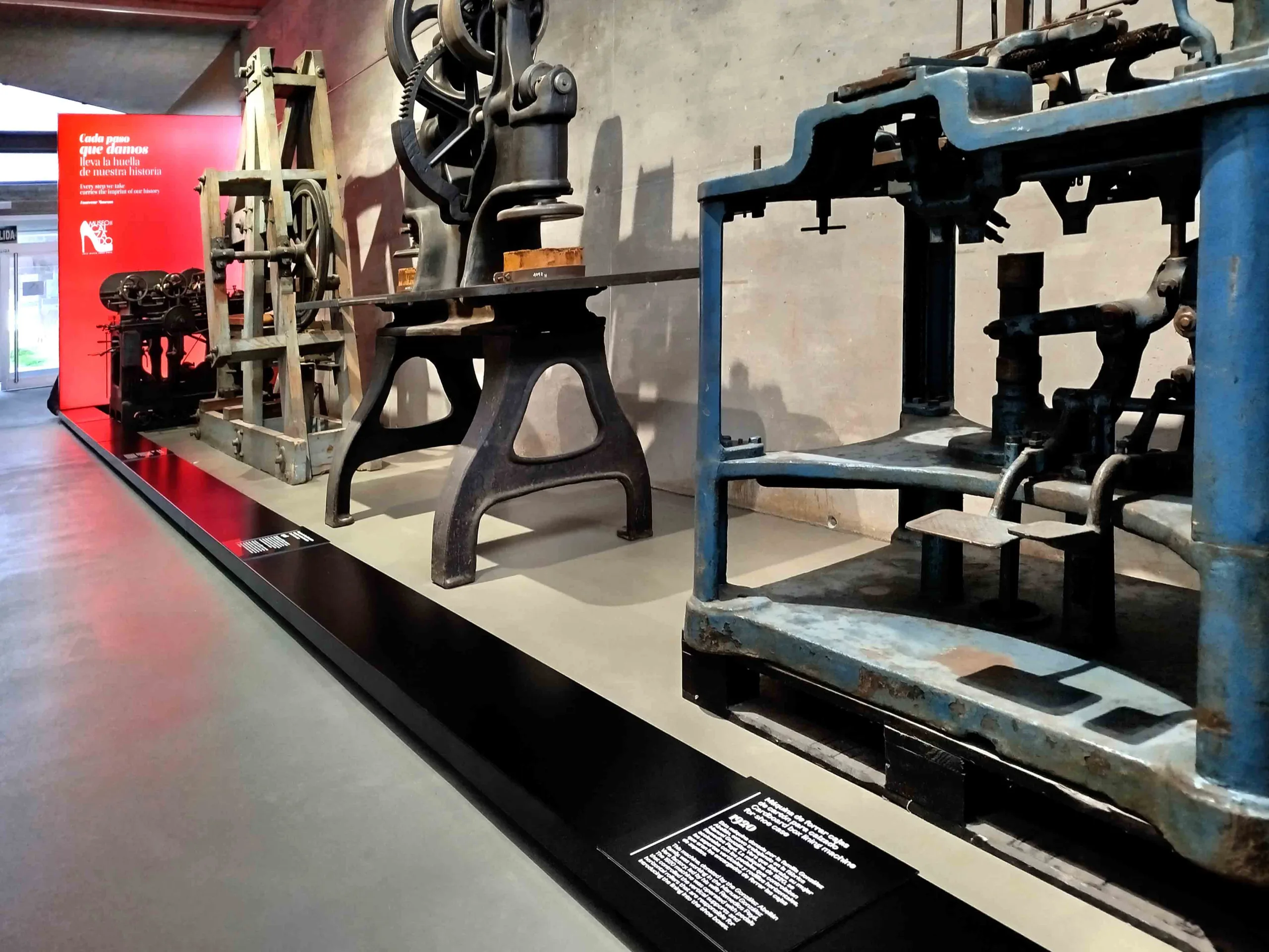 Desde la entrada del museo, se ha implementado un textil impreso de gran formato, retroiluminado por ambas caras. Este elemento funciona como directorio informativo del museo en su frontal, mientras que en la parte trasera introduce al visitante en el patrimonio industrial del calzado. Se ha dispuesto una zona expositiva con maquinaria histórica que narra la industrialización del calzado. Para organizar el espacio, se ha instalado una catenaria en el pavimento que cumple una doble función: soporte para cartelas informativas y separación entre la zona de circulación y el área expositiva.