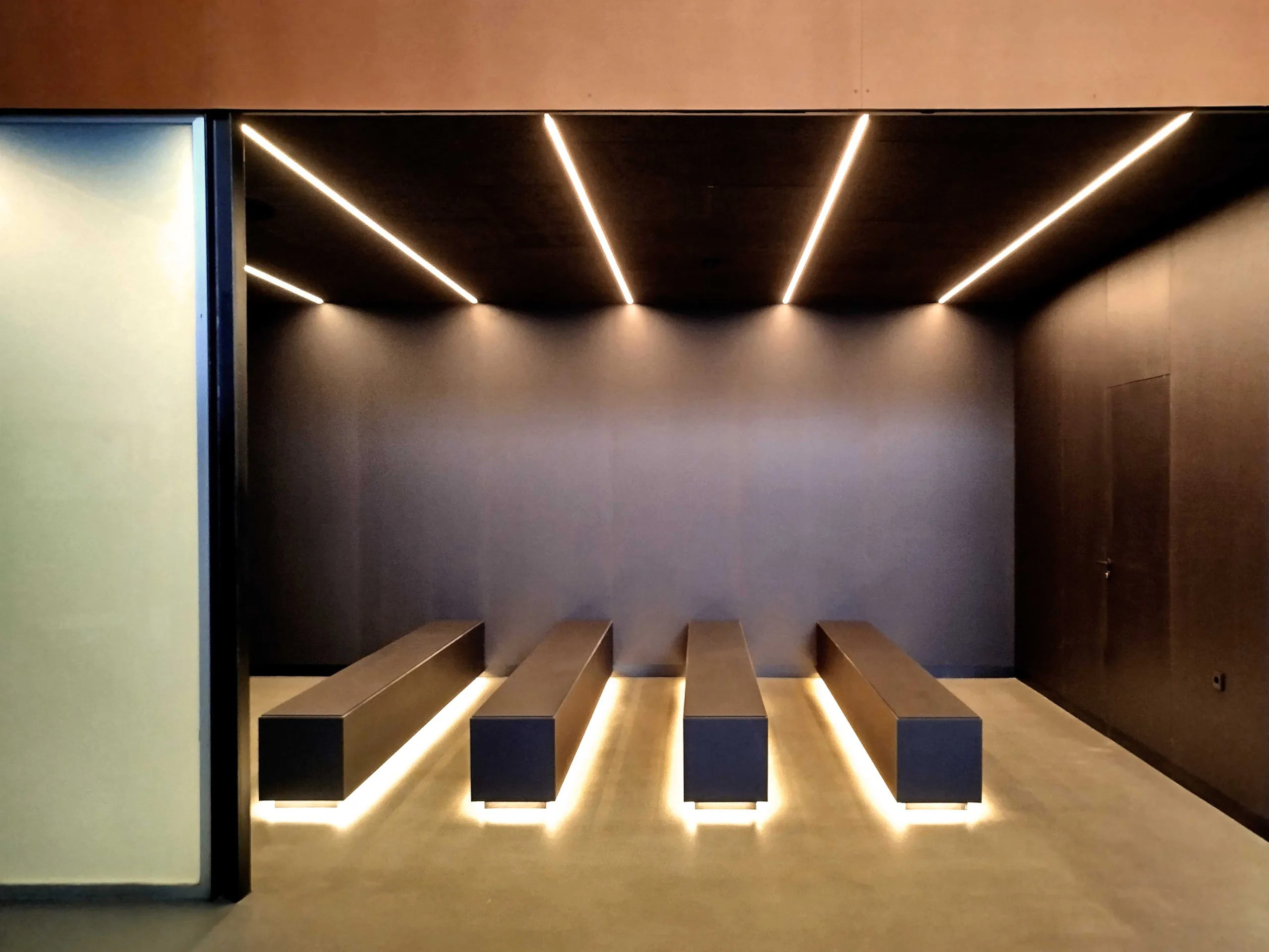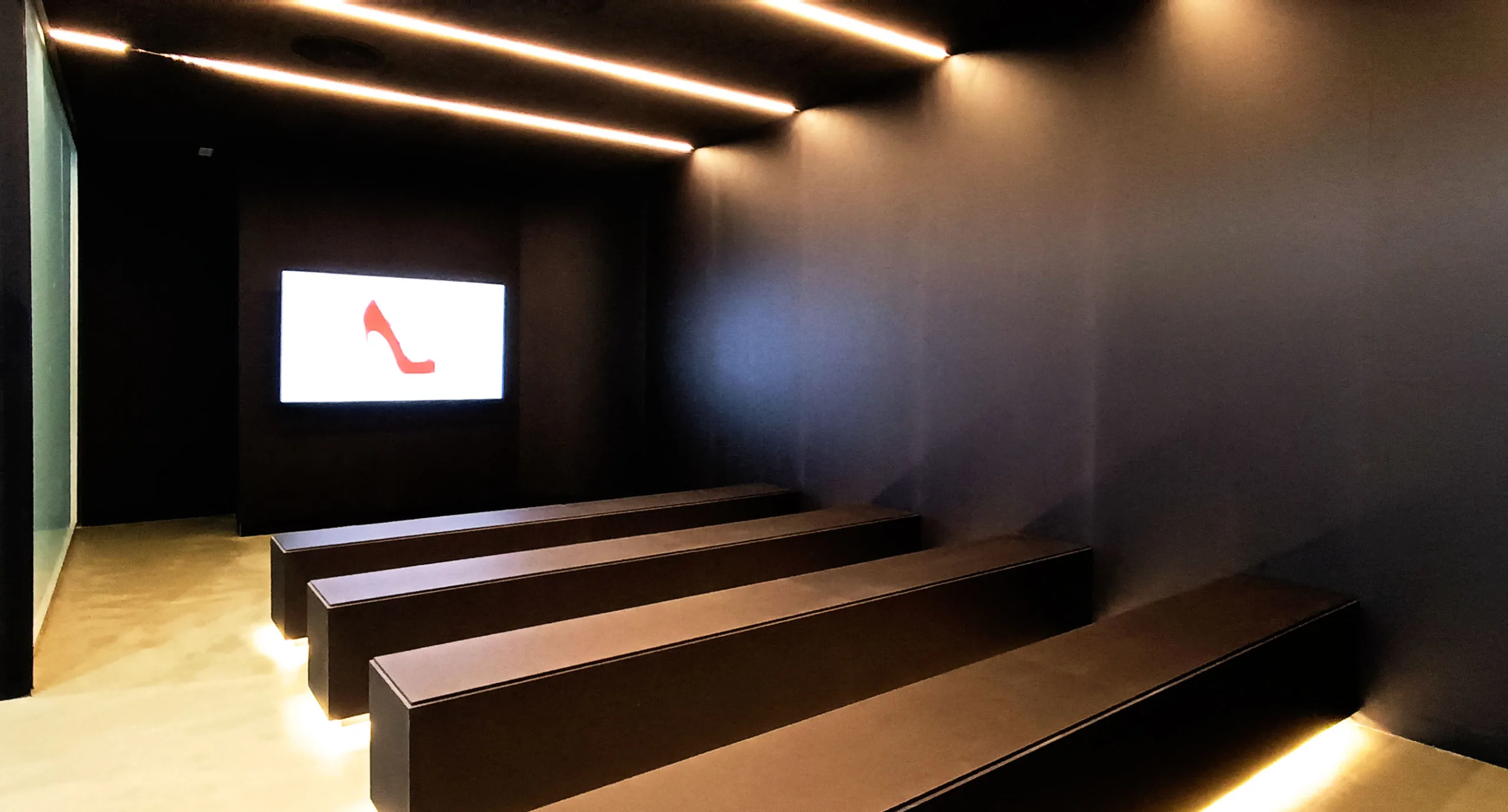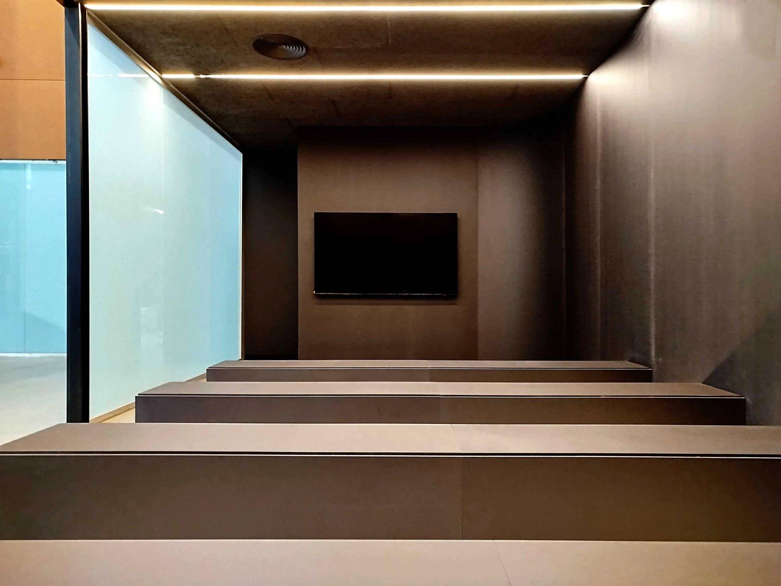 Para la introducción al recorrido museográfico, se ha habilitado una sala de proyección audiovisual, equipada con una pantalla de proyección y un proyector LED, bancos con iluminación inferior para facilitar la circulación sin interferir en la proyección y un punto de conexión en el techo para mejorar la disposición del proyector.