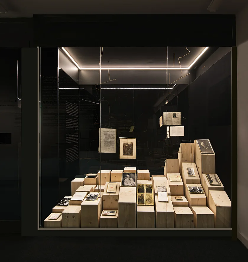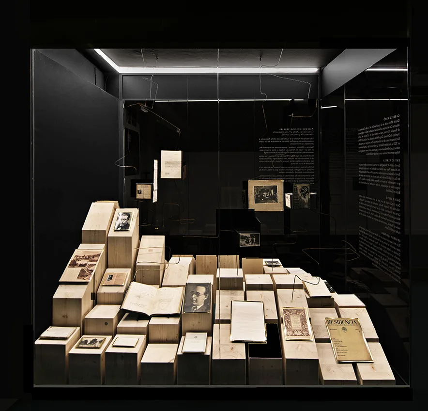 La propuesta museográfica iguala el soporte para los cinco autores, una topografía natural, de madera, valorando con sus sinuosidades o adaptaciones el material expuesto, grafiando en estos movimientos los sobresaltos en sus vidas, los puntos de coincidencia, los desacuerdos y los éxitos, los viajes, los momentos de ocio o los de creación.