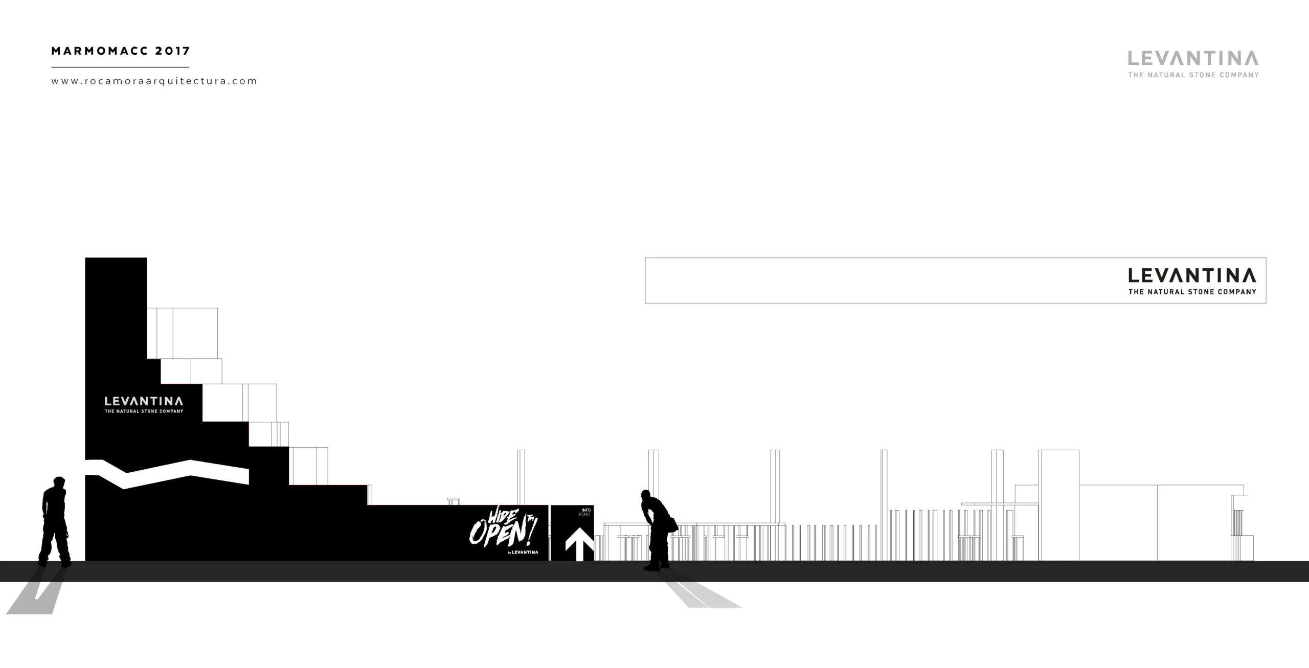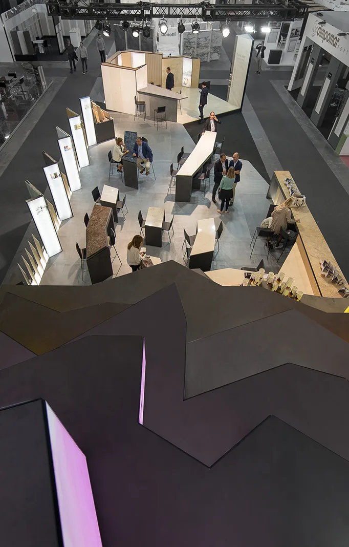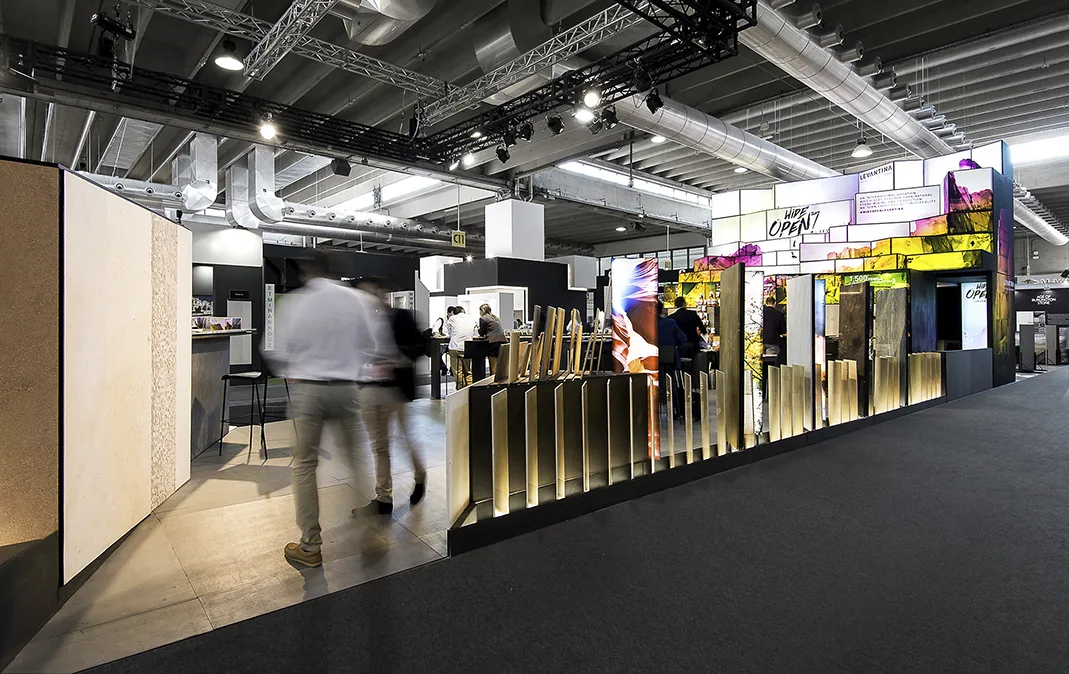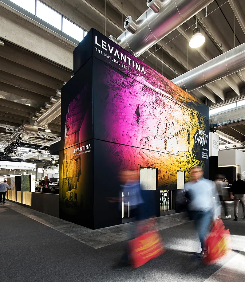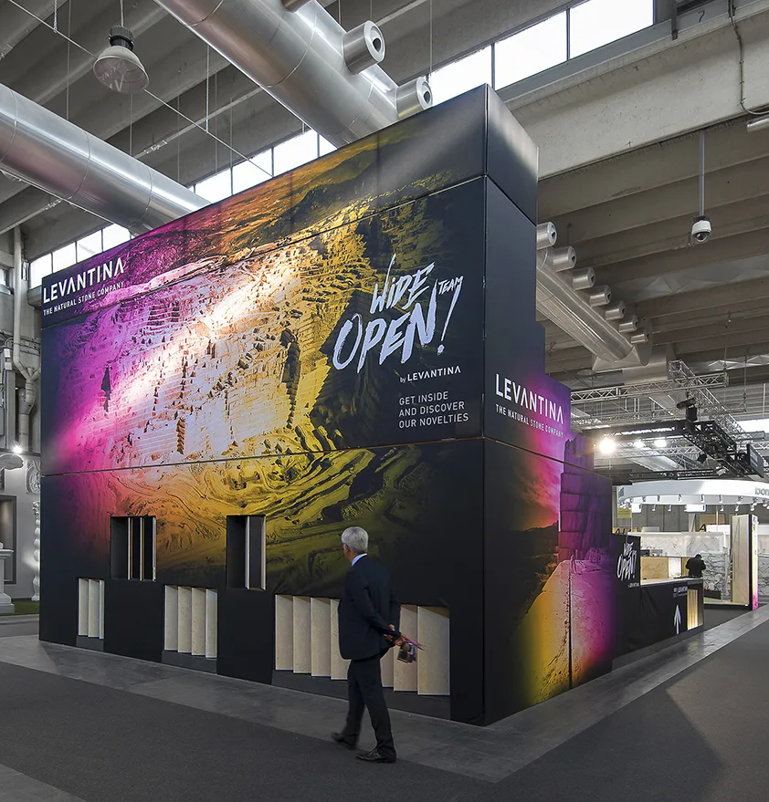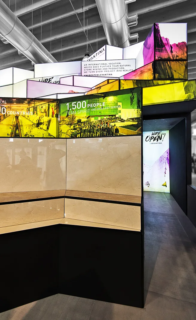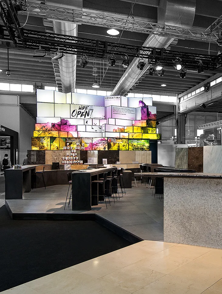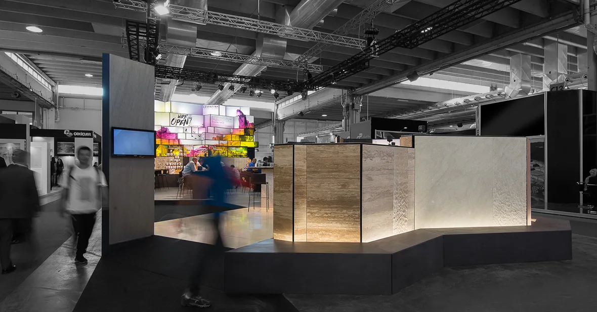 El diseño del stand comercial para LEVANTINA en la feria de Marmomacc 2017 se centró en crear un espacio que reflejara la esencia y calidad de los materiales de la empresa, mientras se ofrecía una experiencia inmersiva a los visitantes. El stand fue concebido como un espacio abierto y fluido, donde la piedra natural se presentó no solo como un producto, sino como parte de una narrativa arquitectónica más amplia. Las superficies de mármol y otros materiales de Levantina se integraron en un diseño que combinaba estética y funcionalidad, utilizando grandes paneles que destacaban por su impresionante tamaño y su colocación estratégica.