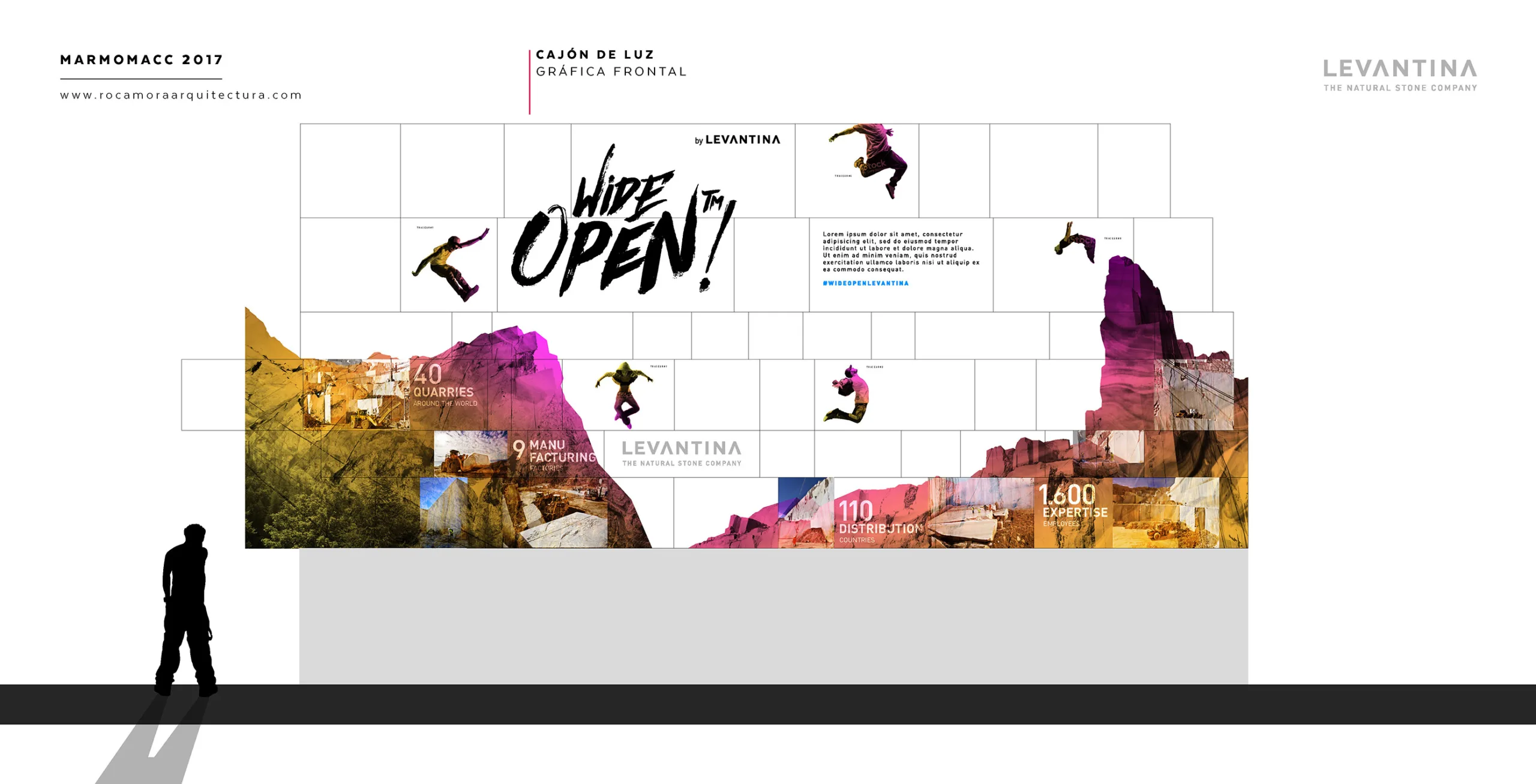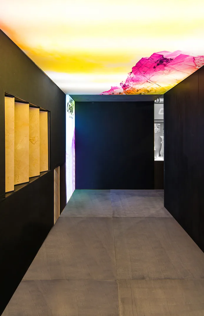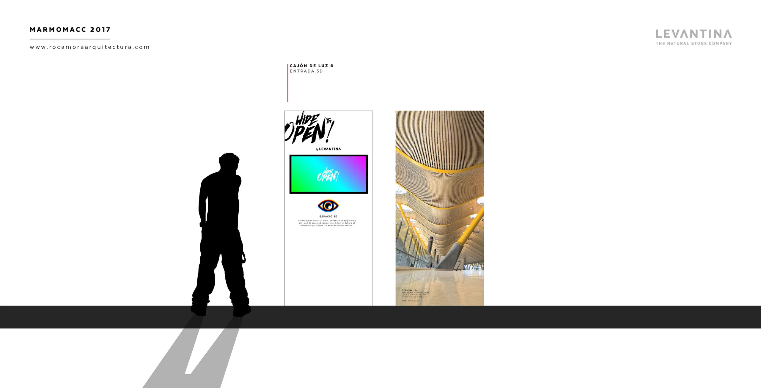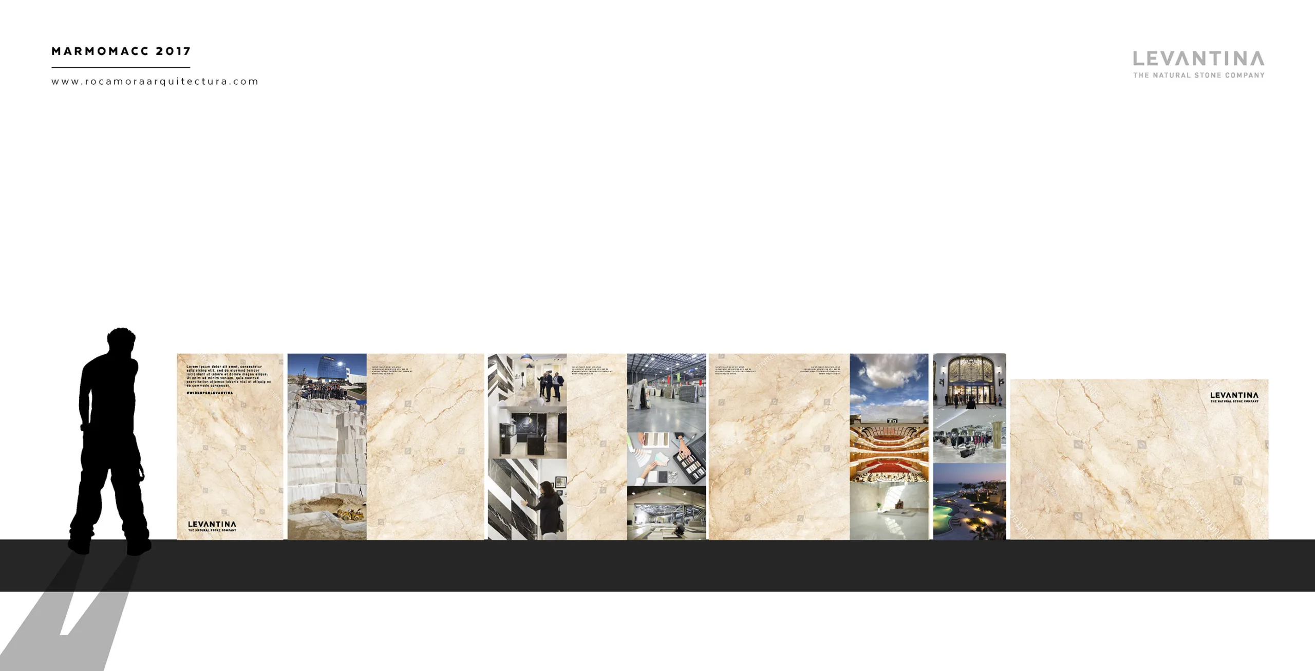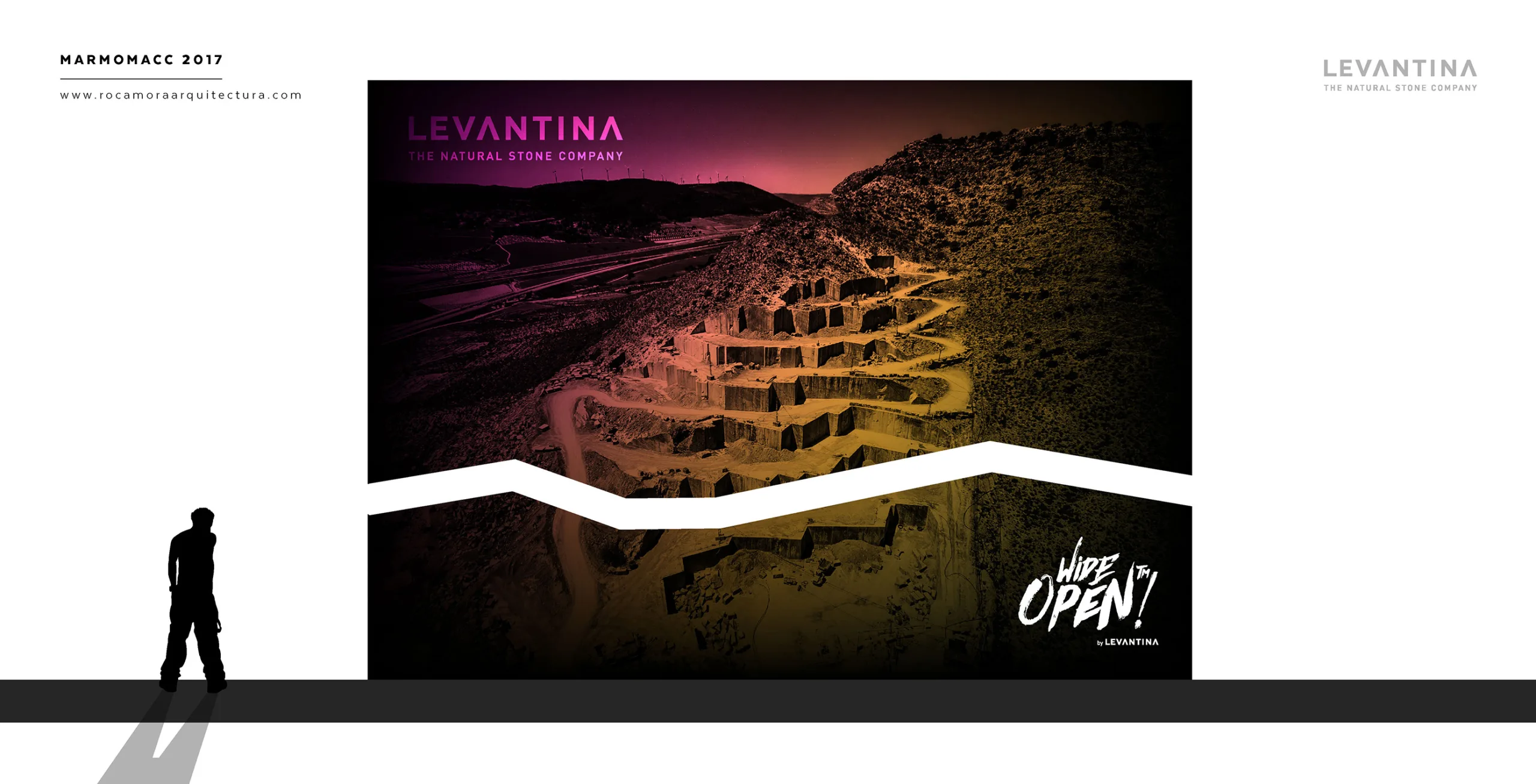 El diseño del stand comercial para LEVANTINA en la feria de Marmomacc 2017 se centró en crear un espacio que reflejara la esencia y calidad de los materiales de la empresa, mientras se ofrecía una experiencia inmersiva a los visitantes. El stand fue concebido como un espacio abierto y fluido, donde la piedra natural se presentó no solo como un producto, sino como parte de una narrativa arquitectónica más amplia. Las superficies de mármol y otros materiales de Levantina se integraron en un diseño que combinaba estética y funcionalidad, utilizando grandes paneles que destacaban por su impresionante tamaño y su colocación estratégica.