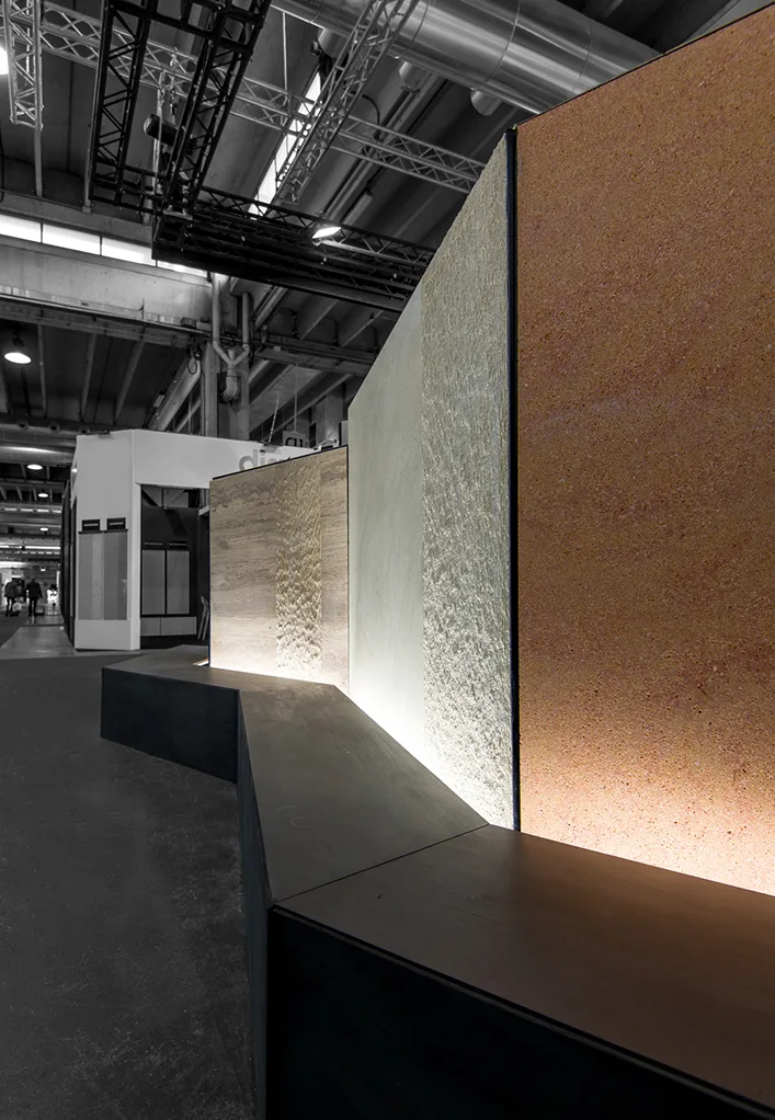 El concepto del stand giró en torno a la creación de una atmósfera acogedora y sofisticada, donde los visitantes pudieran moverse libremente, explorar los productos y participar en un diálogo directo con la marca. Las estructuras modulares del stand permitieron una distribución dinámica, facilitando la circulación y el descubrimiento de los diferentes materiales expuestos. Además, se emplearon soluciones de iluminación cuidadosamente diseñadas para resaltar las texturas y los detalles de los productos, creando contrastes y efectos que potenciaban la experiencia visual.