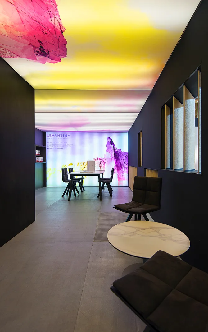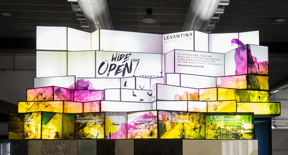 El uso de tecnología en el diseño del stand también jugó un papel importante, con pantallas y dispositivos interactivos que ofrecían información adicional sobre los materiales, sus aplicaciones y los procesos de producción. Esto no solo enriqueció la experiencia del visitante, sino que también subrayó el compromiso de Levantina con la innovación y la vanguardia en el sector de la piedra natural.