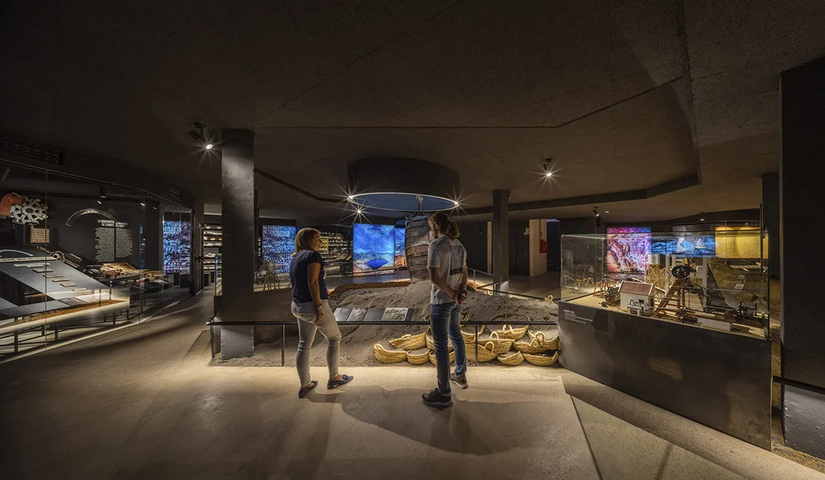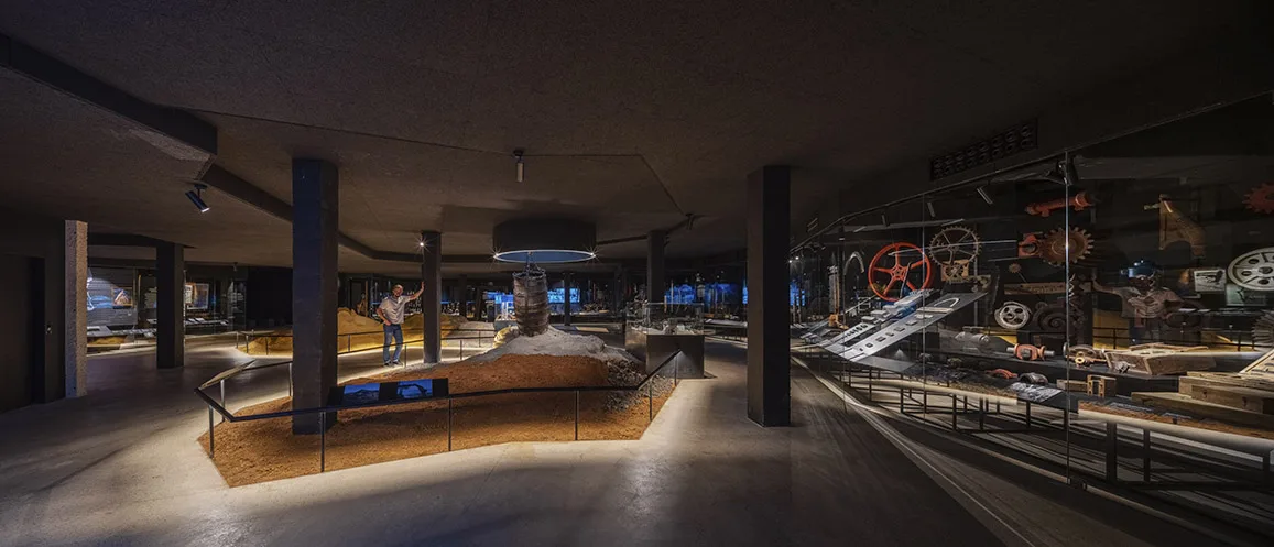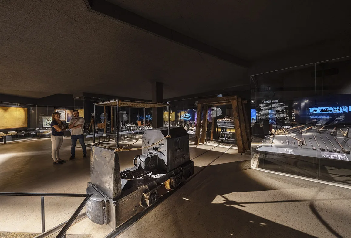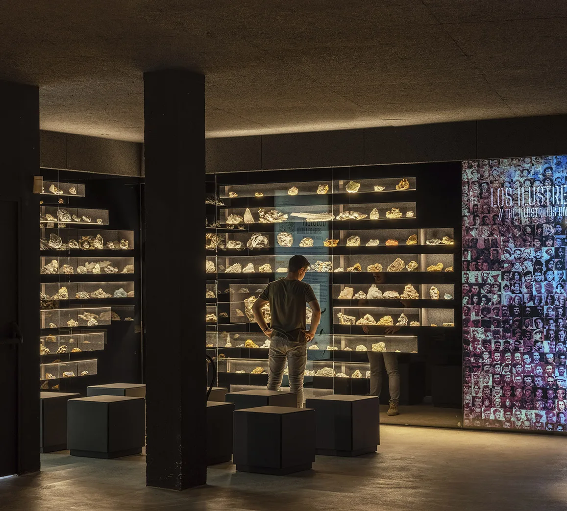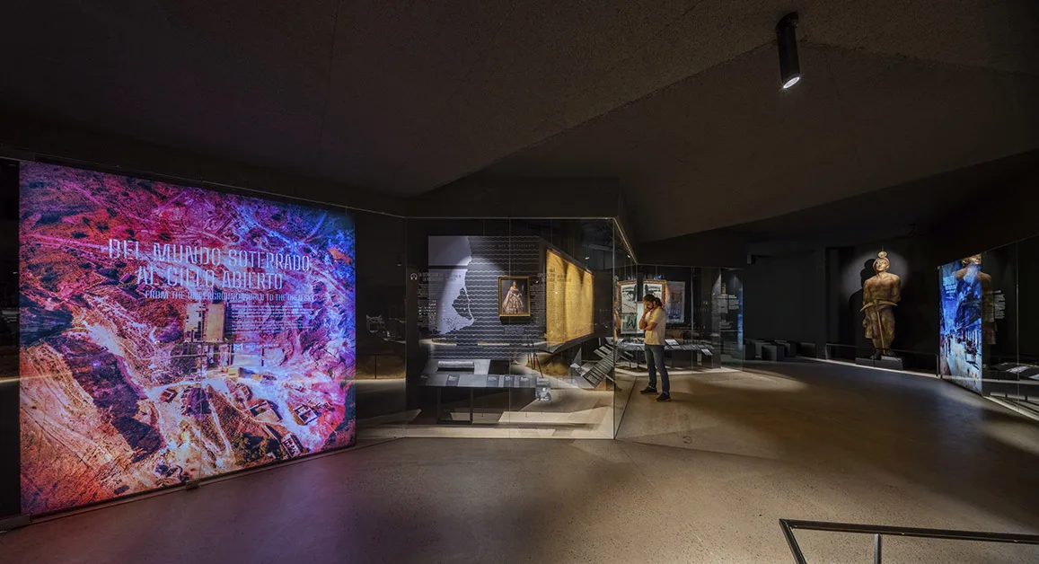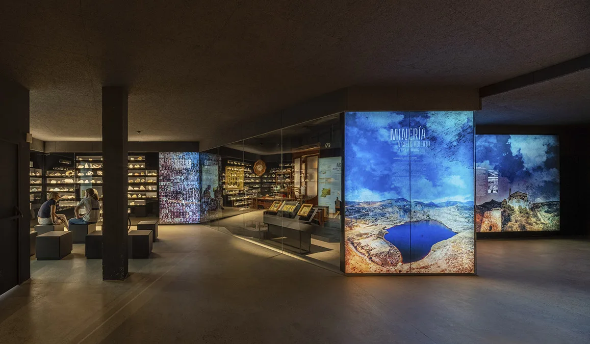 La visita continúa en planta sótano y ofrece un recorrido circular por los distintos temas y ámbitos, con una escenografía central de una explotación minera con aportación de material real. Esta planta no dispone de luz natural, buscando la sensación de inmersión, de vivencia de la experiencia minera, donde la iluminación general se confía a la luz residual de vitrinas para objetos y a la gráfica expositiva, formada a partir de cajones de luz retroiluminados con textiles impresos que contienen la información. Esta situación lumínica convive con la garantía de unas condiciones adecuadas para la visualización de la colección expuesta y un control óptimo de temperatura según demanda de las piezas expuestas en cada caso.