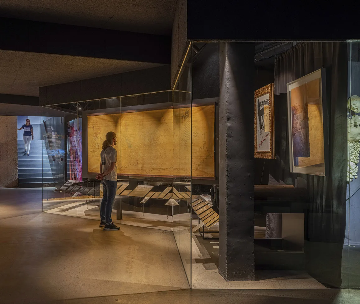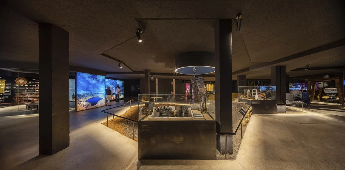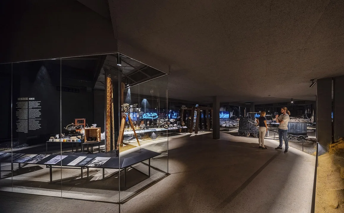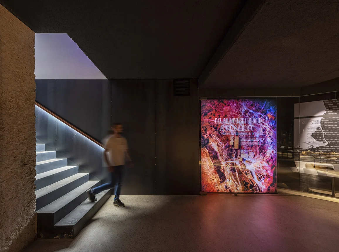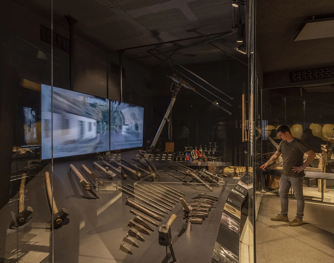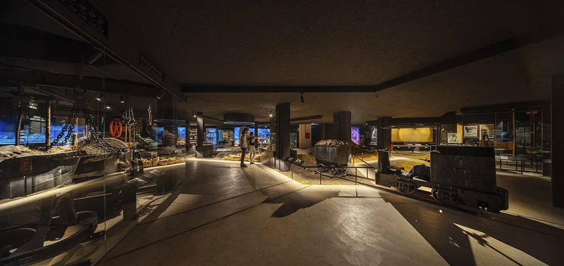 La visita continúa en planta sótano y ofrece un recorrido circular por los distintos temas y ámbitos, con una escenografía central de una explotación minera con aportación de material real. Esta planta no dispone de luz natural, buscando la sensación de inmersión, de vivencia de la experiencia minera, donde la iluminación general se confía a la luz residual de vitrinas para objetos y a la gráfica expositiva, formada a partir de cajones de luz retroiluminados con textiles impresos que contienen la información. Esta situación lumínica convive con la garantía de unas condiciones adecuadas para la visualización de la colección expuesta y un control óptimo de temperatura según demanda de las piezas expuestas en cada caso.