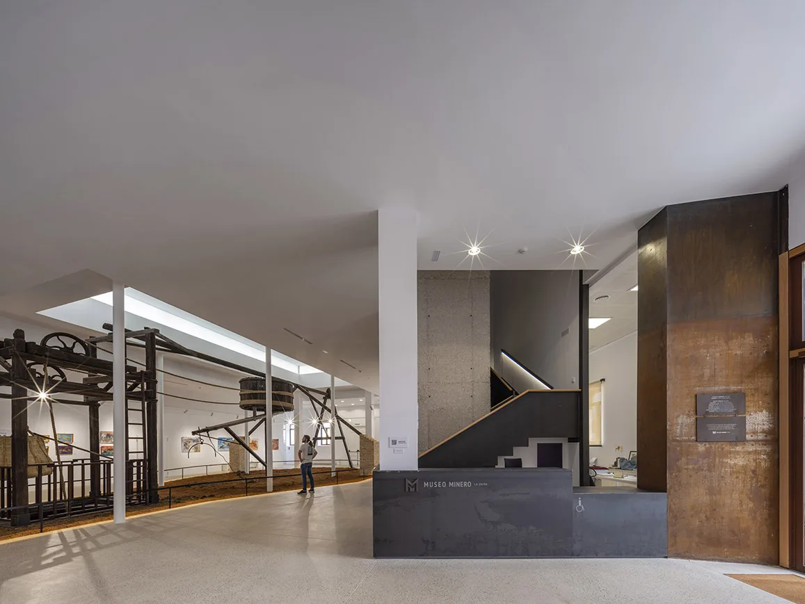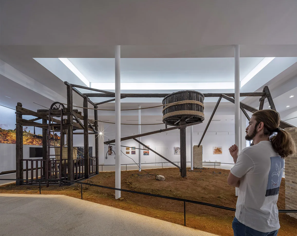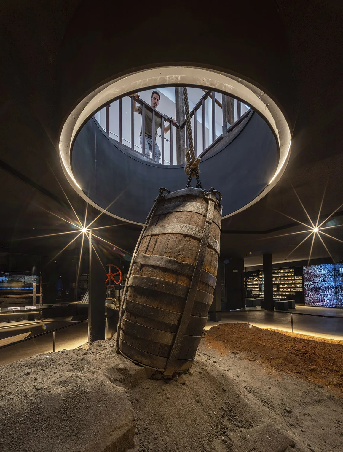 Una apertura bajo el malacate histórico conecta ambas plantas y permite escenografiar el ascenso y descenso de las cubas que transportaban agua o mineral a partir de una reconstrucción fidedigna.