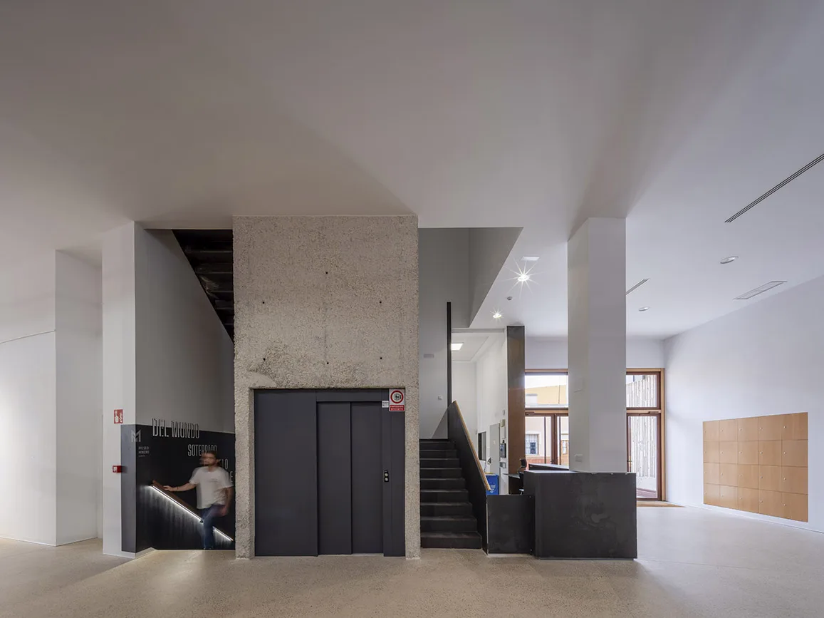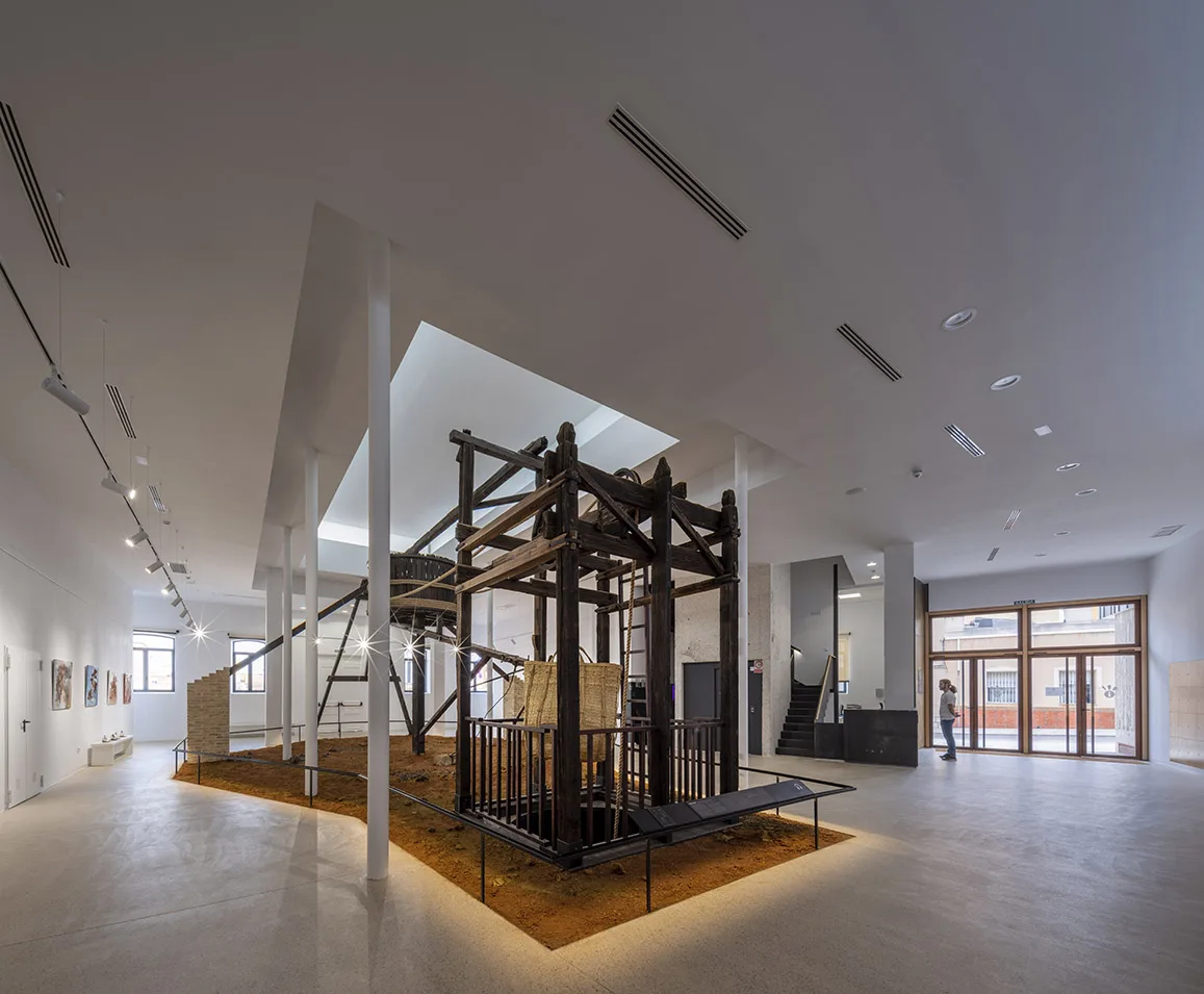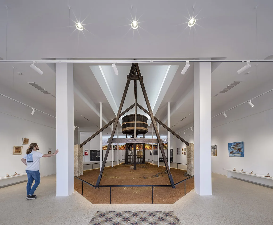 Una apertura bajo el malacate histórico conecta ambas plantas y permite escenografiar el ascenso y descenso de las cubas que transportaban agua o mineral a partir de una reconstrucción fidedigna.