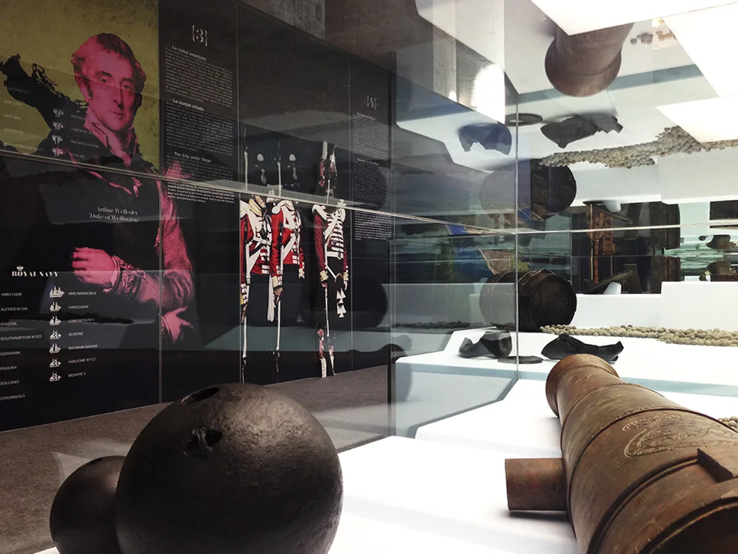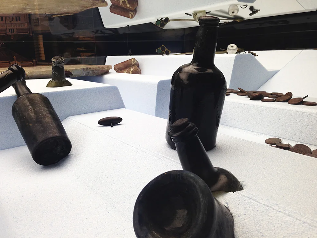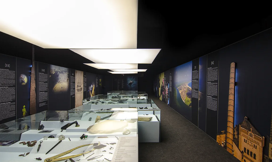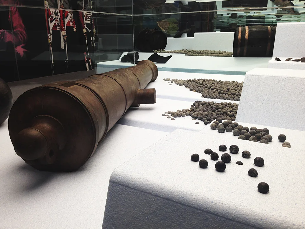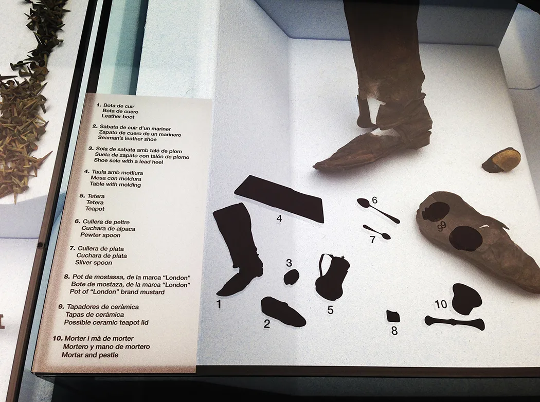 Las piezas arqueológicas se presentan sobre una base ondulante, mimetizando su disposición tal y como fueron halladas por los arqueólogos bajo el agua. Este lecho de EPS, diseñado para evocar el fondo marino, proporciona un escenario en el que los objetos parecen estar encallados, preservando el caos y el azar propios de un naufragio. Las vitrinas, dispuestas a ras de suelo, albergan una variedad de objetos civiles y militares del siglo XIX, ofreciendo al visitante una visión cercana y tangible de los restos rescatados.