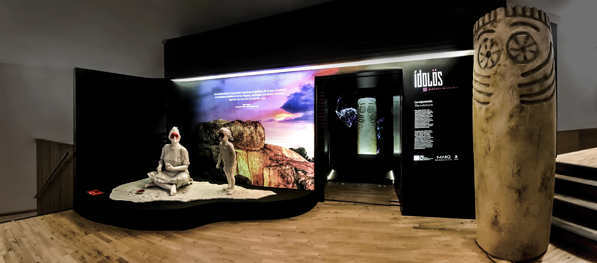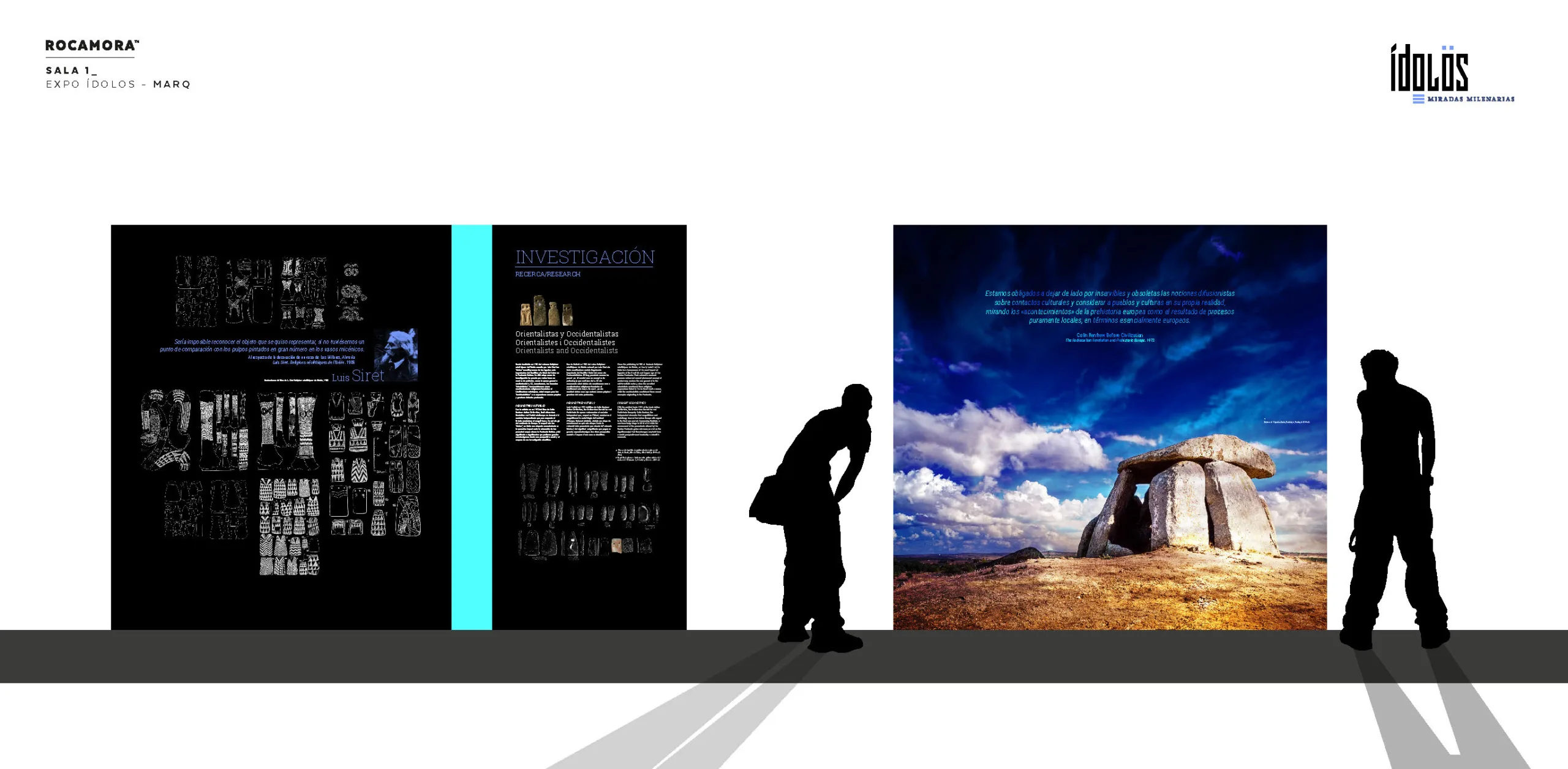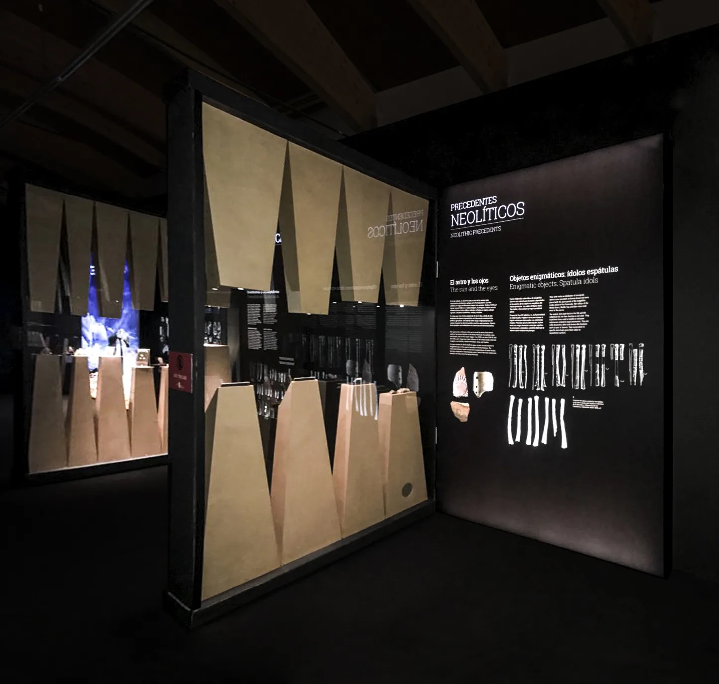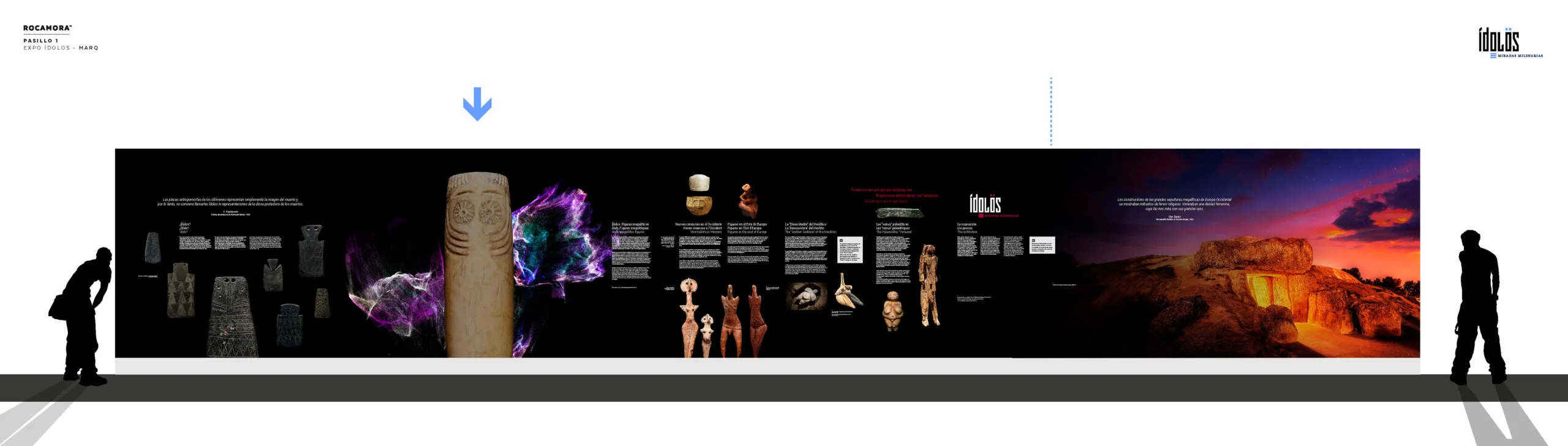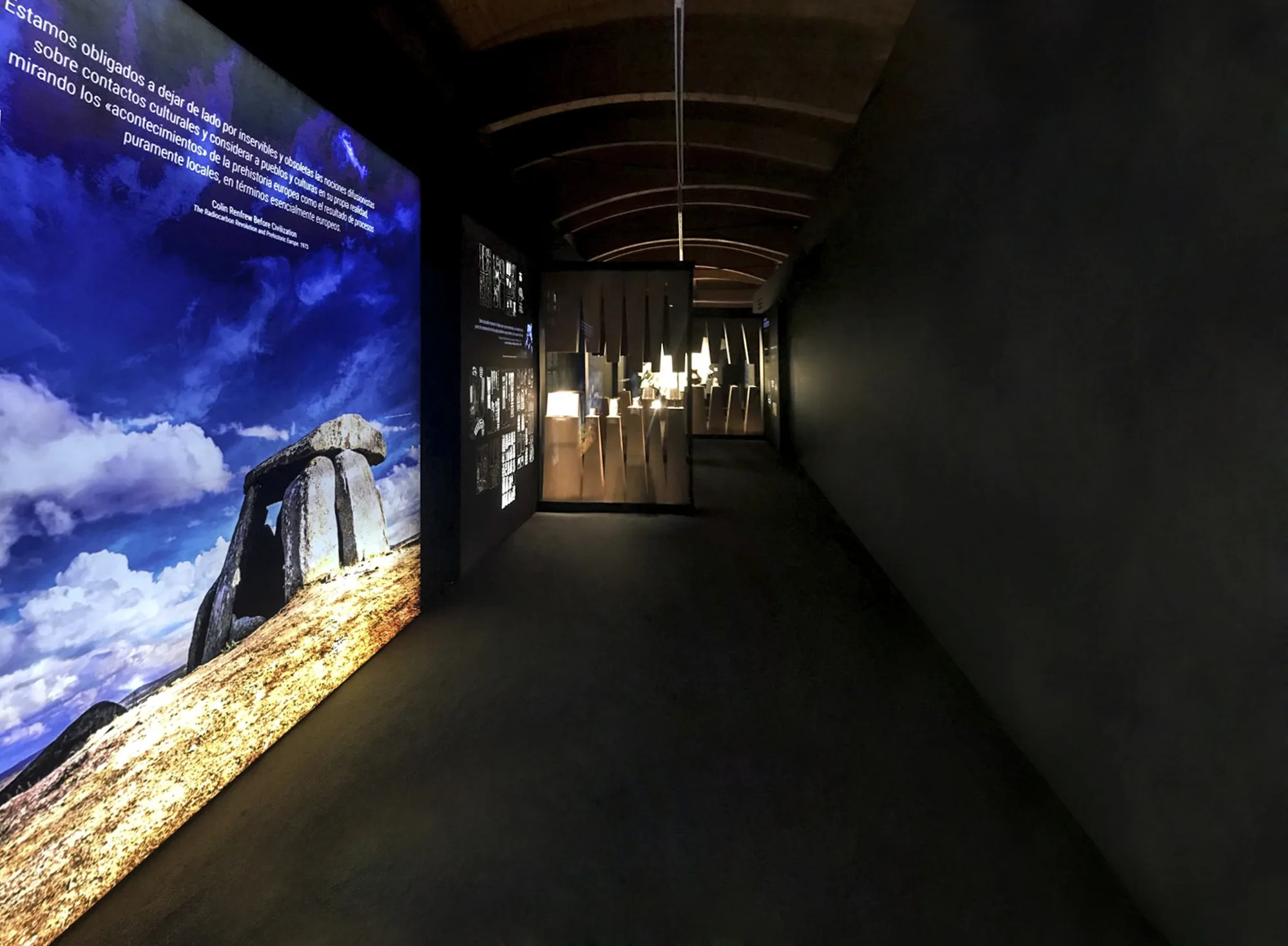 Desde el acceso al pasillo uno, el visitante puede poner en contexto el objeto, la arquitectura del objeto y la escala humana, a través de un conjunto de dos esculturas con los ojos pintados en rojo, una de ellas elaborando un ídolo, y detrás un contexto de lugar de la escena, un dolmen.