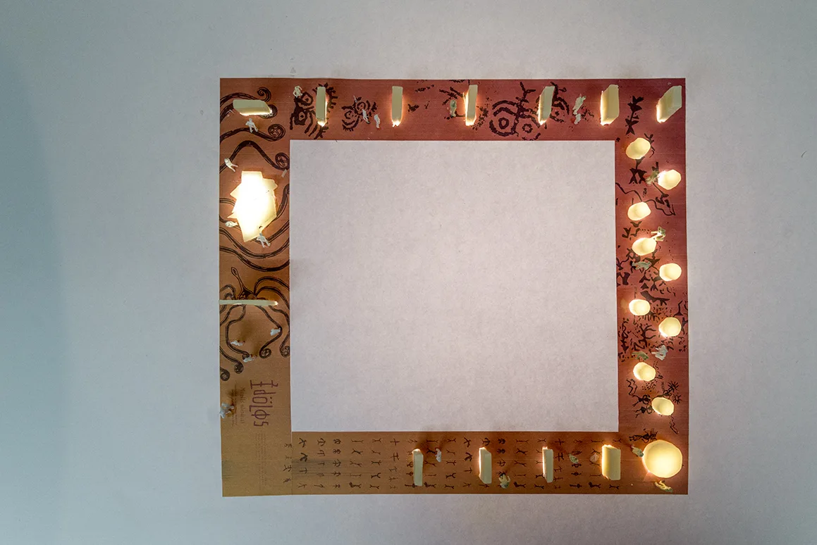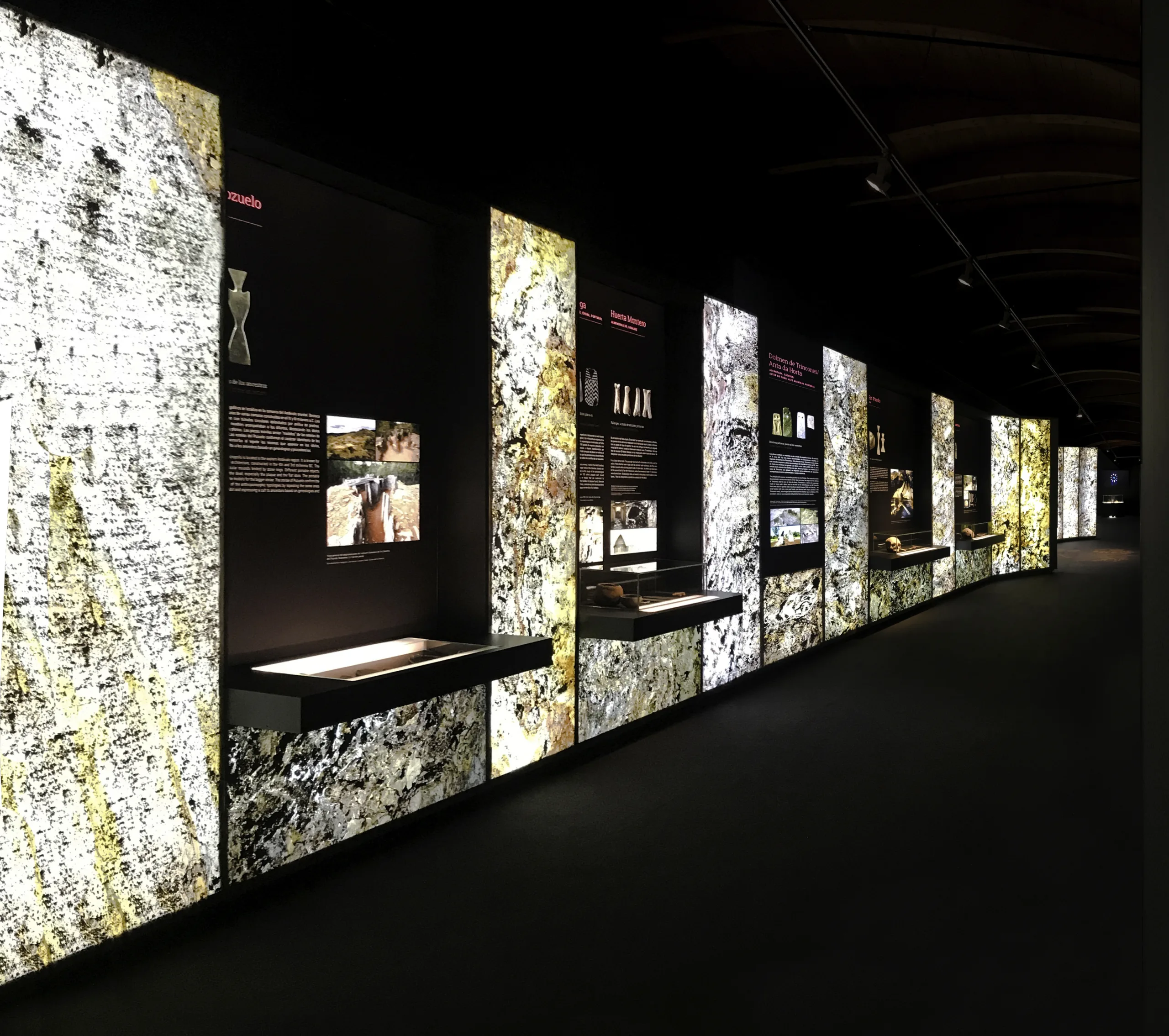 Los dos segundos espacios de la sala acabados están resueltos en piedra natural retroiluminada. Traen al imaginario del visitante el despiece de los ortostatos que construyen la arquitectura de Montelirio. Estos dos espacios pétreos traen al visitante la textura de la piedra al tacto, la textura de lo inerte del espacio ritual funerario y de la muerte.