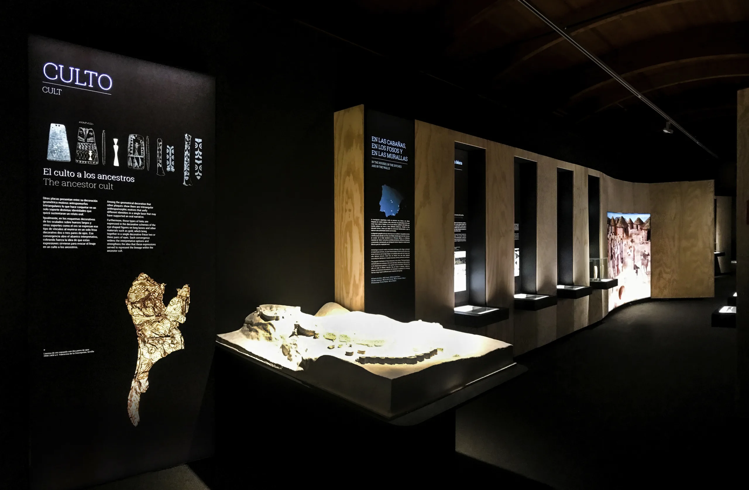 La segunda sala construye el espacio narrativo a través de unos muros curvos envolventes que trae al visitante la psicología de la arquitectura del lugar, donde es encontrado el ídolo. Cuatro habitáculos, de diferente escala y con dos materiales de acabado sirven de soporte museográfico para una veintena de yacimientos. Estos dos acabados, la madera natural y la piedra, sirven de soporte para la vida cotidiana en el poblado y los recintos funerarios habituales. La madera natural y la piedra, acabados de la arquitectura, nos traen dos superficies, la orgánica y la pétrea, nos traen la vida y la muerte.