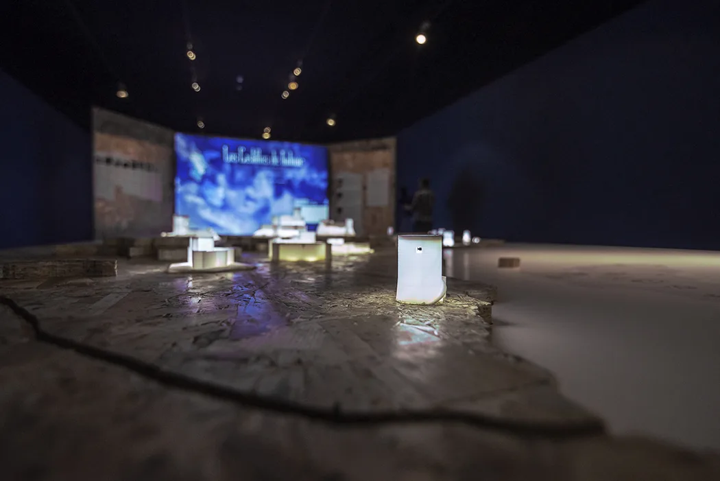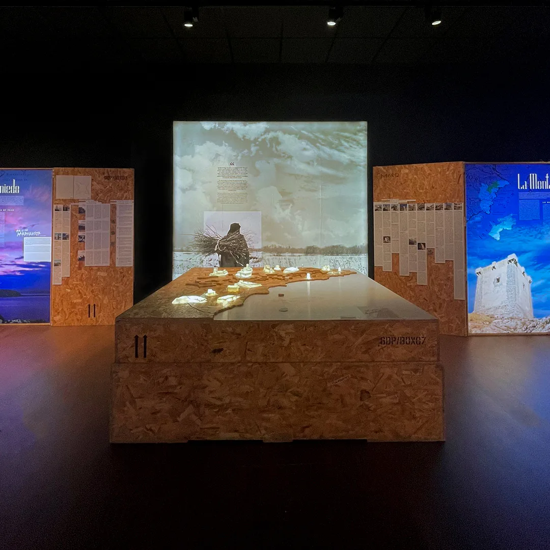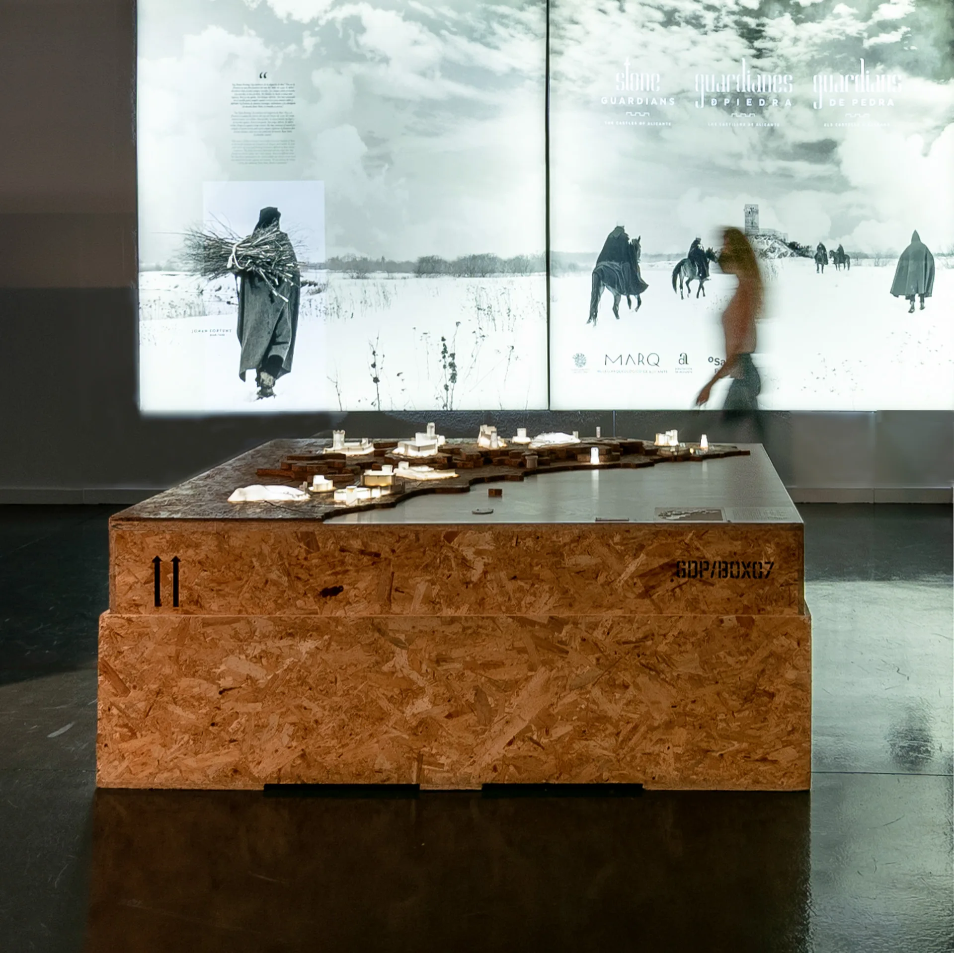 La arquitectura museográfica de la exposición destaca por su diseño modular y autoportante, utilizando cajas de embalaje para crear una experiencia de montaje y desmontaje que refleja su propia itinerancia. Las cajas, construidas en tablero de OSB lacado natural mate, se organizan en módulos que facilitan su transporte y su adaptabilidad en cada nueva ubicación.