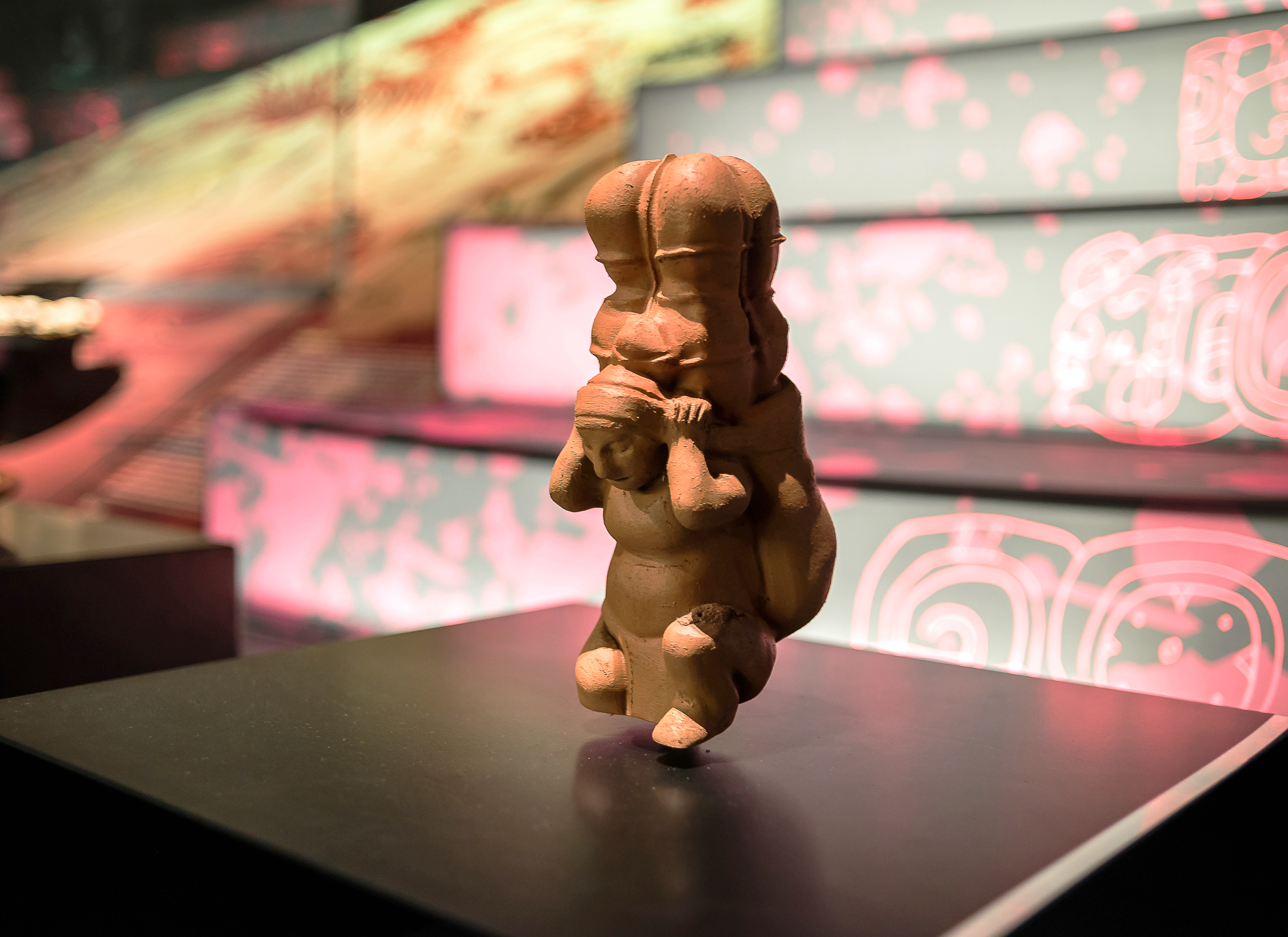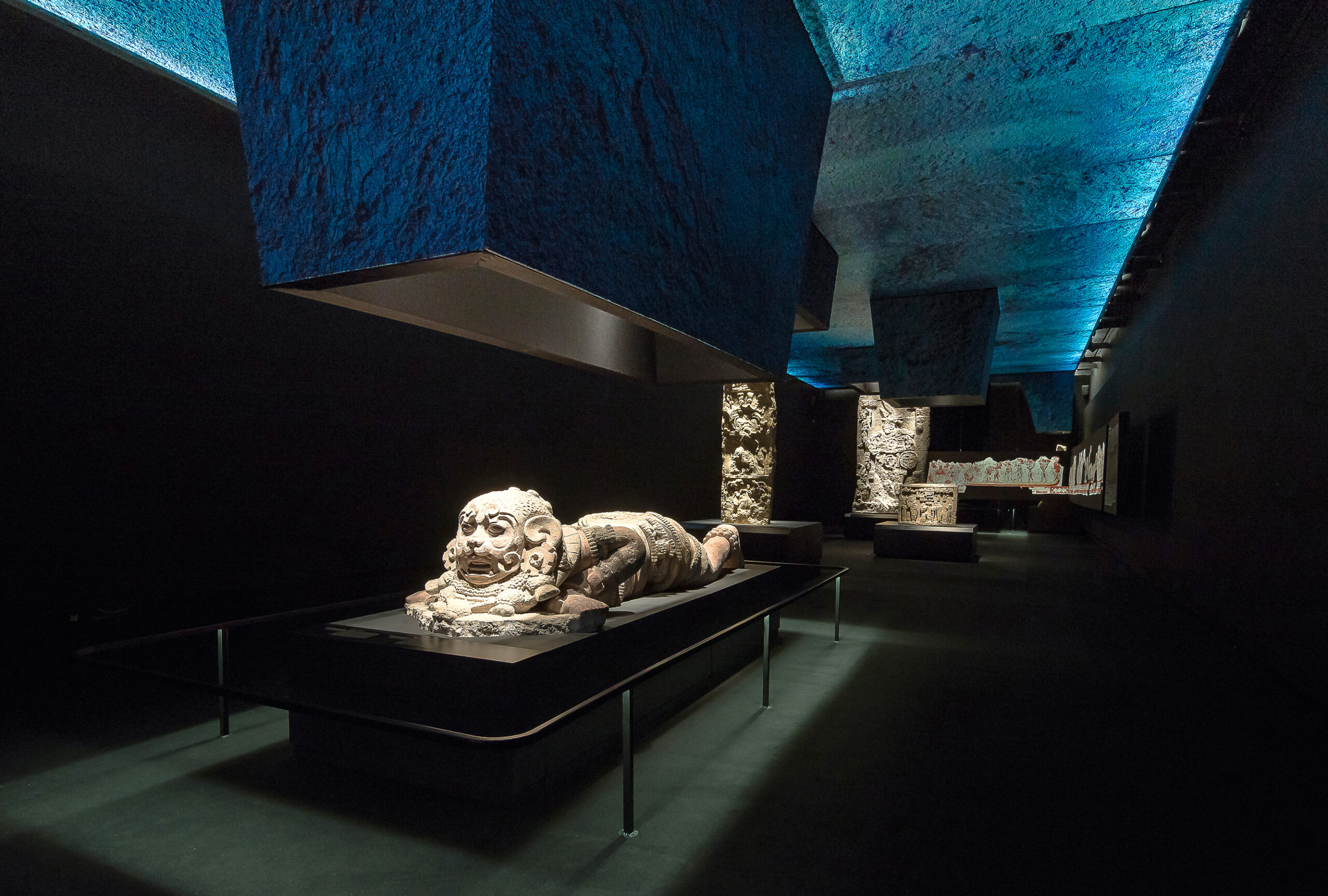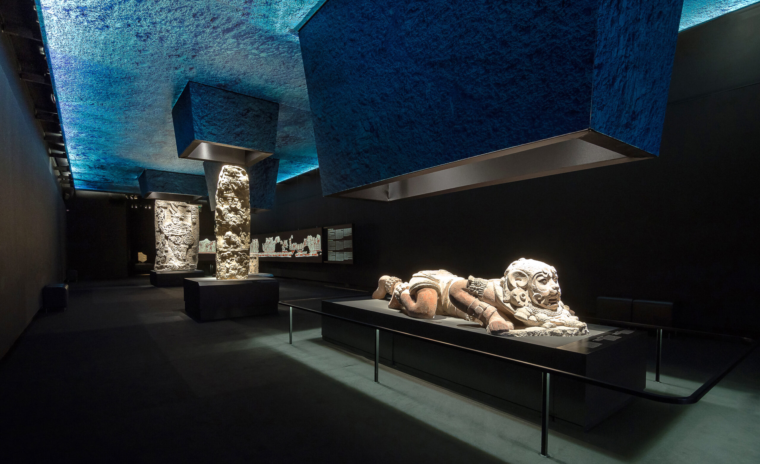 En la tercera sala, las esculturas imponentes, algunas de más de 2 metros de altura, emergen sobre un lienzo neutro y oscuro, iluminadas individualmente. El cielo terroso y de «azul maya», junto con los lucernarios, crea un paisaje evocador que refleja una selva salpicada de formas tronco-piramidales, recordándonos las ciudades mayas perdidas en la jungla.