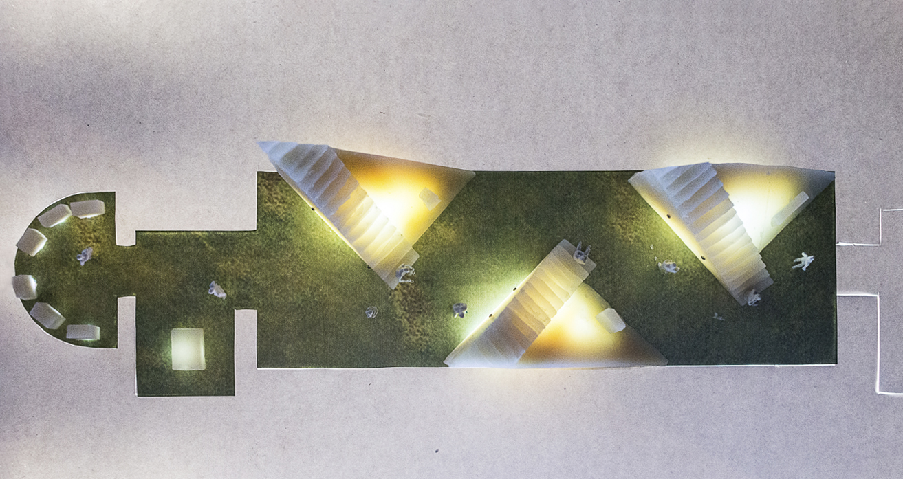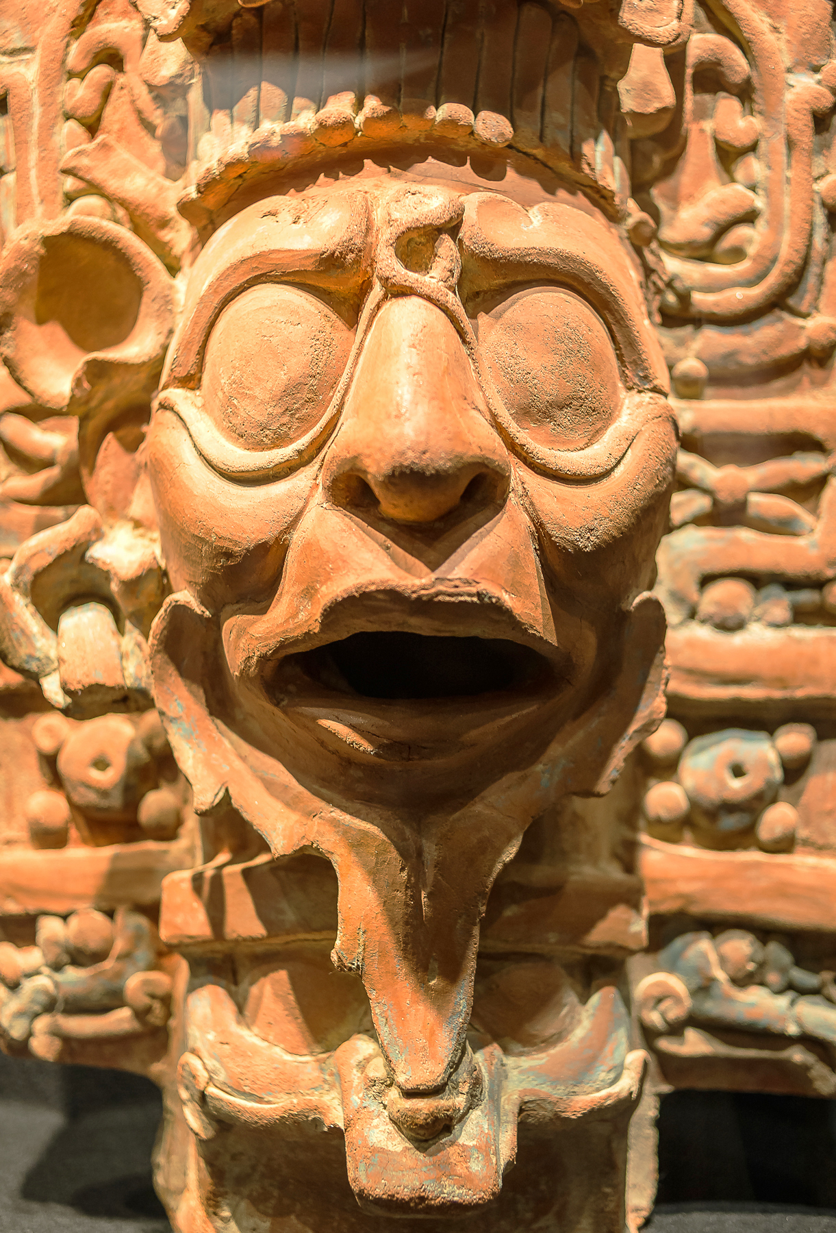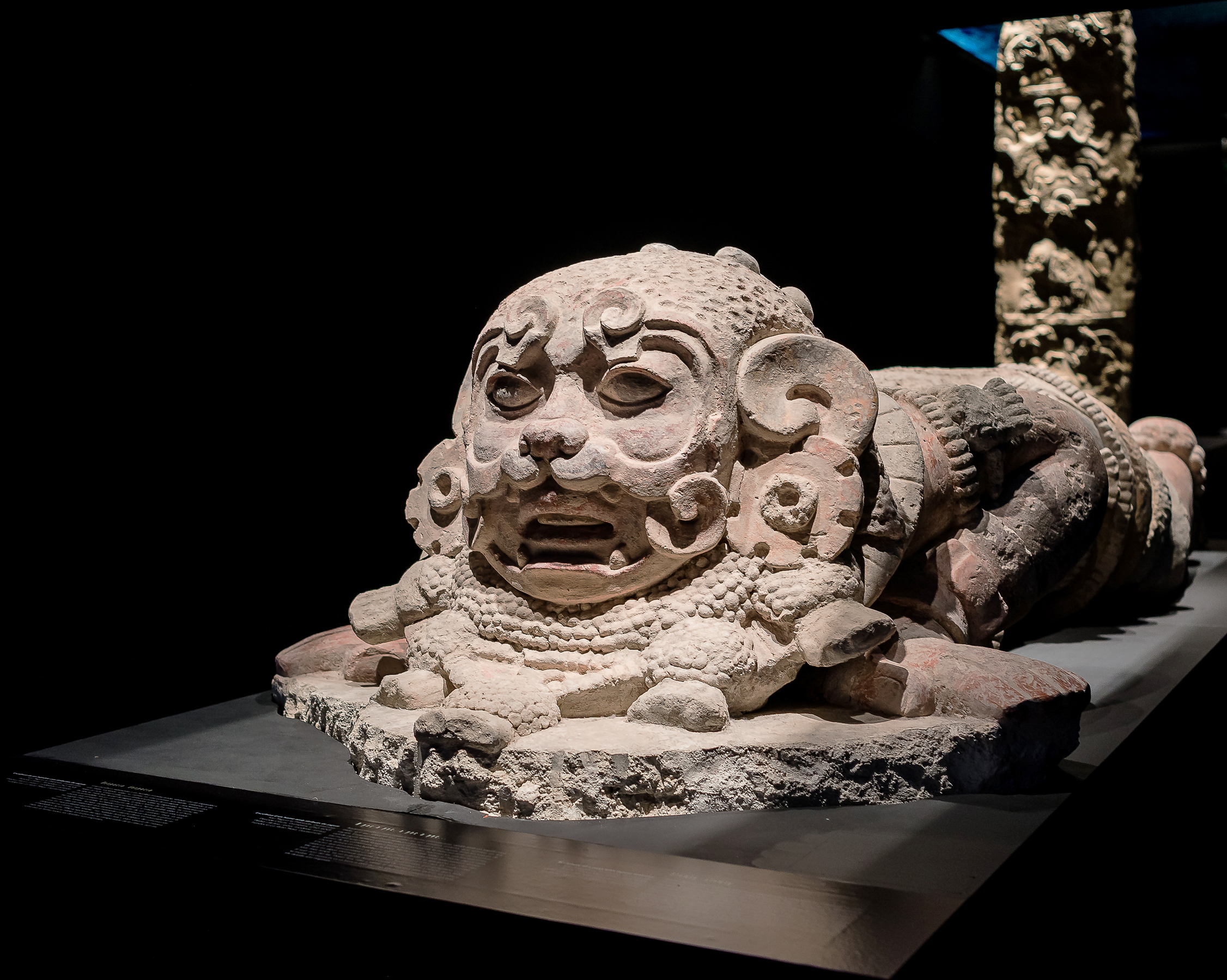En la tercera sala, las esculturas imponentes, algunas de más de 2 metros de altura, emergen sobre un lienzo neutro y oscuro, iluminadas individualmente. El cielo terroso y de «azul maya», junto con los lucernarios, crea un paisaje evocador que refleja una selva salpicada de formas tronco-piramidales, recordándonos las ciudades mayas perdidas en la jungla.