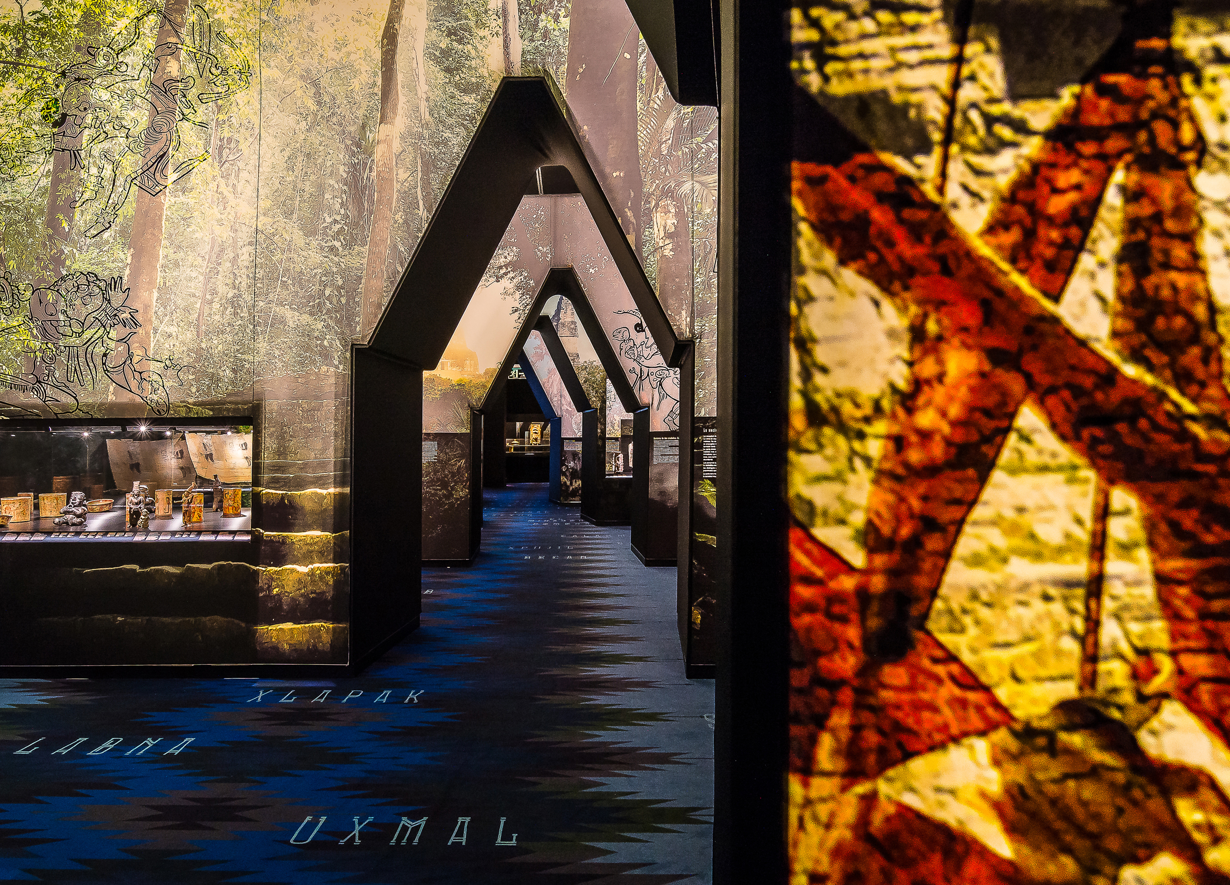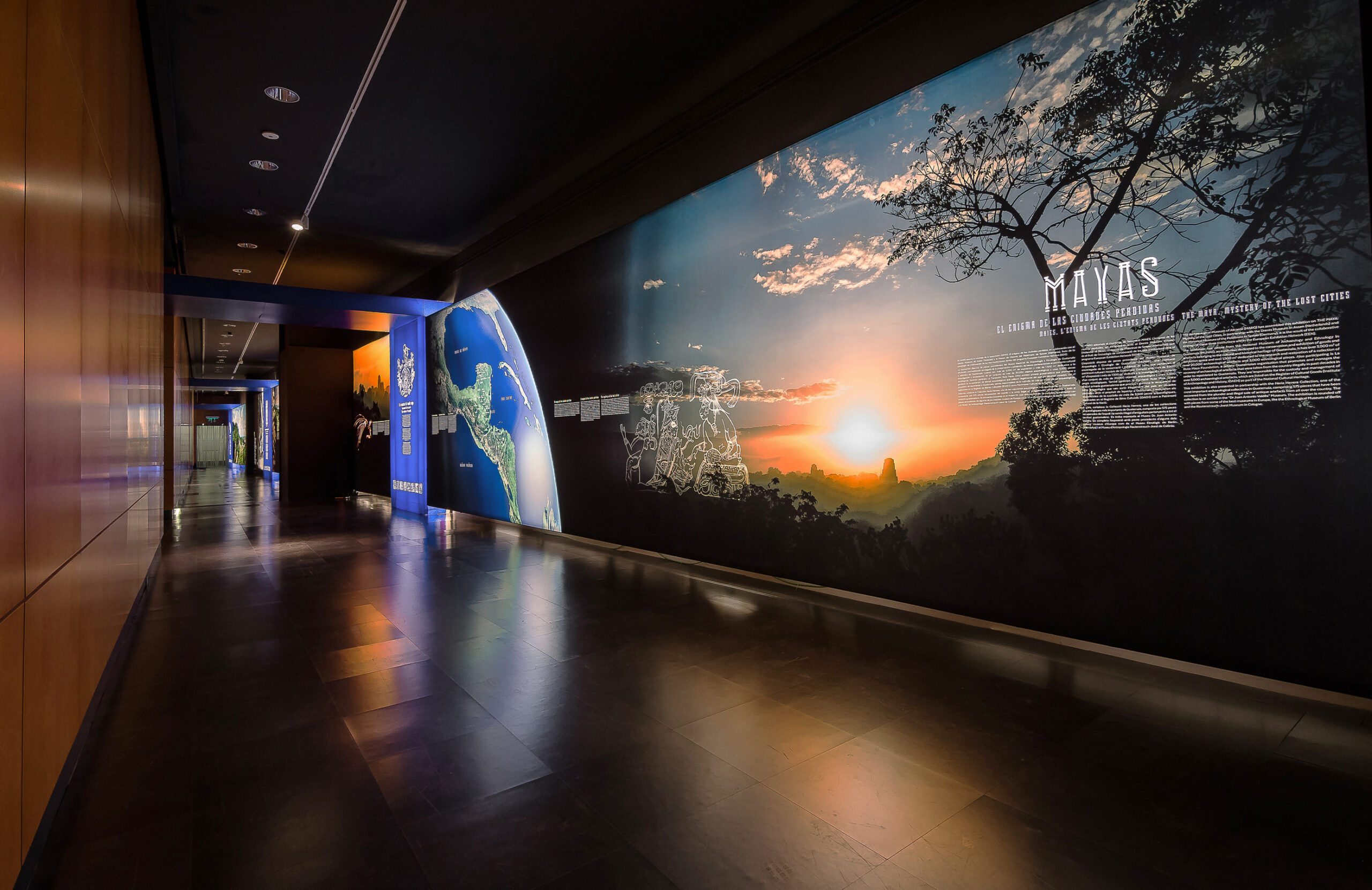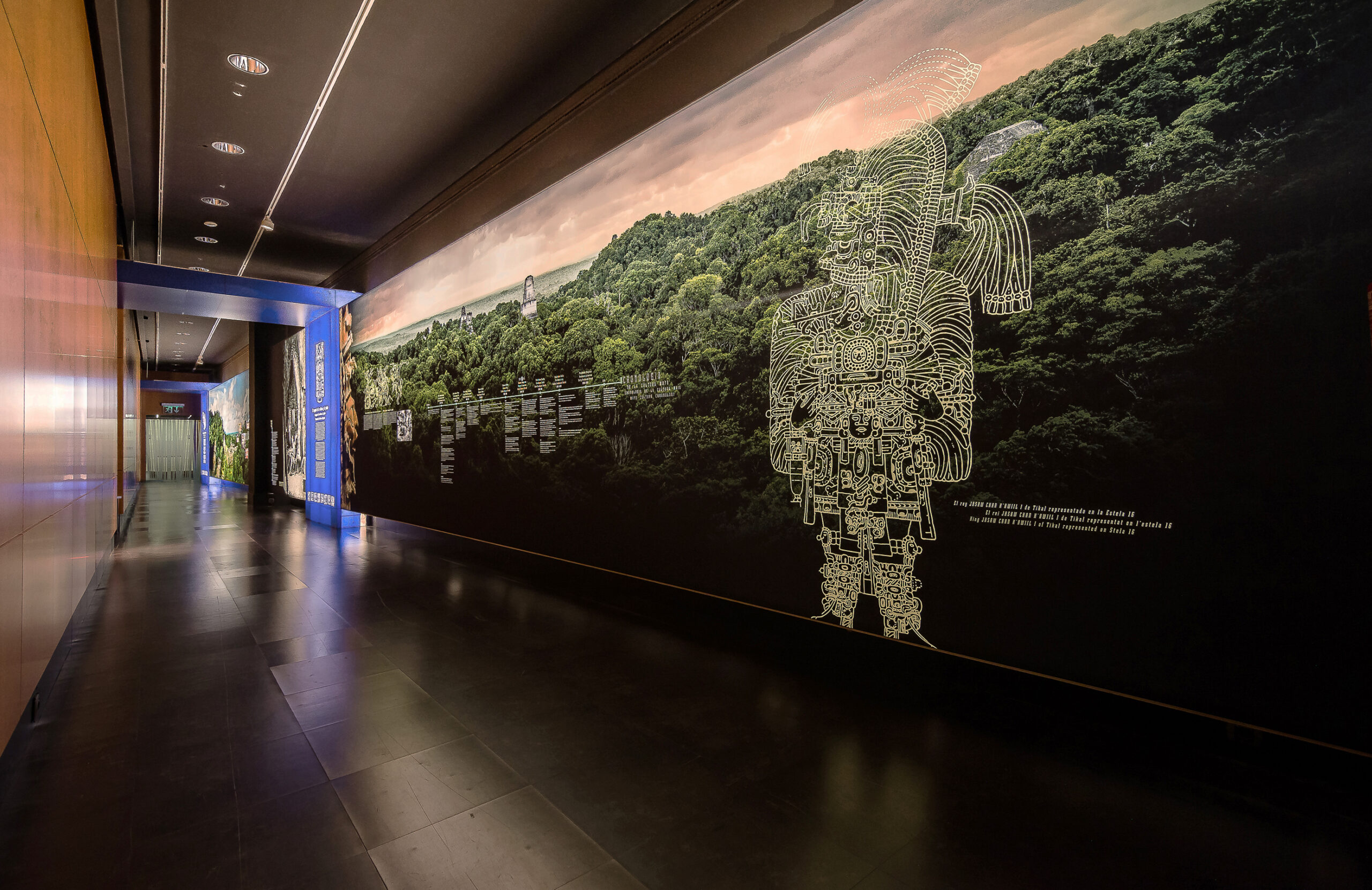 Las tres salas construyen un discurso escenográfico que nos traslada a las calles de Tikal, al interior de sus pirámides y, finalmente, nos sumerge bajo la lámina de agua de un cenote mitológico.