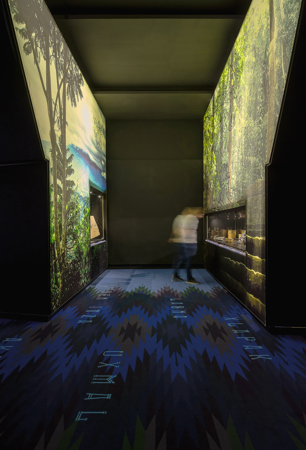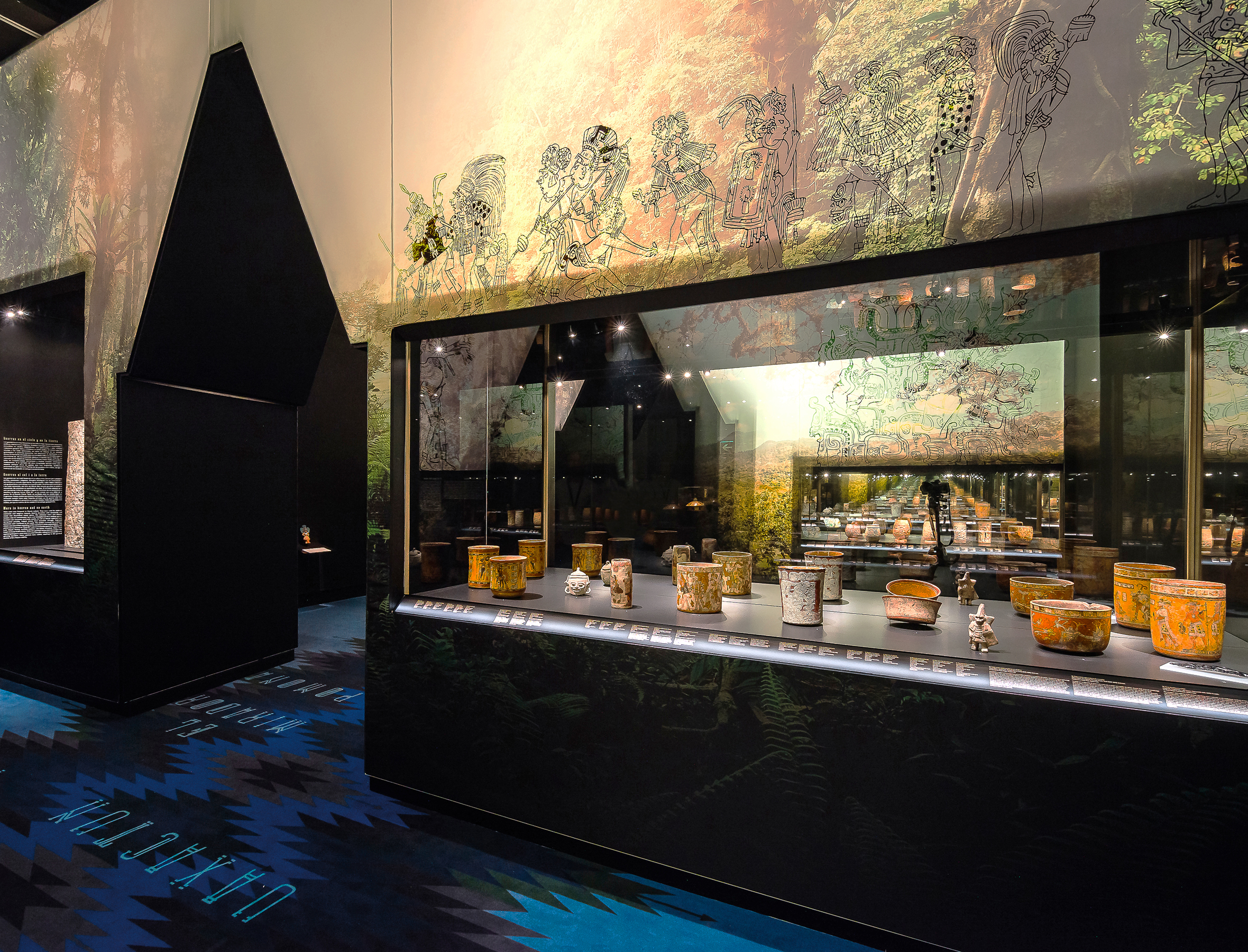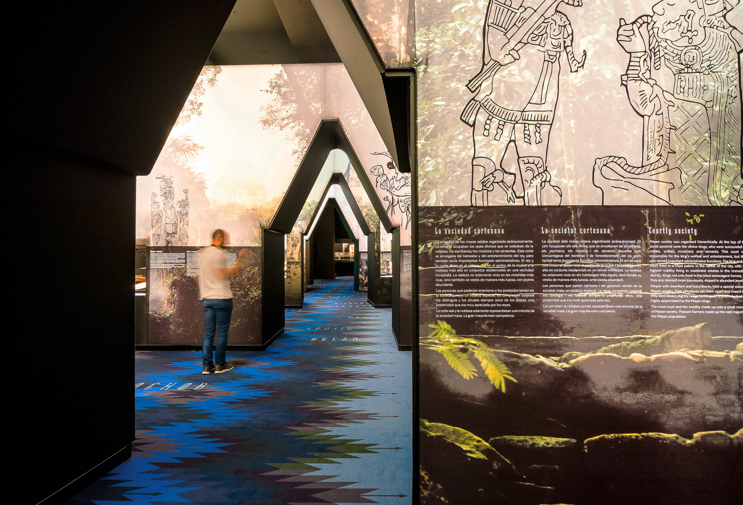 Las tres salas construyen un discurso escenográfico que nos traslada a las calles de Tikal, al interior de sus pirámides y, finalmente, nos sumerge bajo la lámina de agua de un cenote mitológico.