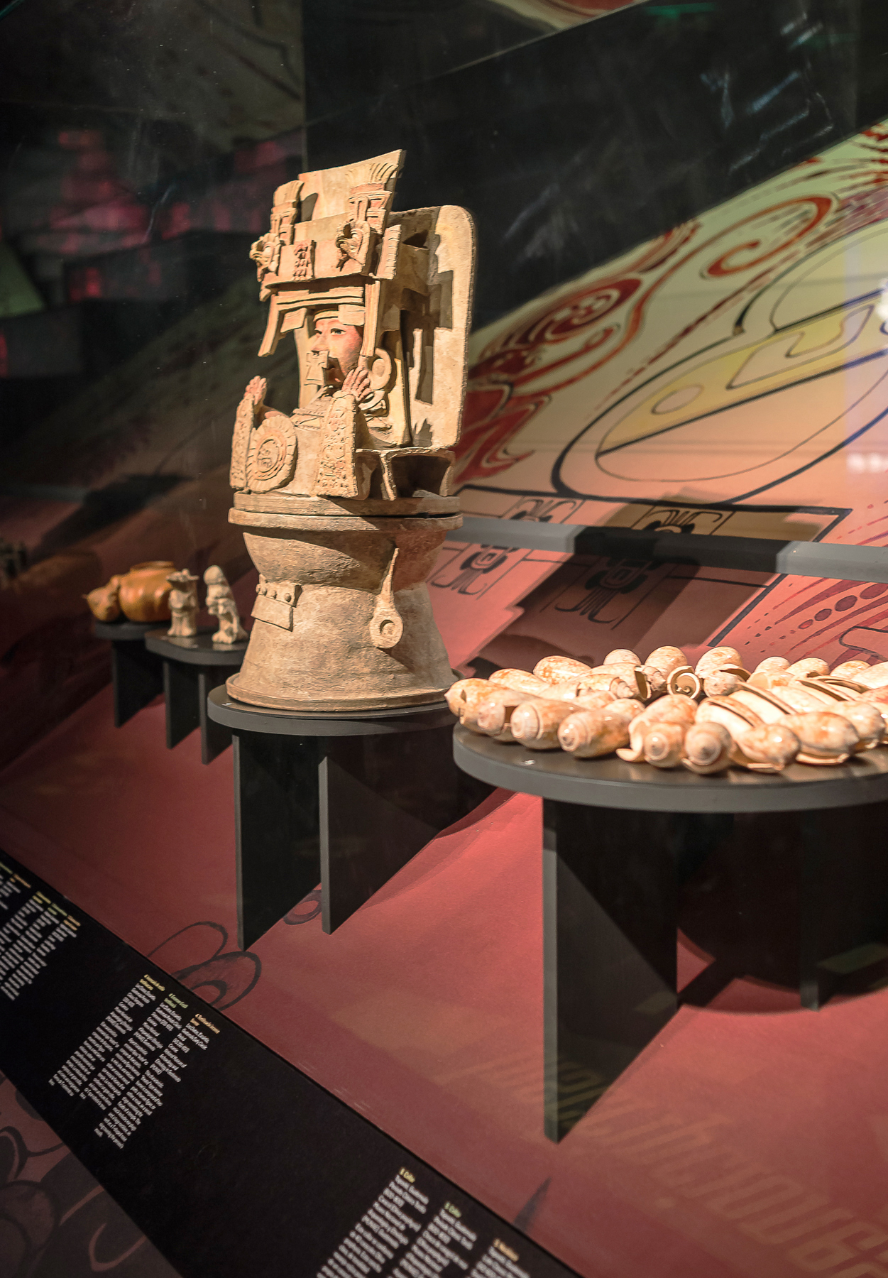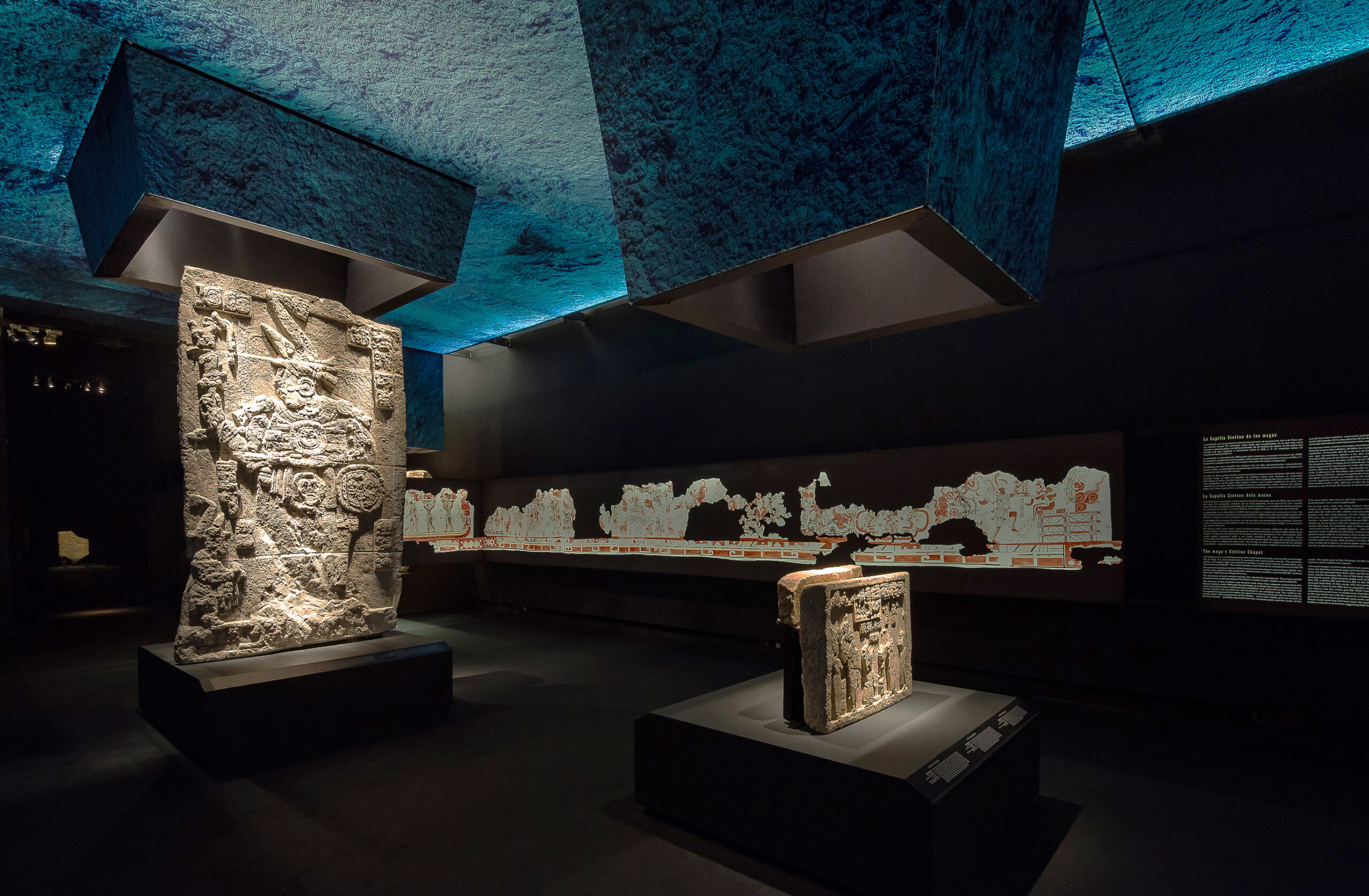 Esta exposición es una experiencia única donde la arquitectura y las piezas se fusionan para contar la historia de la cultura Maya, mientras los murales de San Bartolo nos observan sutilmente desde el final de la sala.