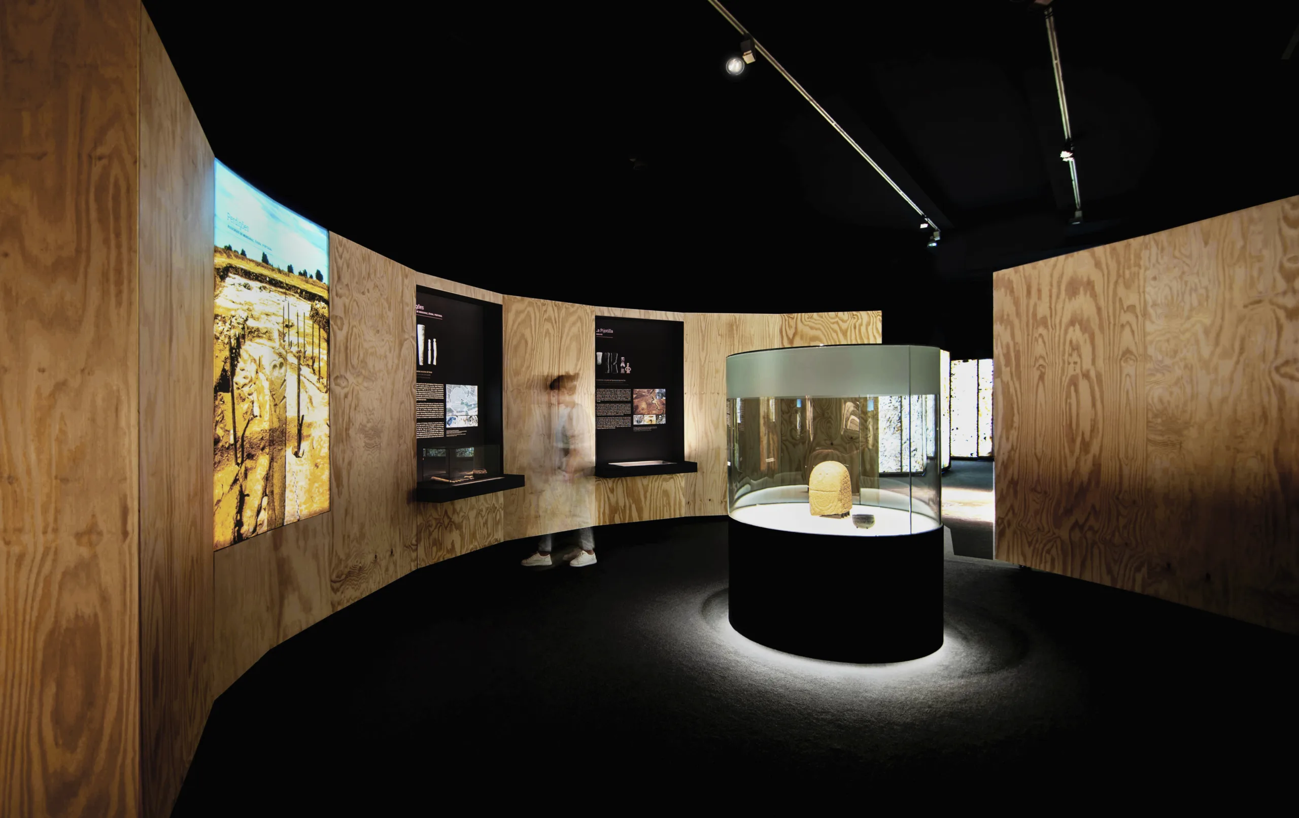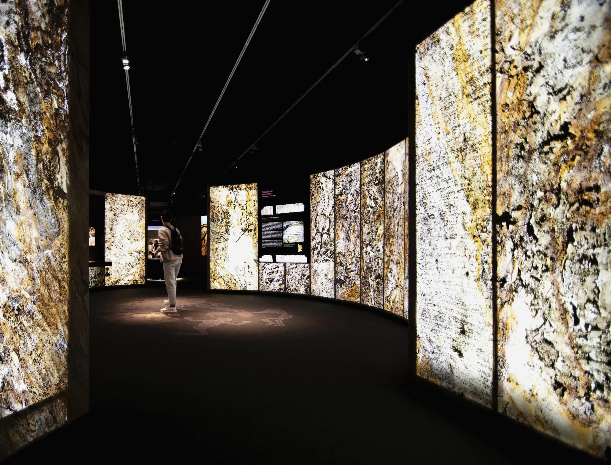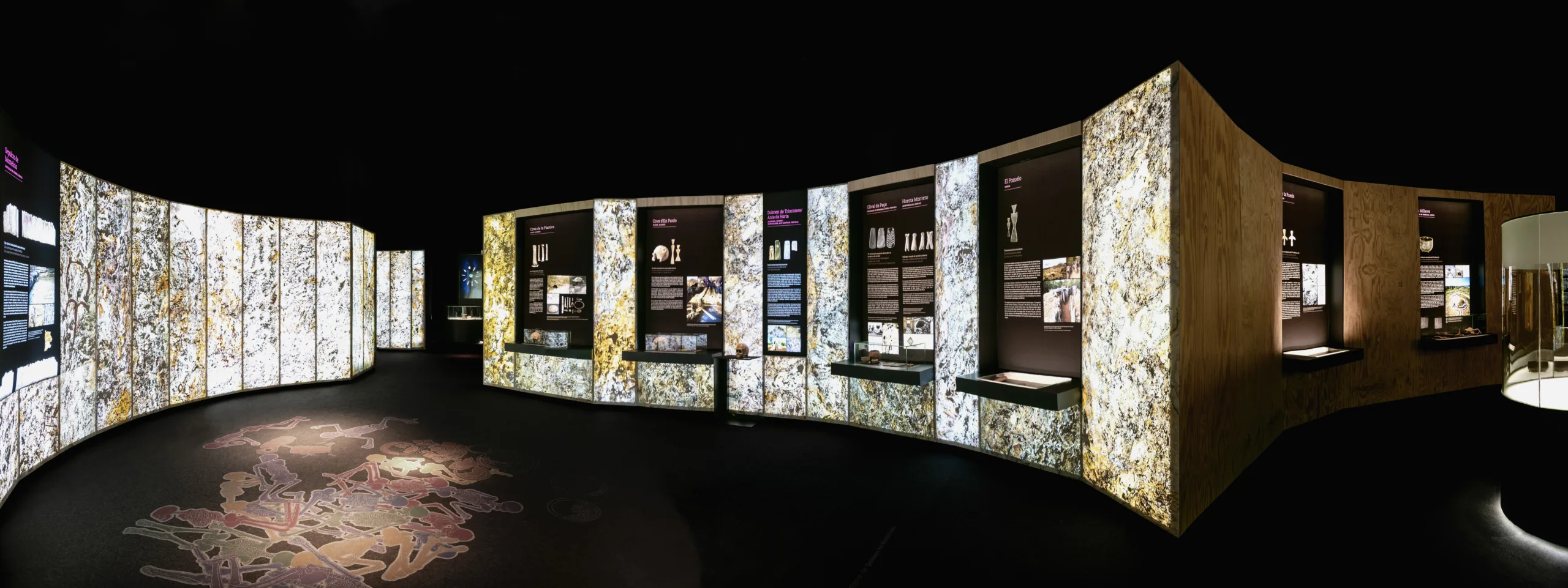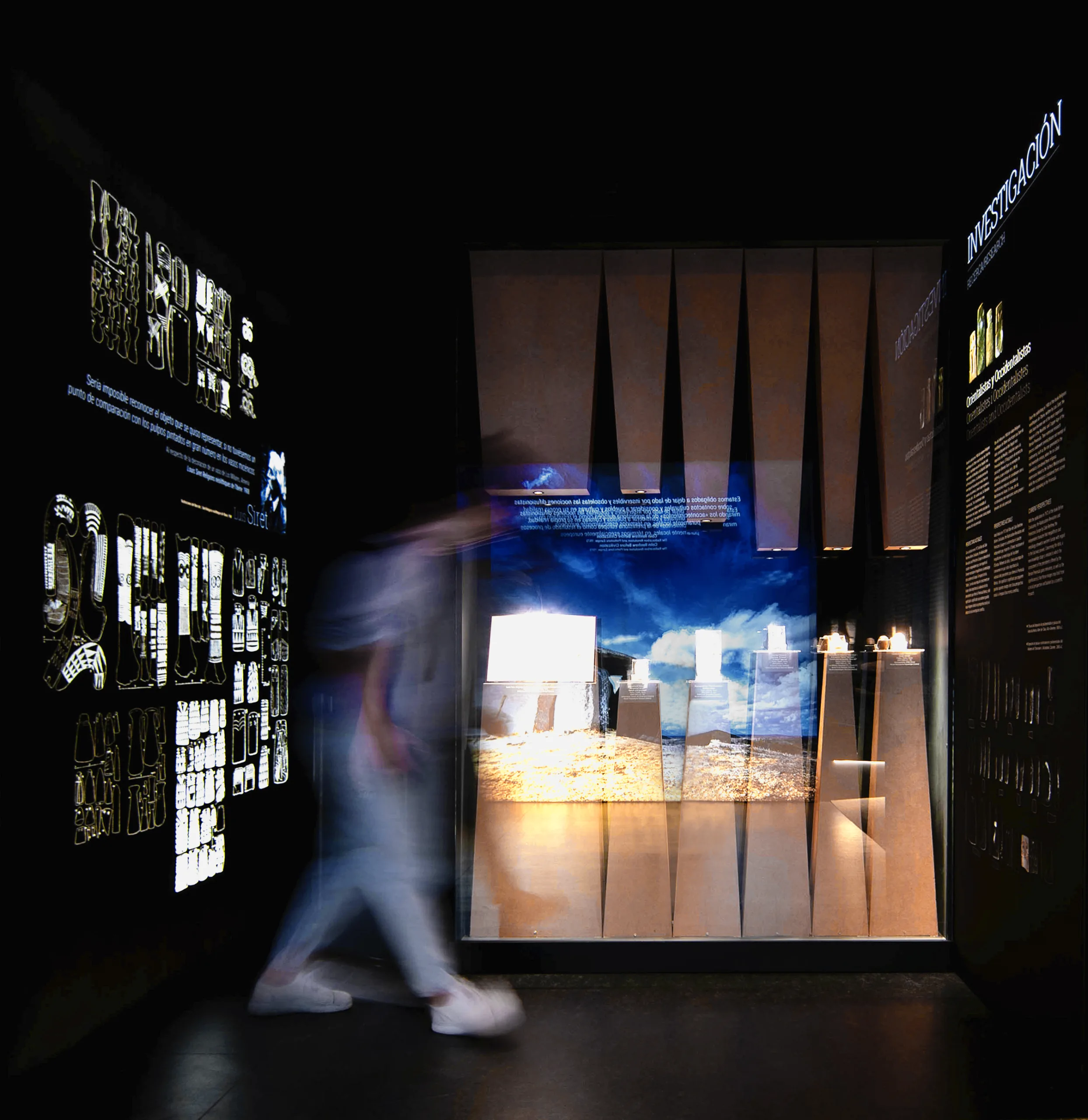 El contexto científico del objeto se desenvuelve a través de pequeñas franjas expositivas con vitrinas, imágenes de los diferentes yacimientos, de textos científicos, concatenados a través de la envolvente museográfica de la sucesión de paredes cortas que conforman el espacio curvo arquitectónico.
