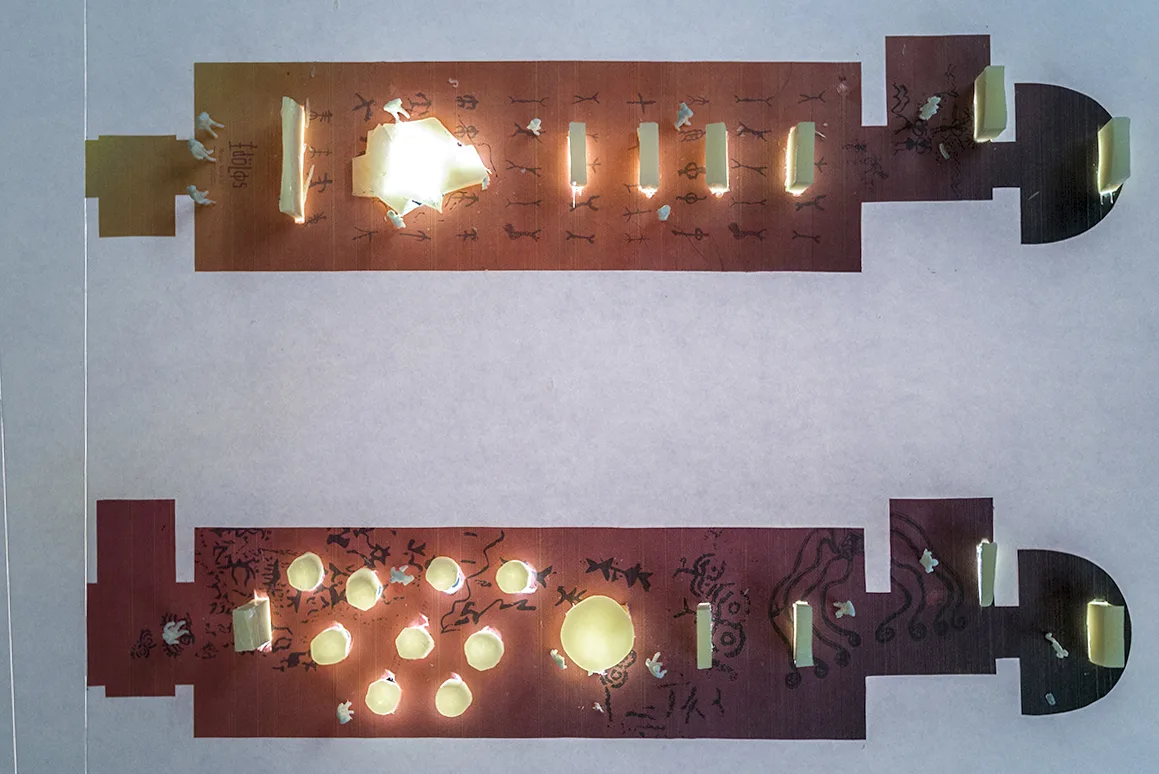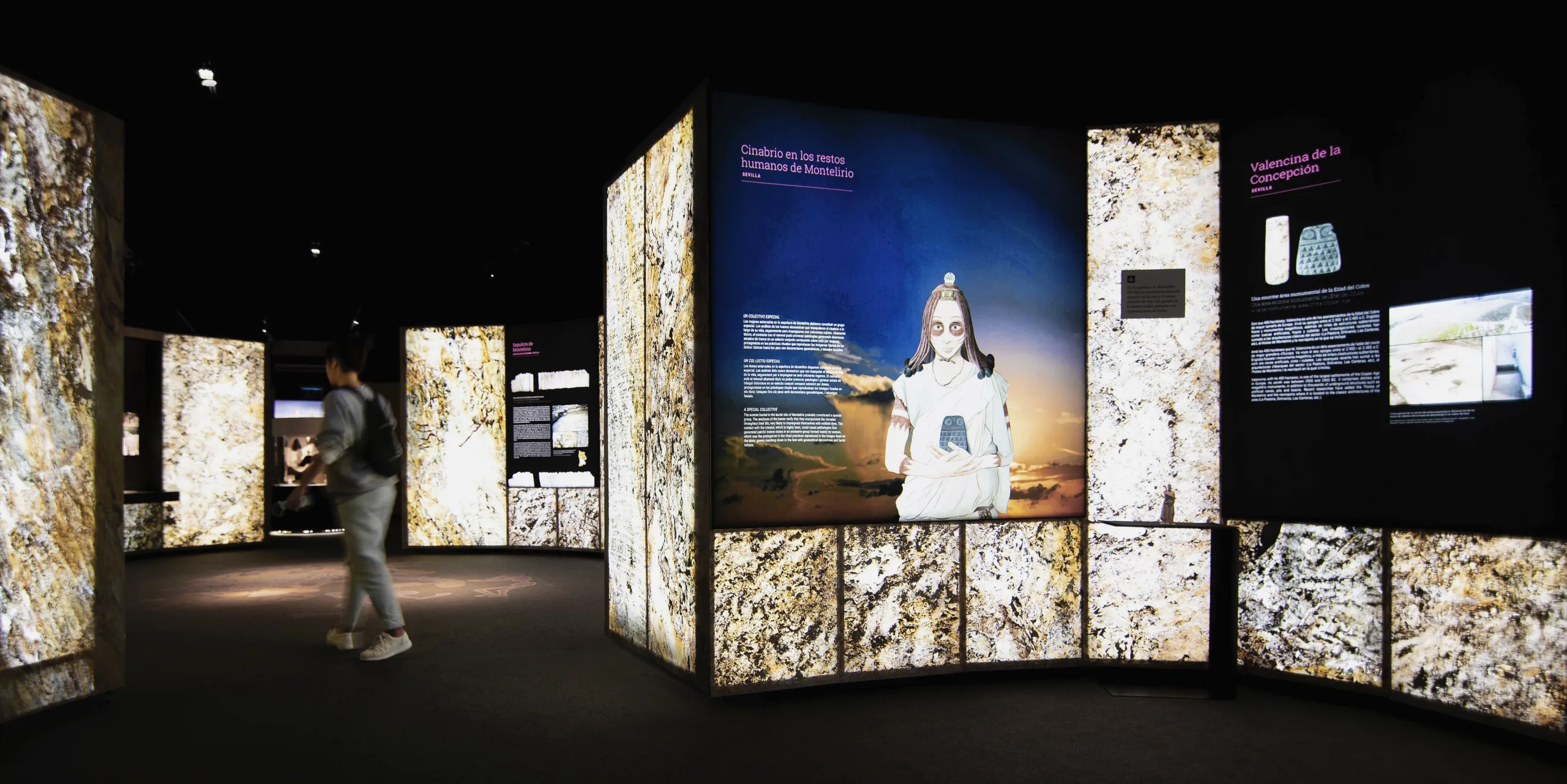 Los dos segundos espacios de la sala acabados están resueltos en piedra natural retroiluminada. Traen al imaginario del visitante el despiece de los ortostatos que construyen la arquitectura de Montelirio. Estos dos espacios pétreos traen al visitante la textura de la piedra al tacto, la textura de lo inerte del espacio ritual funerario y de la muerte.