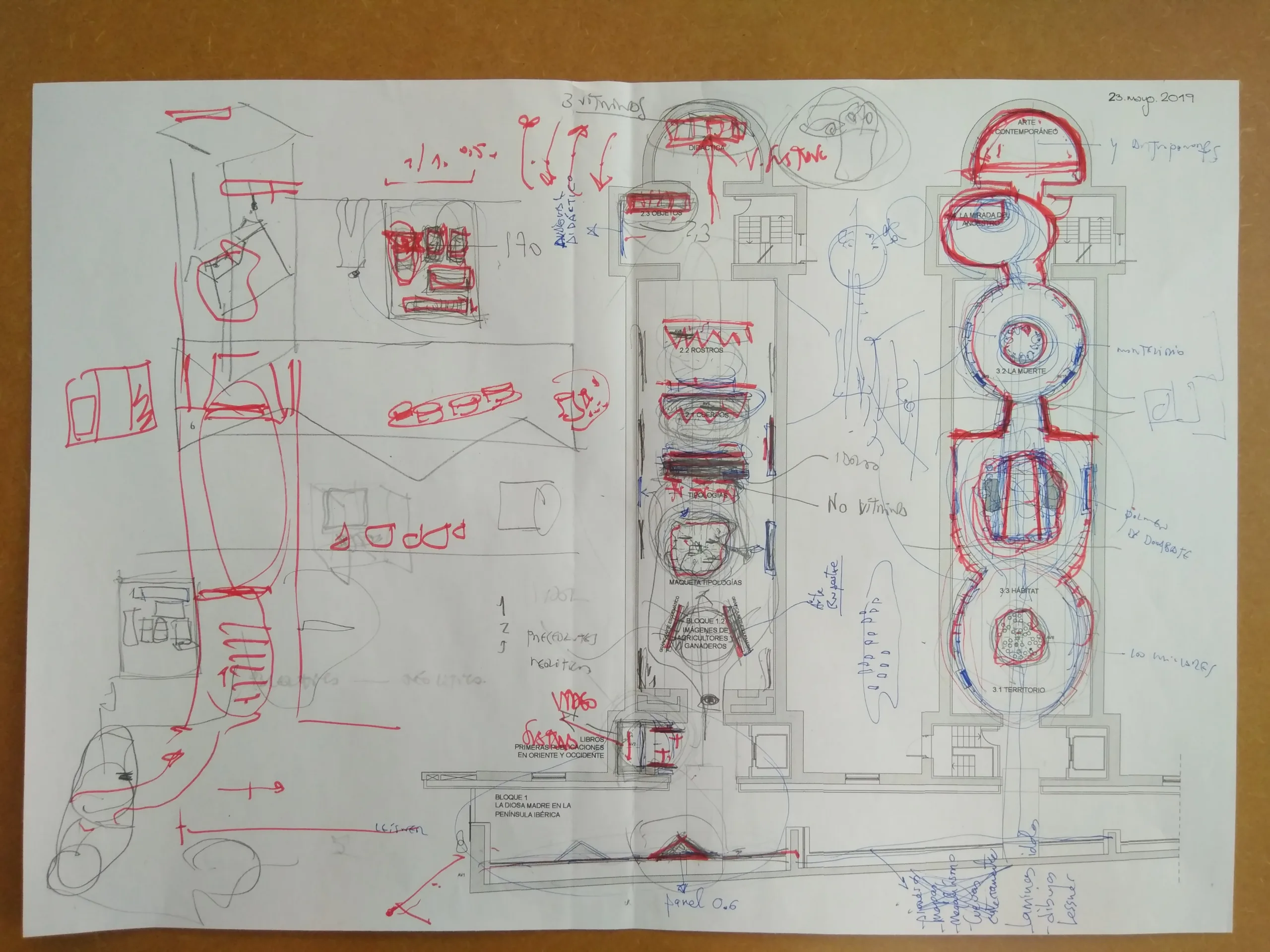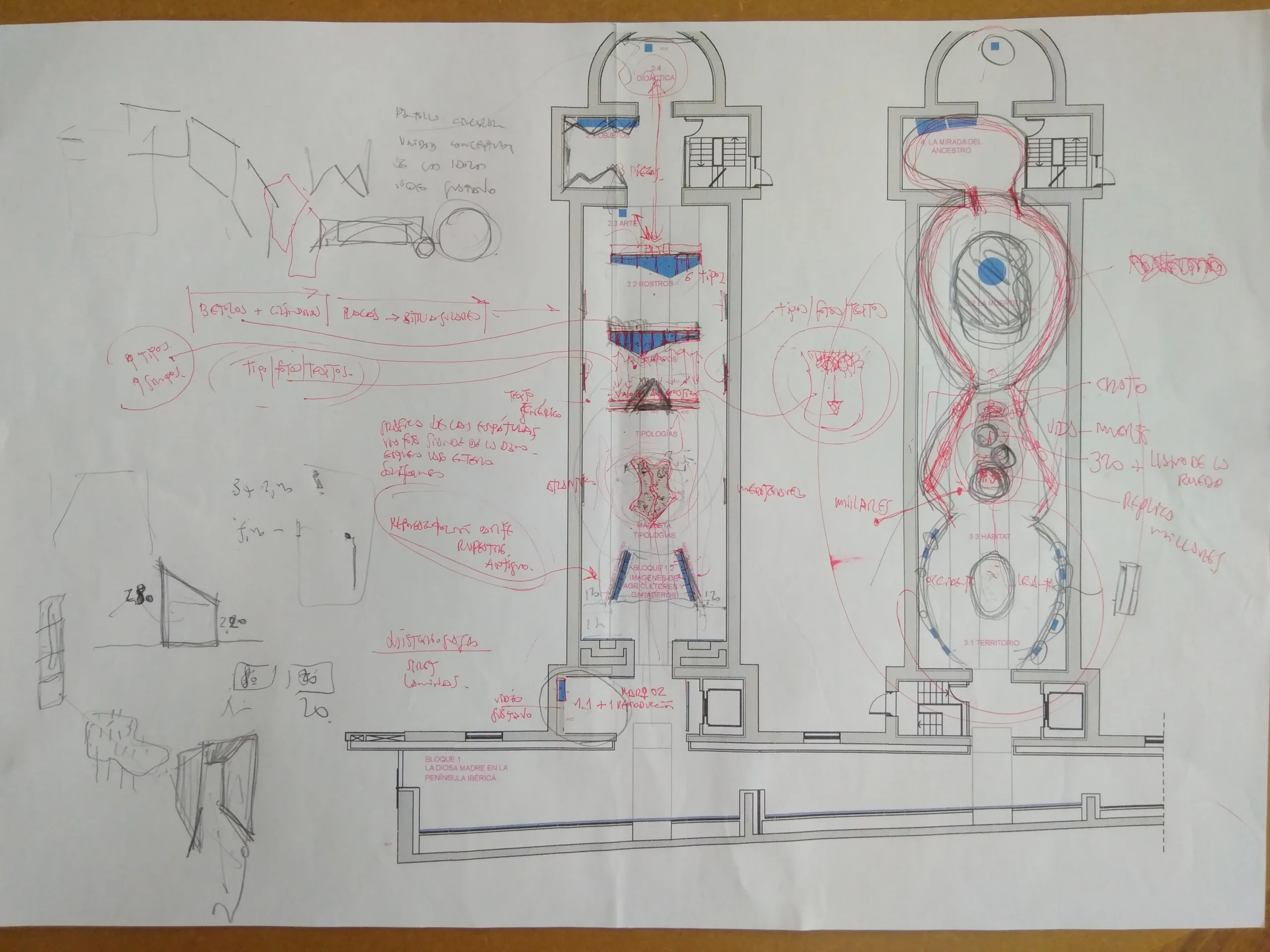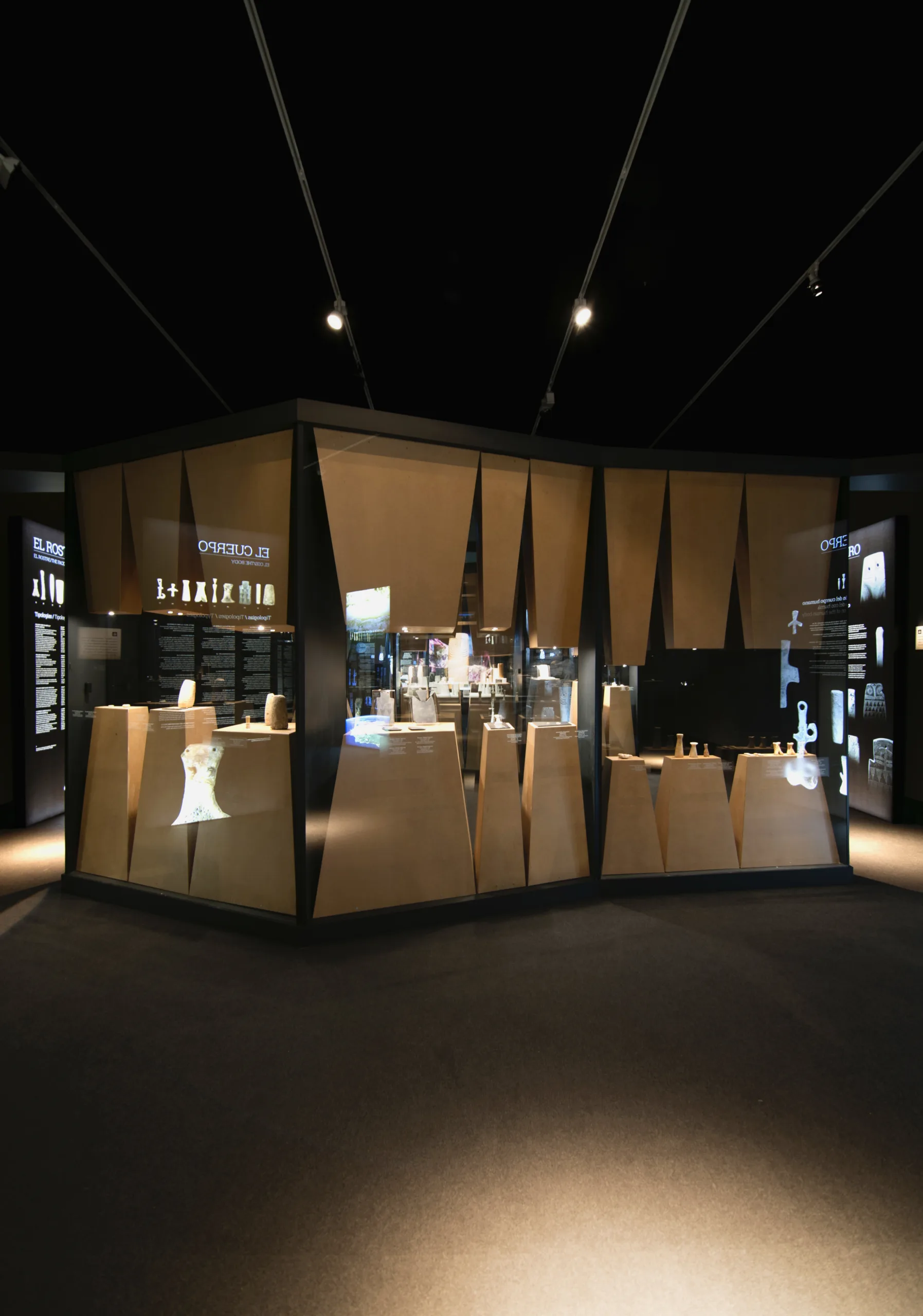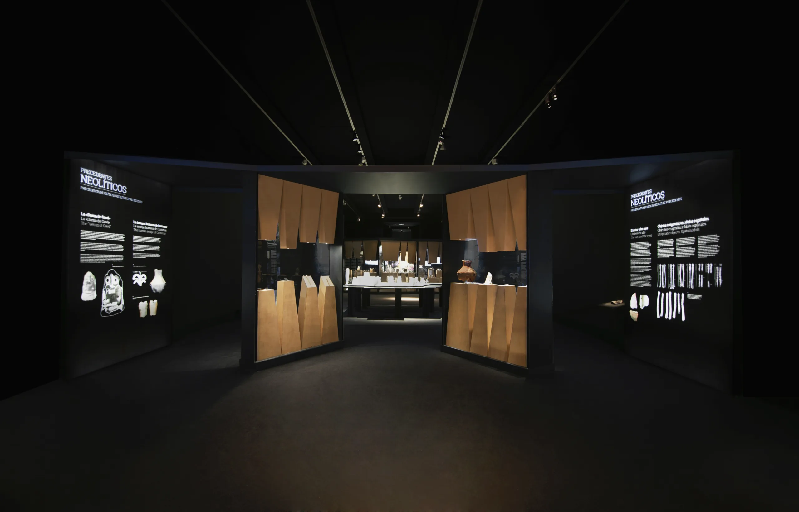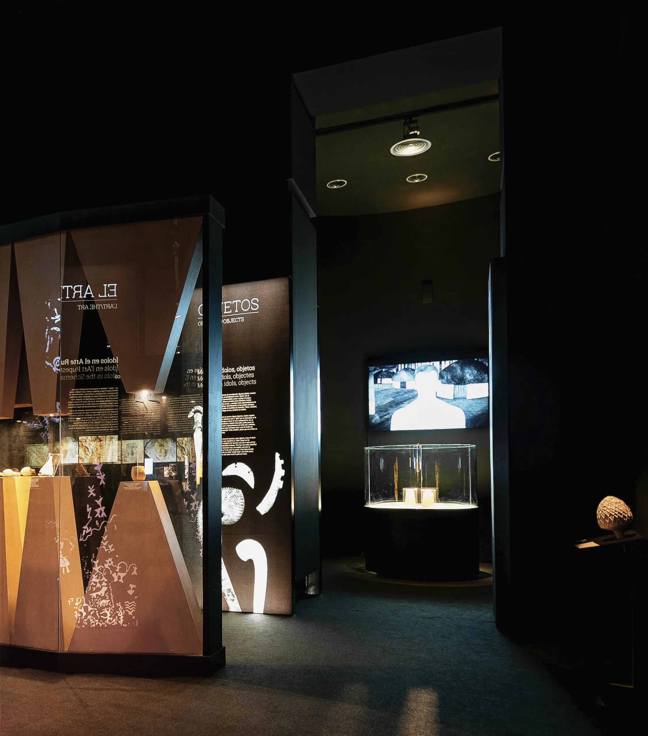 En la primera sala el espacio expositivo se resuelve mediante una arquitectura de la cueva mediterránea. Arquitecturas mediante bases en forma de estalactitas (la luz) y estalagmitas truncadas (bases), que hablan de la apropiación del lugar y la arquitectura natural como base del objeto. La forma de exponer en unas bases en forma de tronco de pirámide, hace que el ídolo se exponga como pieza única, significando el conjunto (base y pieza) como un altar. La sala uno se desarrolla a través de 11 vitrinas con más de 35 parejas de estalactitas y estalagmitas, que sirven de soporte a los objetos como piezas de arte únicas. La base invertida (estalactita) que flota sobre cada una de las piezas, es la que construye el espacio íntimo de cada una de las piezas, acercando el punto de luz, colocado en la base inferior de la estalagmita y cierra el conjunto pieza-base-punto de luz como un conjunto icónico, íntimo y precioso. Como pieza única de arte…
