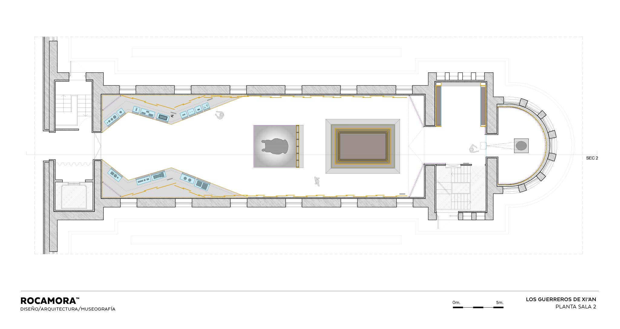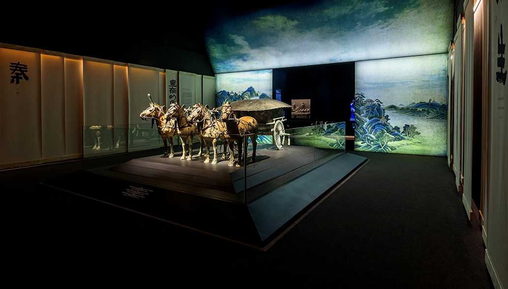 Sala 2 – «El Emperador Qin»: Un espacio simétrico con falsos techos en madera evoca la estabilidad de la China unificada. Video mapping ilustra la pigmentación original de los guerreros de terracota, mientras caligrafía en telas y materiales nobles refuerzan la monumentalidad imperial.
