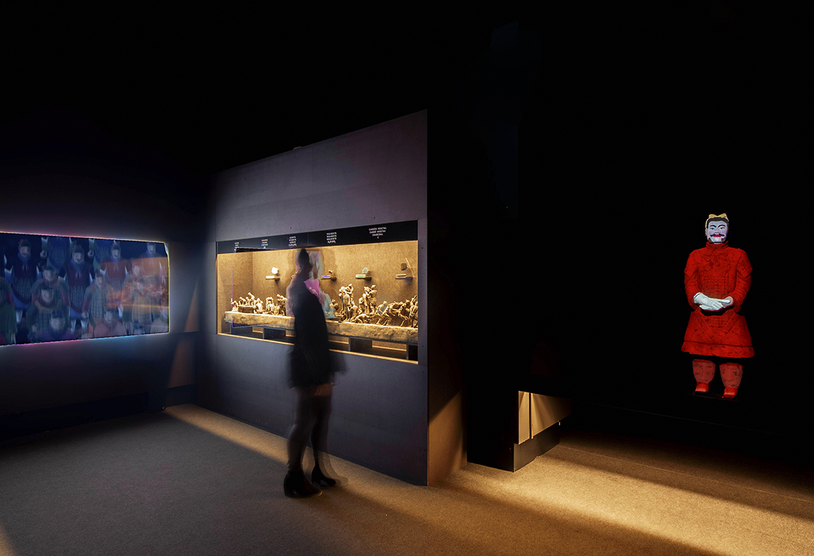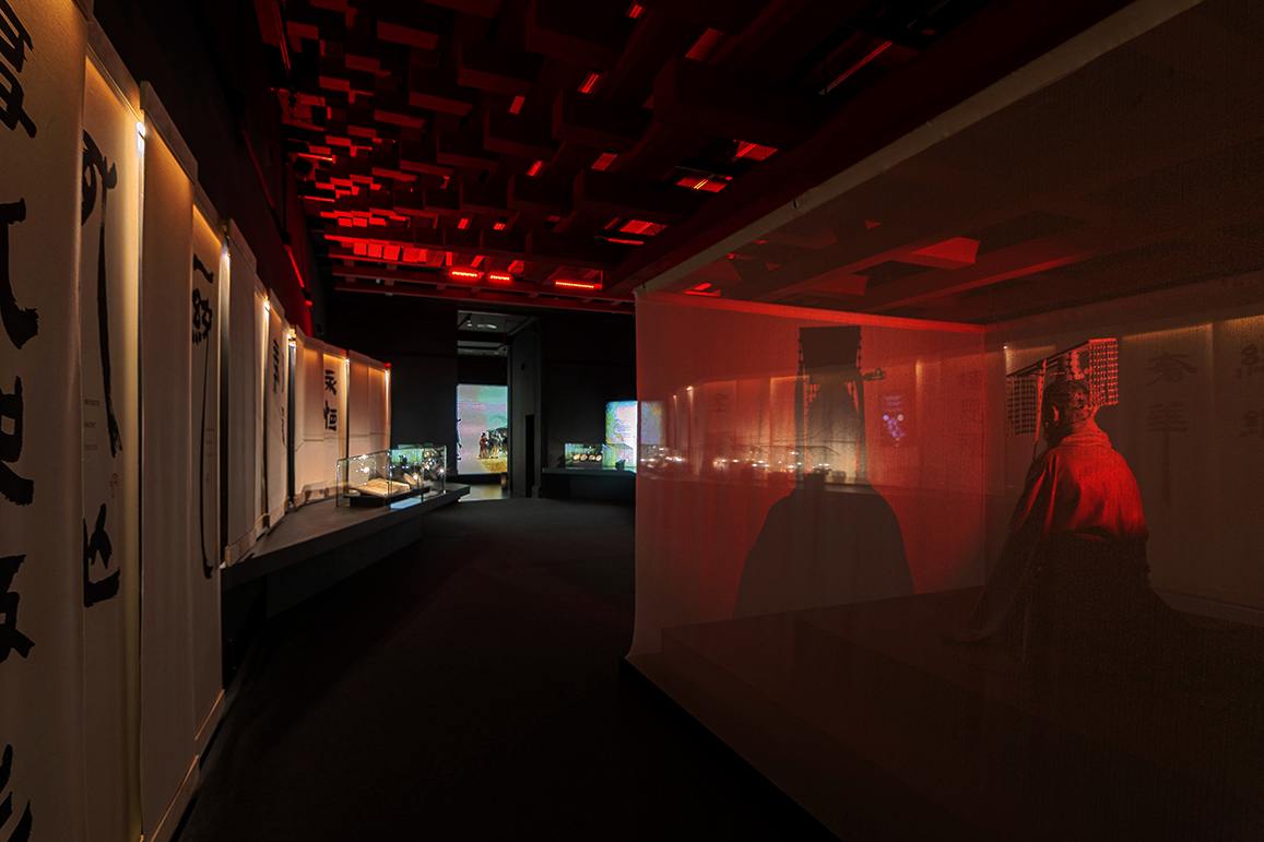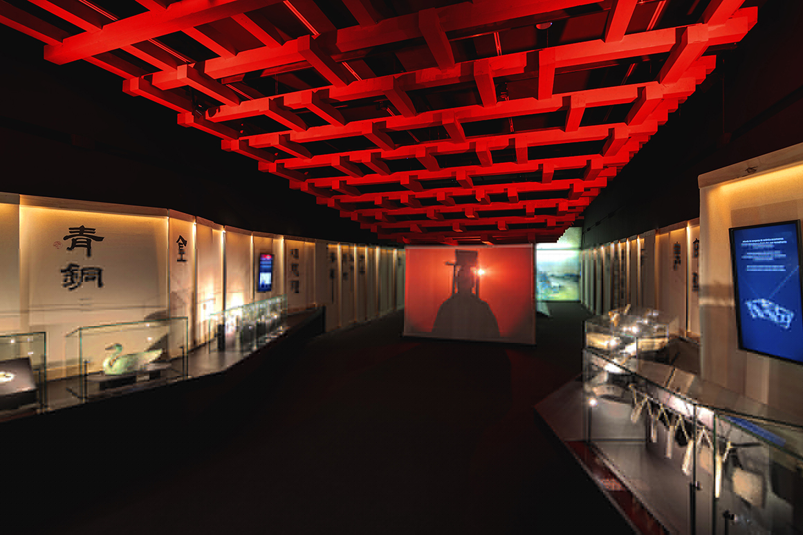 Sala 1 – «La Guerra»: Un falso techo de farolillos negros en movimiento simula un océano turbulento, reflejando la inestabilidad previa a la unificación de China. Una escultura del emperador Qin tras una tela translúcida refuerza el dramatismo con iluminación en tonos rojos.
