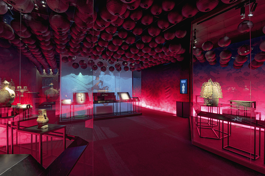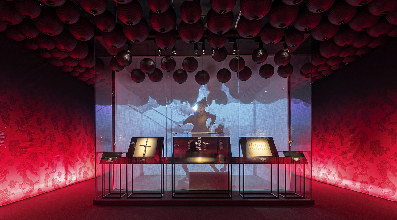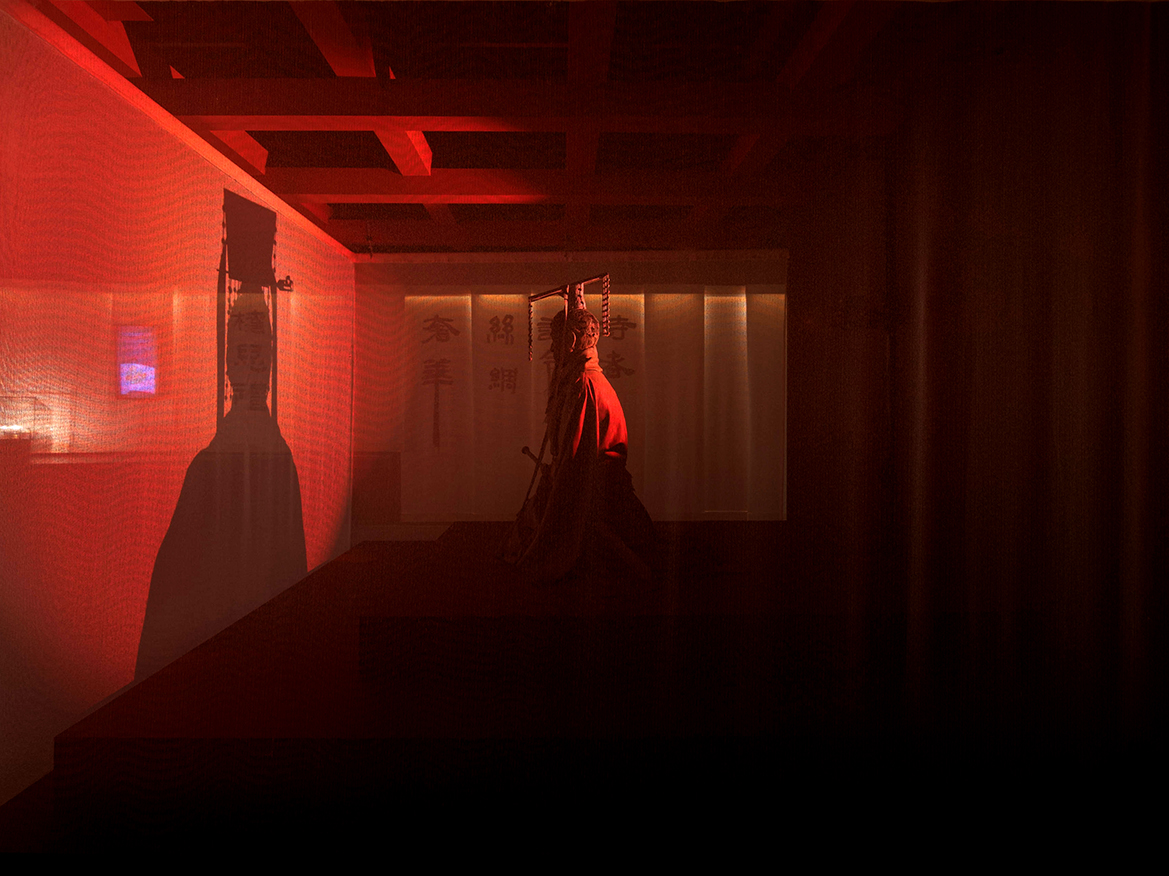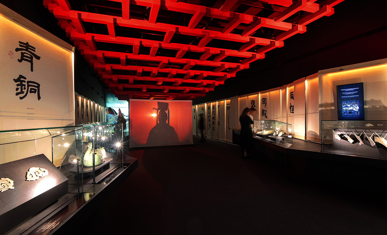 Sala 1 – «La Guerra»: Un falso techo de farolillos negros en movimiento simula un océano turbulento, reflejando la inestabilidad previa a la unificación de China. Una escultura del emperador Qin tras una tela translúcida refuerza el dramatismo con iluminación en tonos rojos.